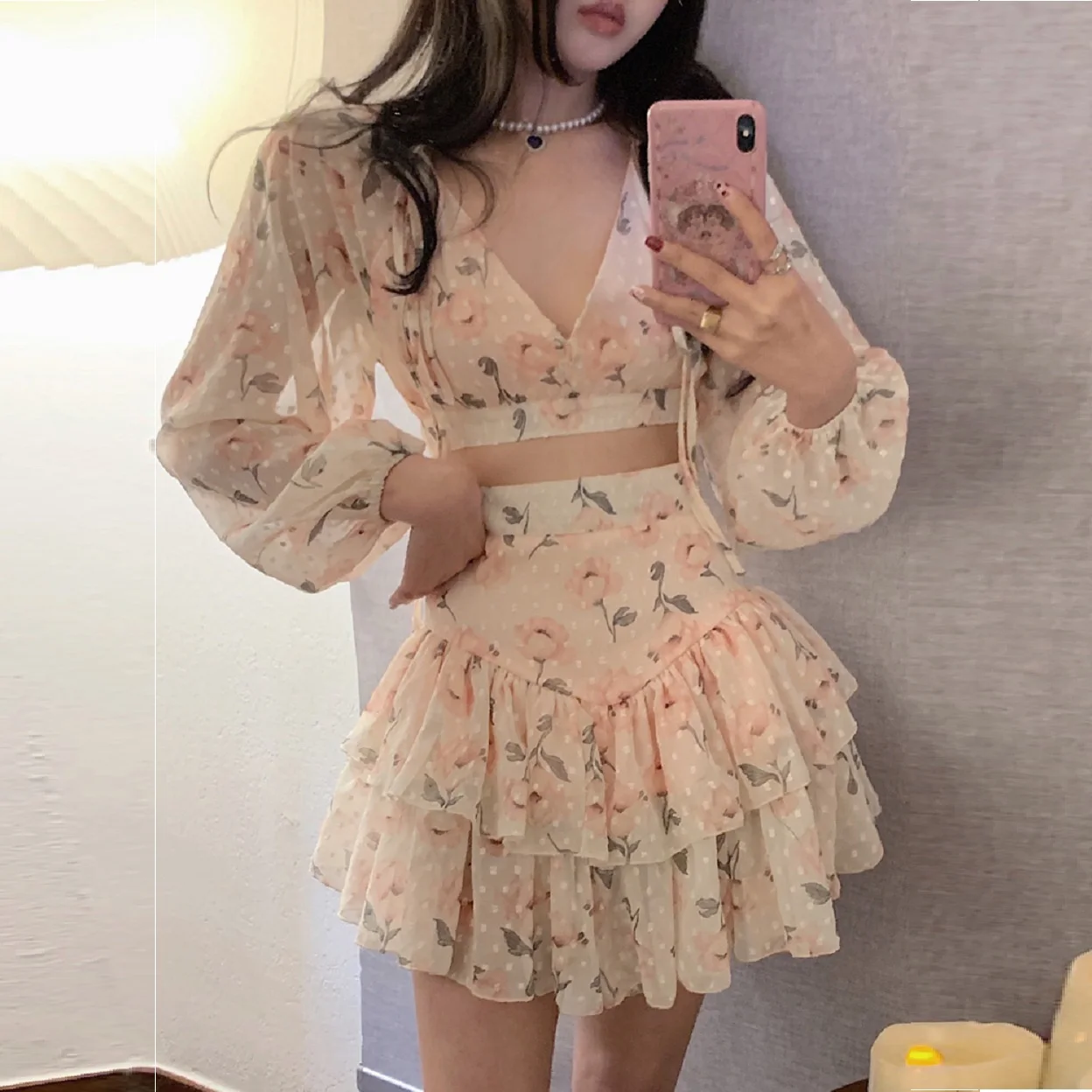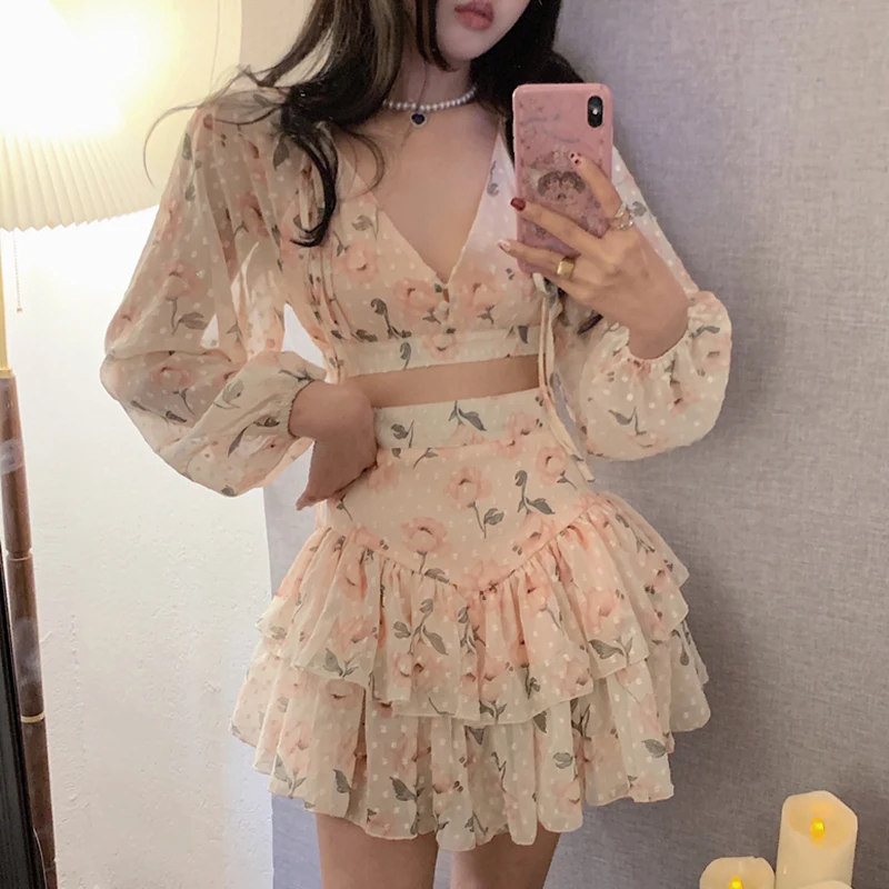 Летний комплект из 2 предметов, шифоновая пляжная одежда, привлекательный укороченный топ, комплект из двух предметов, женская одежда, наряд для отпуска для женщин, мини-юбка 2024