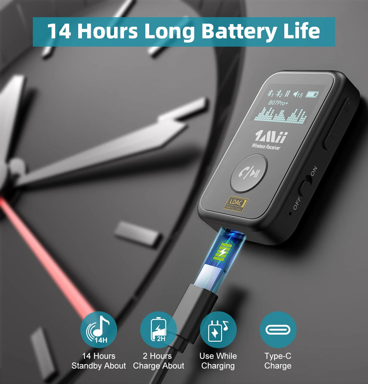 Адаптер Bluetooth небольшой, легкий и удобный для переноски, обеспечивает до 14 часов непрерывной потоковой передачи музыки, радио, GPS или телефонных звонков. Полная зарядка устройства с помощью кабеля для быстрой зарядки Type-C занимает всего 2 часа. Если адаптер не будет сопряжен с устройством в течение 10 минут, он автоматически выключится. В этом чехол вам нужно перезагрузить адаптер Bluetooth, чтобы использовать его снова.
