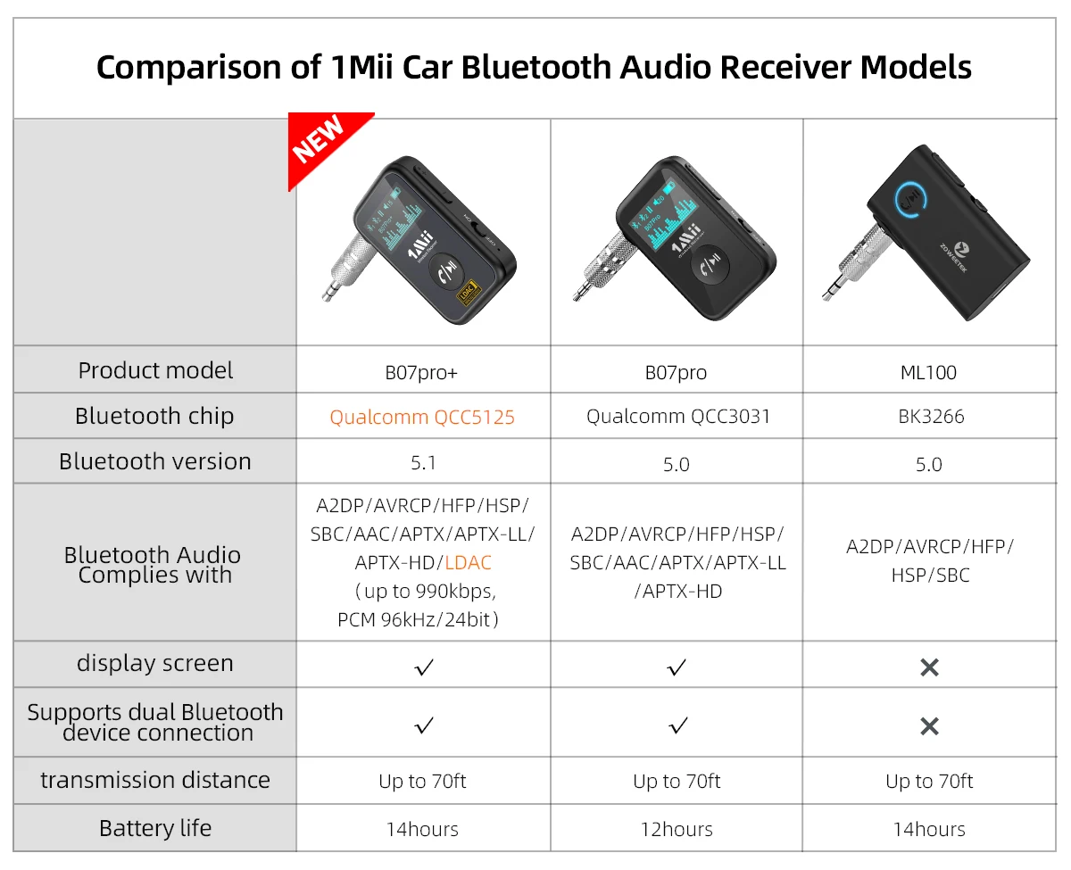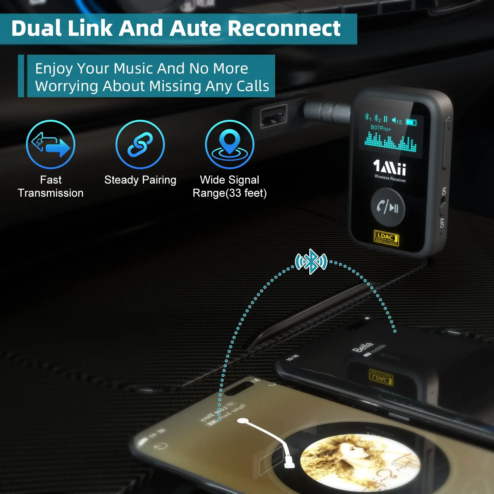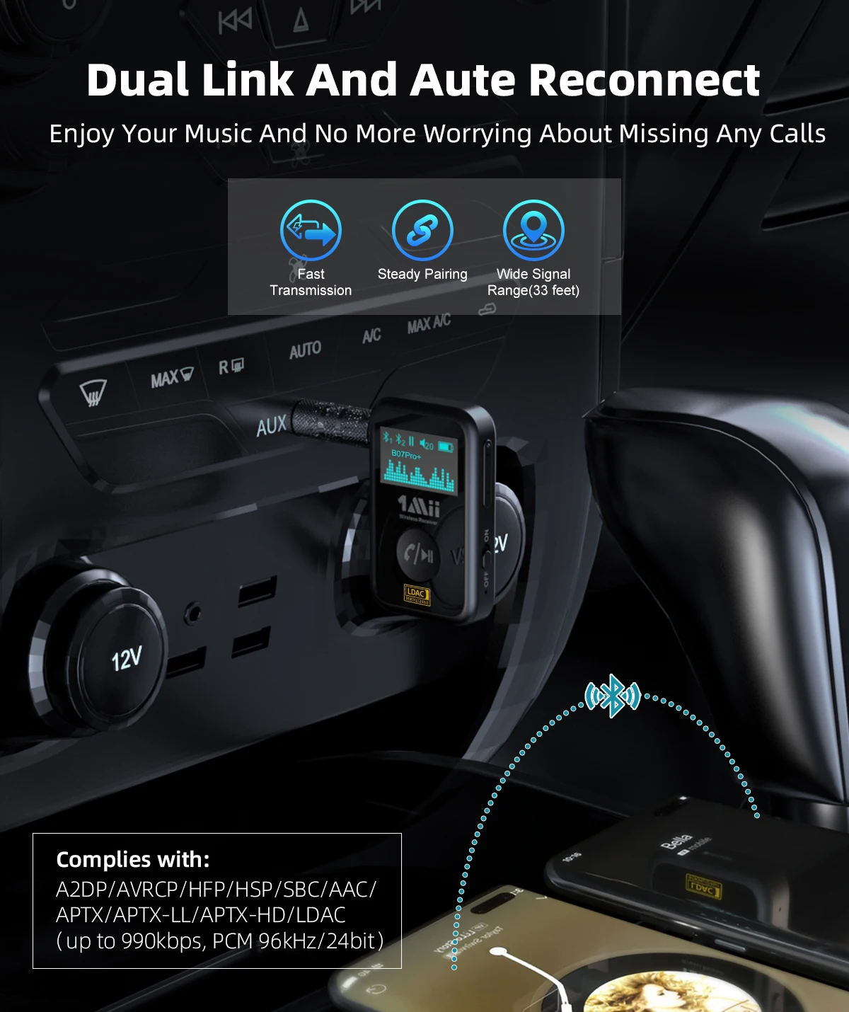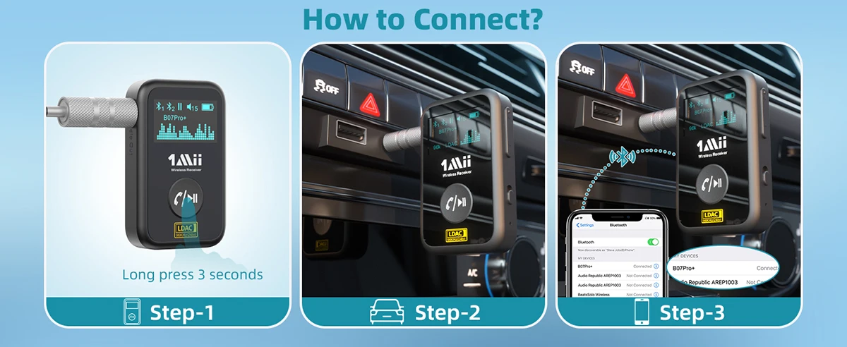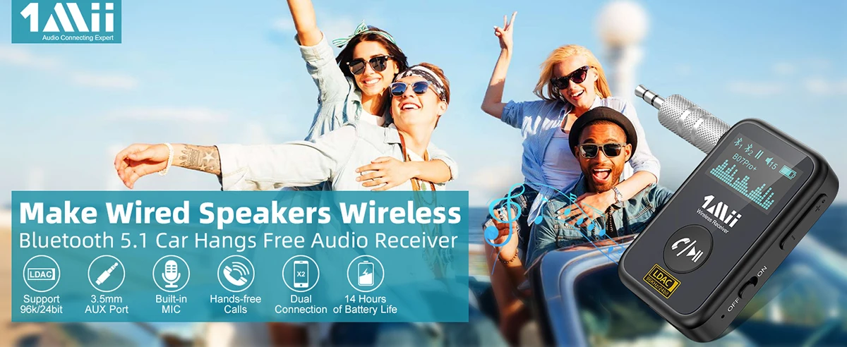 1Mii Bluetooth-Приемник оснащен новейшей технологией Bluetooth 5,1, обеспечивающей более стабильное соединение, более быструю передачу и меньшие потери качества звука при более низком энергопотреблении по сравнению с Bluetooth 5,0. После сопряжения Автомобильный приемник автоматически переподключится к последним сопряженным устройствам Bluetooth