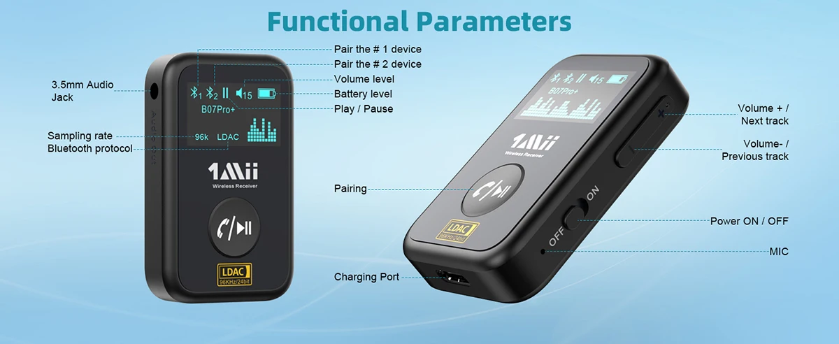 Bluetooth-приемник 1Mii для домашней стереосистемы разработан с кнопками для удобного управления. Нажатием кнопок вы можете воспроизводить/приостанавливать музыку, принимать звонки и регулировать громкость музыки. Вы также можете долго нажимать кнопку громкости «+» или «-» около 1,5 секунд, чтобы легко переключаться между следующей/предыдущей песней. Bluetooth-приемник может соединяться с двумя устройствами одновременно, что позволяет легко переключать музыку, не отключая Bluetooth.