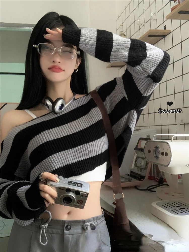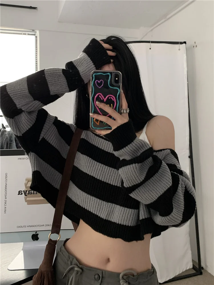 Женский свитер в полоску Hikigawa, Повседневный пуловер контрастных цветов с воротником-лодочкой и длинным рукавом, милые свободные универсальные джемперы