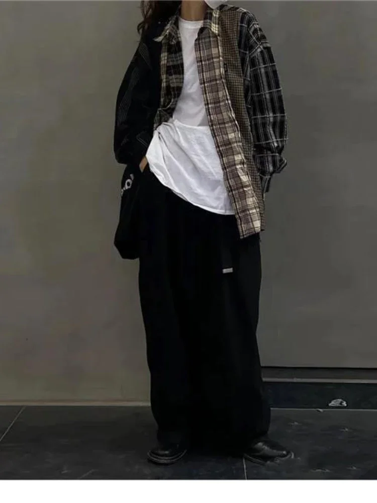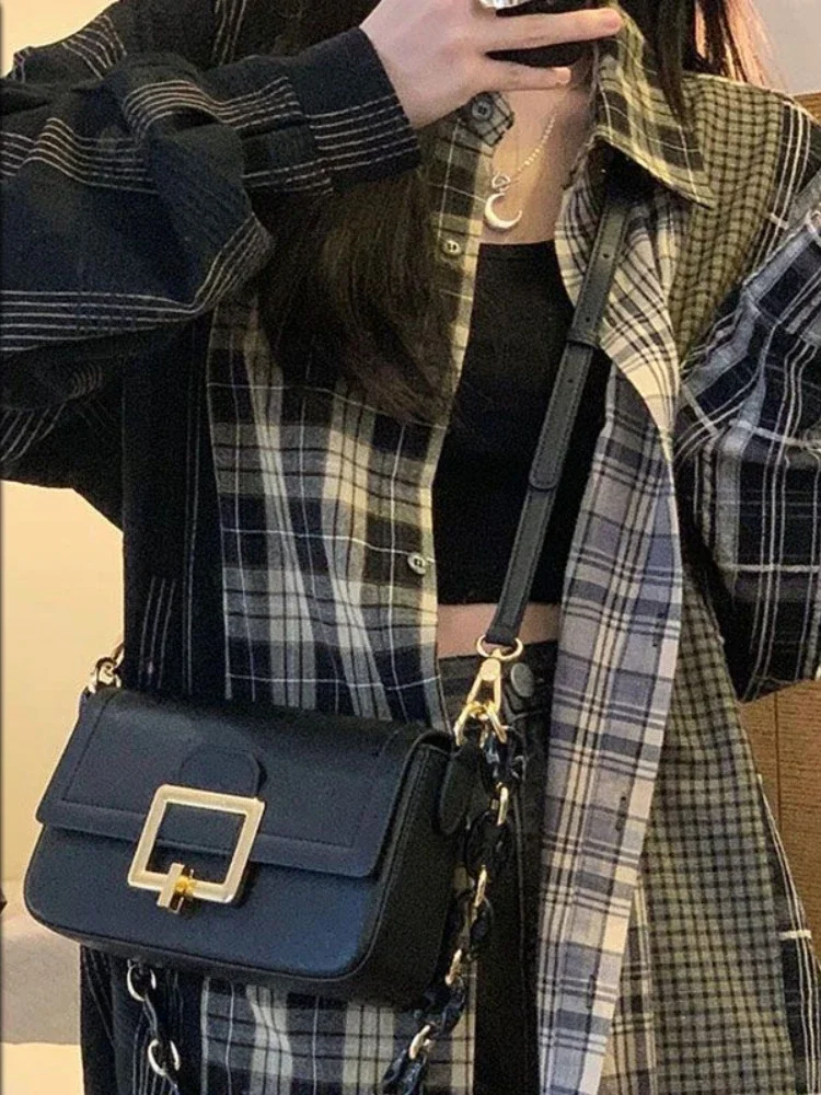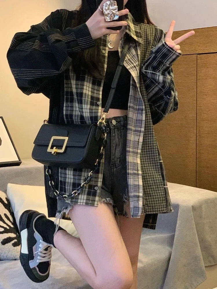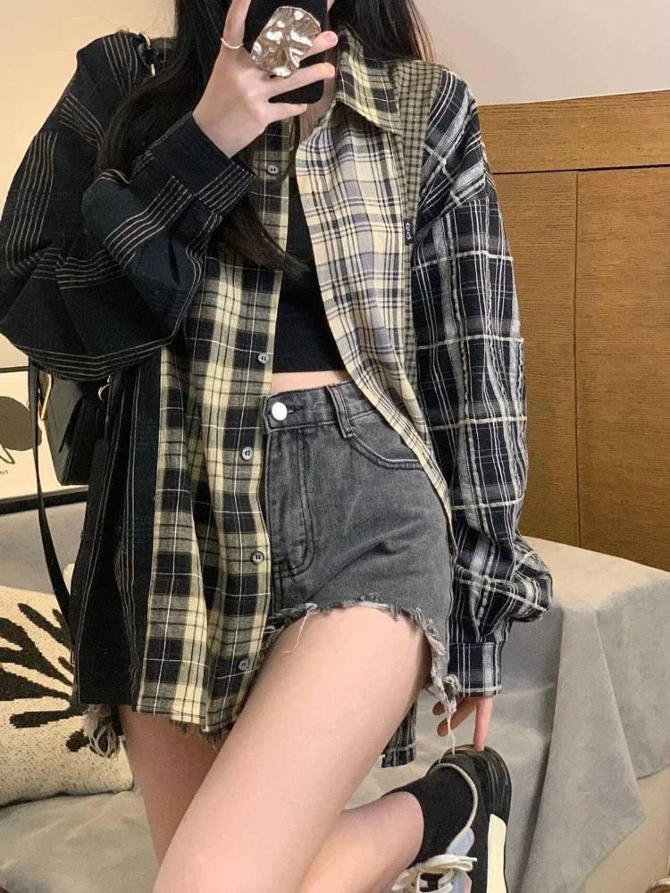 Блузка женская клетчатая с отложным воротником и длинным рукавом, в стиле Харадзюку