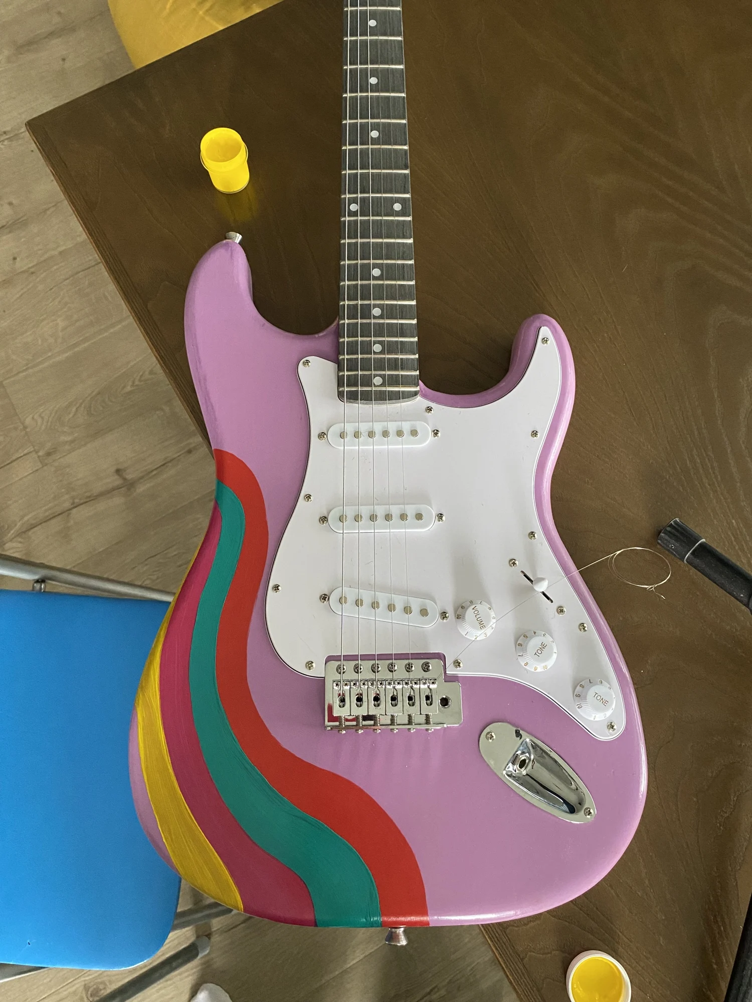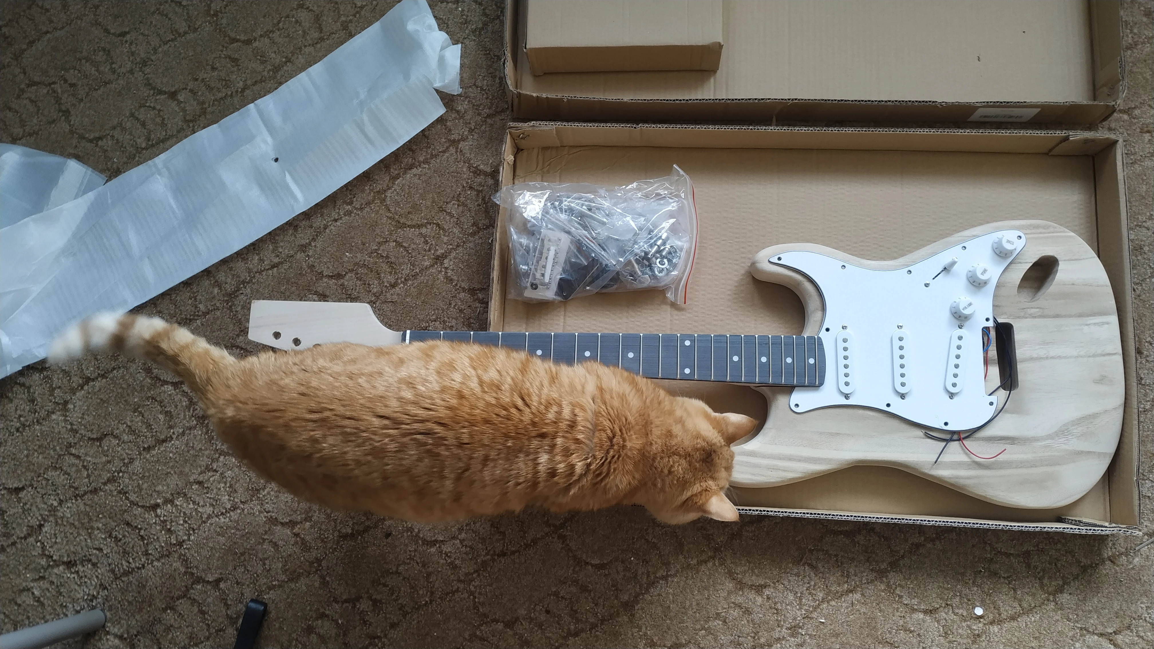 Пришёл конструктор всего за 3 дня. Качество оказалось намного лучше, чем ожидал. В корпусе был только один кривой спил, нет ни одной трещины. Покрыл весь корпус шпатлёвкой и грунтом. Шпатлёвку выравнивал 320 зерном. Покрасил всё баллончиками в стиле «анархо-абстракционизм», затем покрыл лаком (с потёками, ну и похуй). Гриф после подкрутки анкера идеально ровный. Обратную сторону отшлифовал 2500 зерном и покрыл лаком. Колки сначала хрустели, но после нескольких оборотов перестали. Струны говно, особенно 6-я — высит и мензура до идеала не отстраивается, но других пока нет. Однозначно рекомендую панкам и прочим фанатам DIY с руками не из жопы, шарящим в гитарах. Материалов было потрачено на 500-600 рублей, зато получилась уникальная гитара. Необходимые доработки: шпатлёвка деки, чтоб она не царапалась ногтями; шлифовка и покрытие лаком/краской грифа (иначе будет становиться шершавым от пота), шлифовка краёв ладов, экранировка электроники. После всех 5-дневных доработок получился прекрасный инструмент, звучащий намного лучше своих 5к. Надпись на коробке «building guitar easily», конечно, не соответствует реальности, так как из этого хорошую гитару без нужных навыков собрать невозможно.