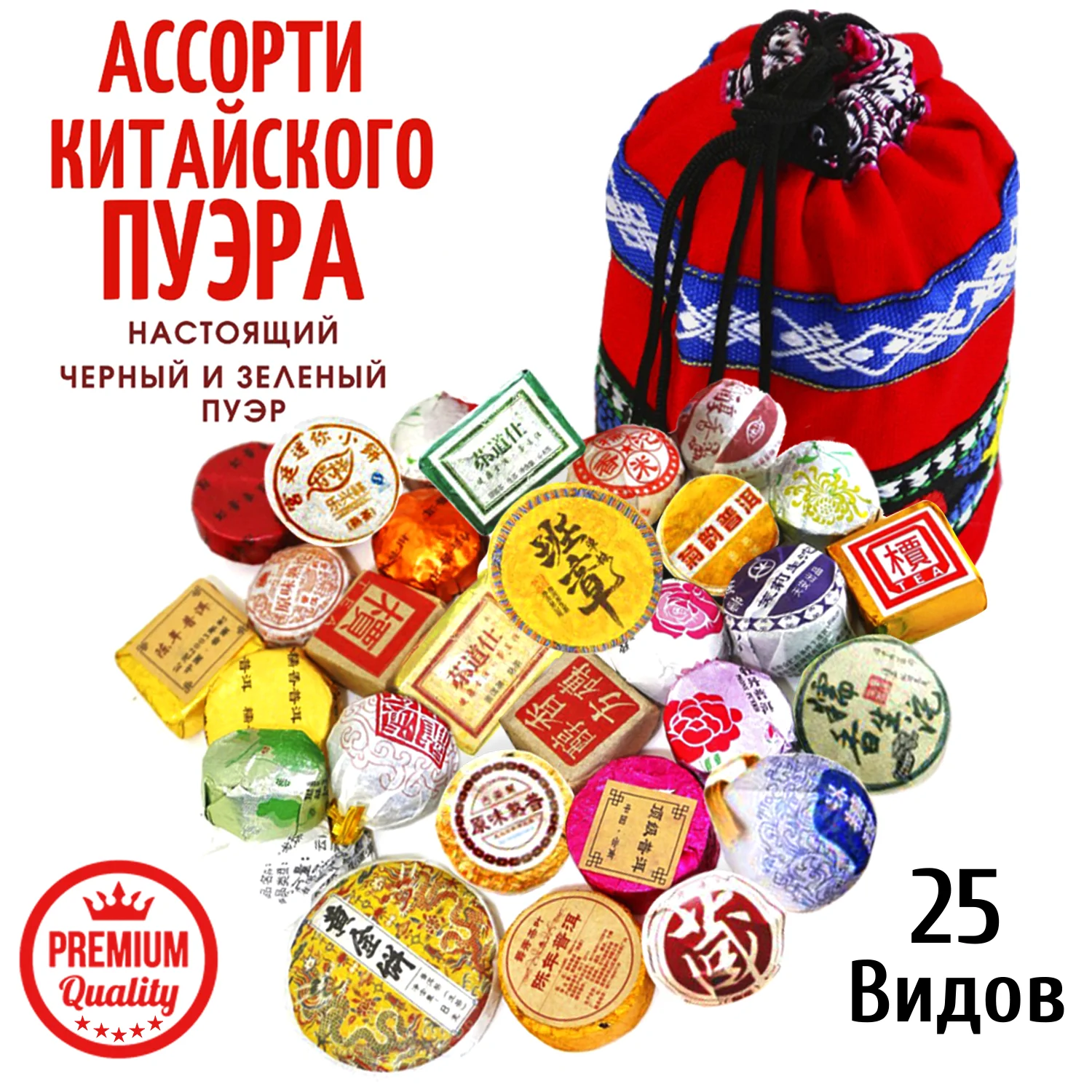 Китайский Чай Пуэр Прессованный, Ассорти черного и зеленого Шу пуэр Шен пуэр в мешочке 165 гр. / 25 шт. подарочный набор чая