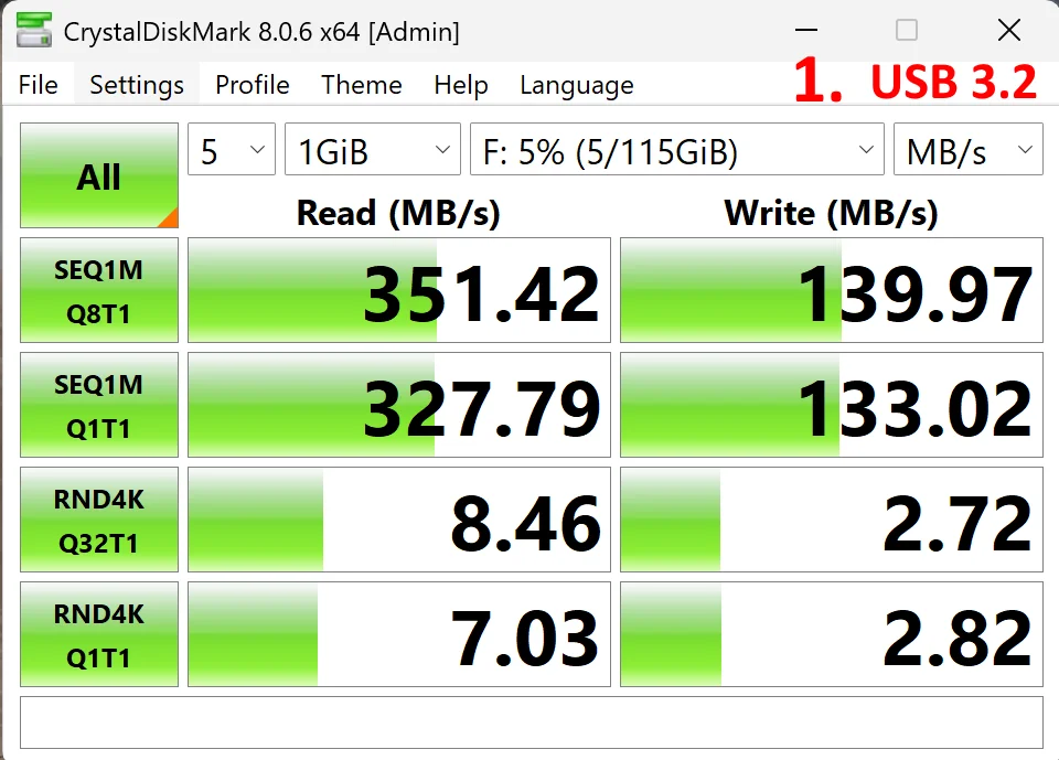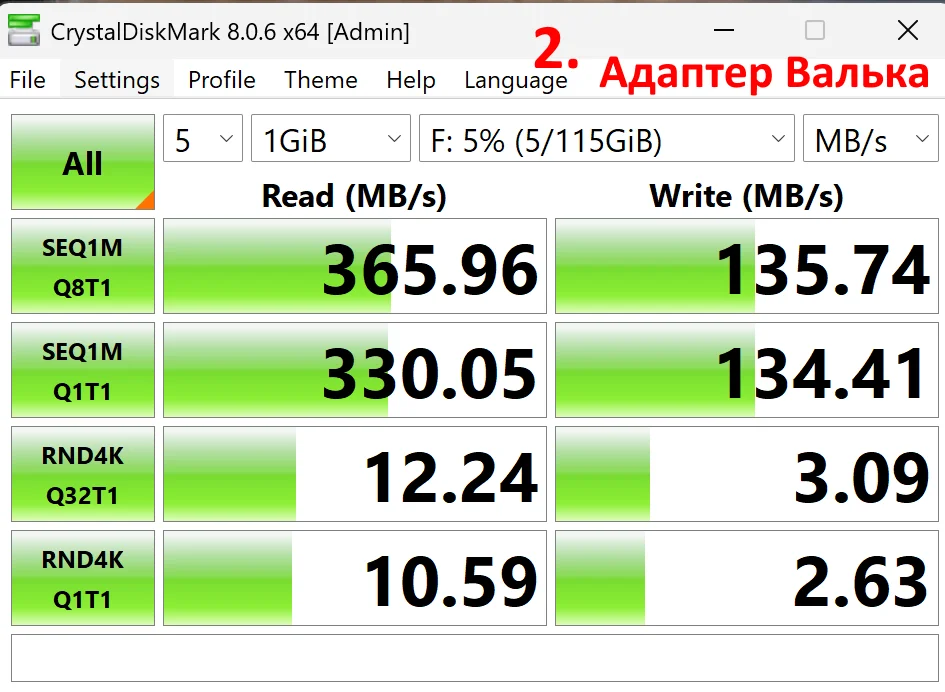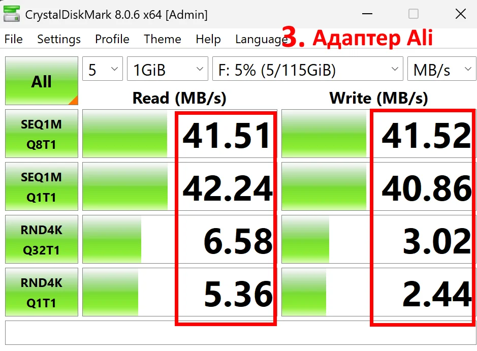 Адаптер - полная печаль! Это USB 2.0 Тестировал на ноуnбуке Xiaomi, где порты USB 3.2 Смотри фото! 1 - реальный тест без адаптера, 2 - тест с адаптером с Валбериса, 3 - тест с адаптером с Ali!!!