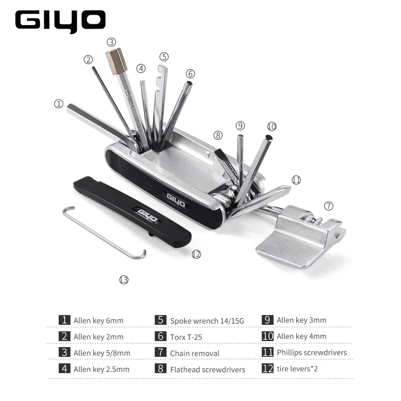 Giyo 12 в 1, набор инструментов для ремонта велосипеда, портативный MTB велосипед, мини-велосипедный многофункциональный инструмент, отвертки с шестигранными спицами, рычаг для шин, шестигранный ключ