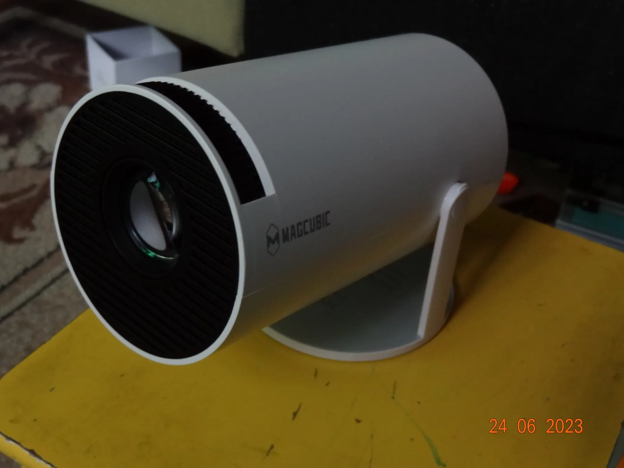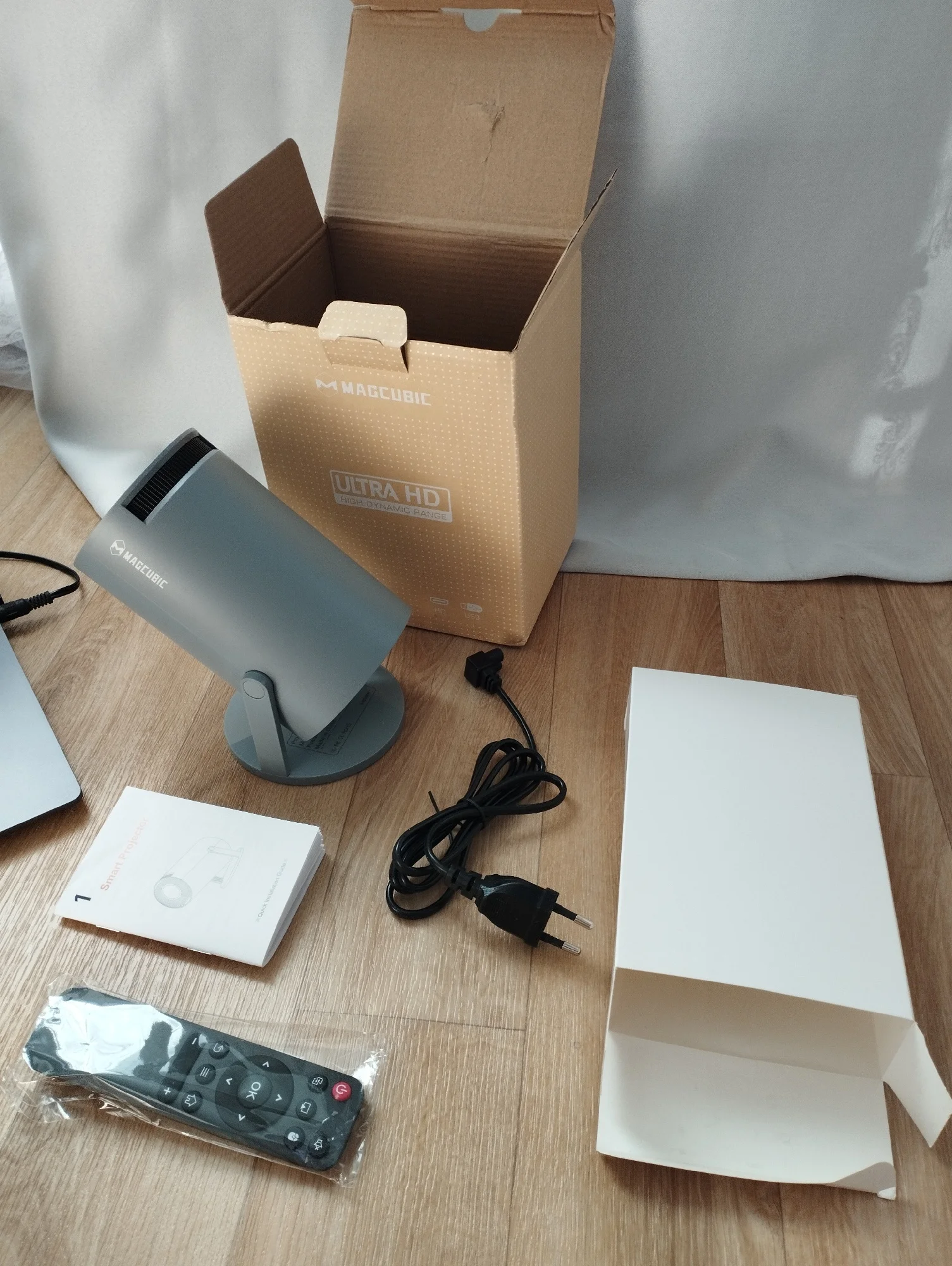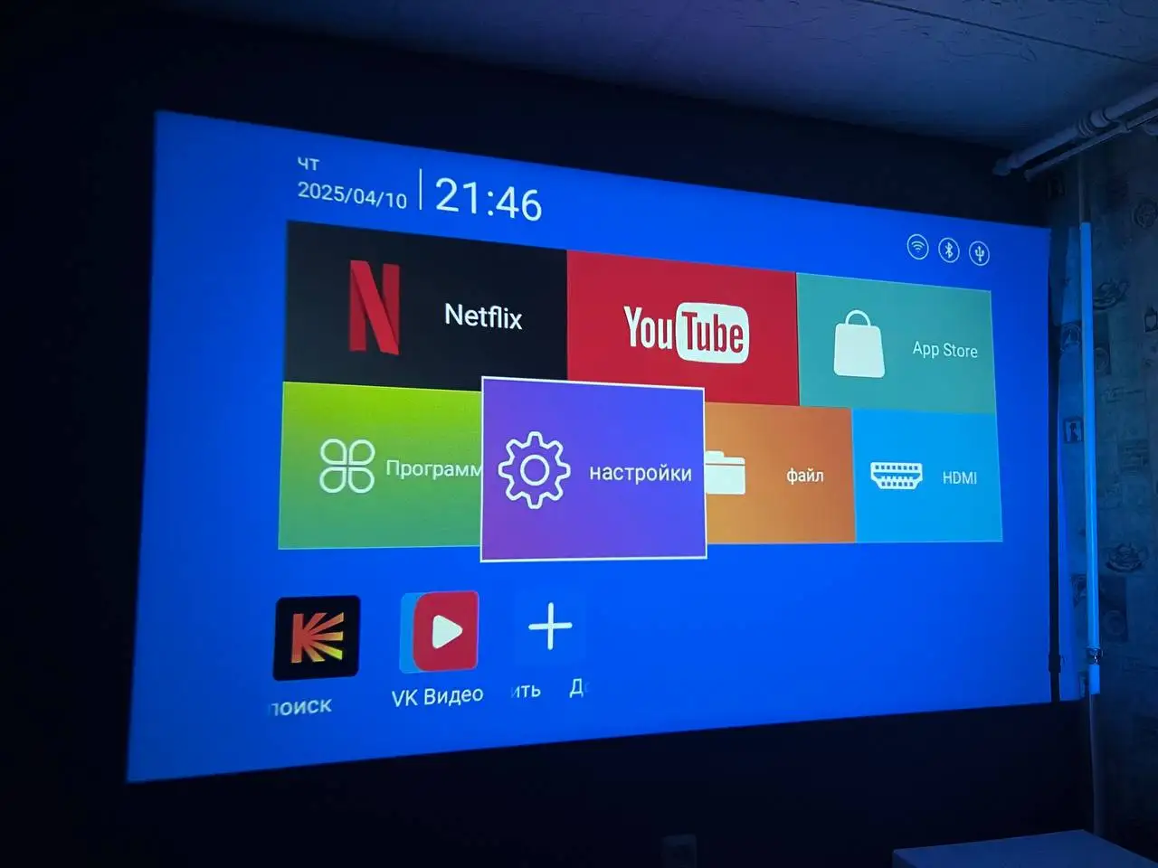 Проектор приобретал для переносов эскизов на стены, как рабочую лошадку. Компактный, удобный в транспортировке. Но по итогу по вечерам я смотрю через него всё, что можно. ) Удобно, скачал приложения какие хочешь и кайфуешь. Качество вообще хорошее! По-моему, лучше школьных больших кирпичей, ахахаха. (Есть размыливание по углам, но это никак не мешает просмотру.) Звук пойдет громко, всё слышно достаточно, ну, понятное дело, не какой-нибудь JBL. ) Конектится с Алисой. Подключал музыкальную аппаратуру через аукс, вообще четко. HDMI к ноутбуку — всё работает! (Даже играл в CS2, ахах, но есть задержка. Так, чисто на фон, ахахах.) Wi-Fi конектится. Подключал двойной экран с телефоном. (Картинка есть, звук идет, но пикселит отрывками, да, я думаю, эта функция мало кому нужна, смысла в ней не увидел, но работает.) Чуток бывает на доли секунды притормаживает менюшка, да фиг с ним. Пульт работает хорошо, вставил 2 батарейки мизинчиковые (их нет в комплекте). Днём, конечно, плохо видно, но ночью шикарно. Можно смотреть футбольчик. ) Проекция с 2 метров выходит примерно 2х3 метра, а если ещё дальше, то больше. Поделился с друзьями, теперь и они хотят себе такой же. ) Это реально подарок, находка! За такой ценник! Минусы разве что быстрая доставка. Доплатил за быструю доставку, думал, вотклассно, а смысла в ней нет. Два раза менялась ориентировочная дата. Заказывал в Свердловскую область 18 марта, забрал 9 апреля.