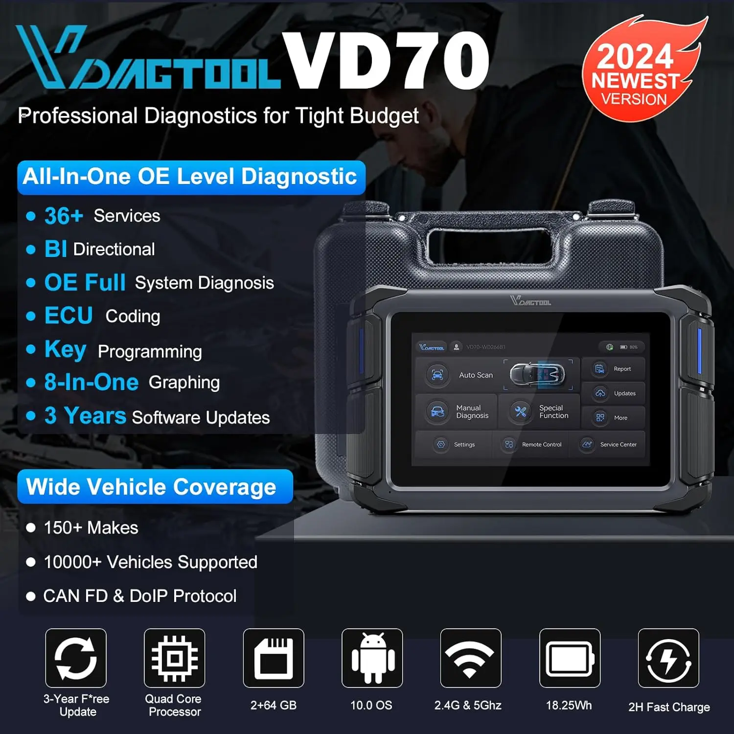 2024 VDIAGTOOL VD70 Автомобильные диагностические инструменты программатор ключей Автомобильный OBD2 сканер кодирование ECU CANFD DOIP 36 + сброс