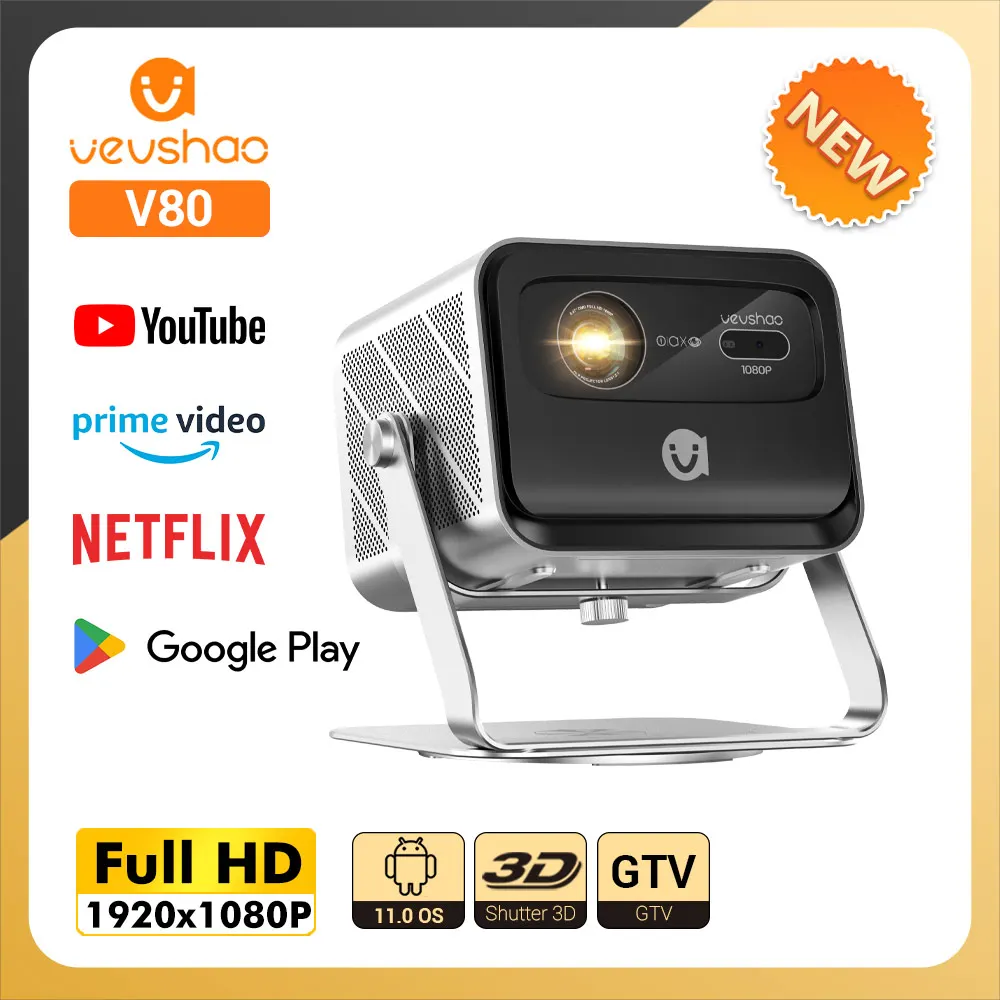 Проектор VEVSHAO V80 Full HD 1080P 2K 4K Видео Wi-Fi 6 Автофокус Android 11.0 Домашний кинотеатр Смарт-проектор с базовой подставкой