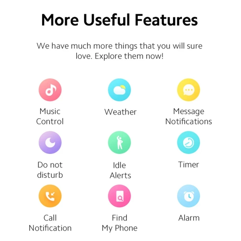 - Функции:Шагомер, Браслет для занятий спортом, Трекер сна, Приложение для отслеживания настроения, Напоминание сообщений, Напоминание о вызове, Часы-Будильник, week, Отображение месяцев, Пульсометр, Календарь, COMPASS