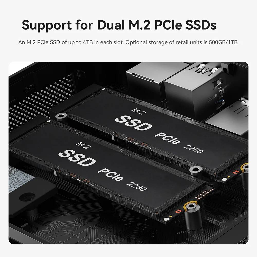 Варианты большой емкости и расширения Beelink SER5 Max имеет встроенную оперативную память LPDDR5 емкостью 32 ГБ.Micron LPDDR5 обеспечивает более высокую производительность и меньшее энергопотребление для поддержки стабильной работы приложений.Он также поставляется с 1 ТБ M.2 SSD PCle 2280, поддержка двухканального M.2 PCIe 4.От 0*4 до максимум 8 ТБ (2*4 ТБ, не входят в комплект).