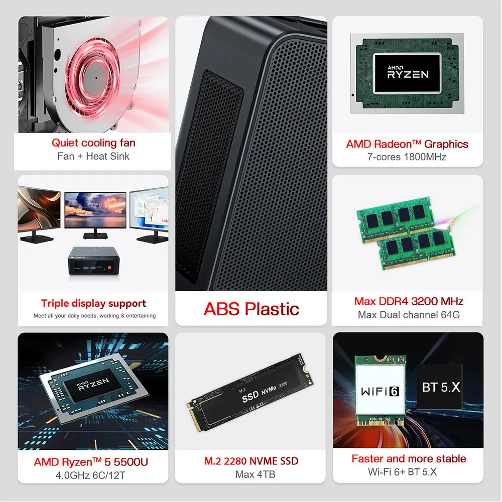 Эффективная система охлаждения и WIFI 6 Beelink SER5 Max оснащен радиатором + охлаждающим вентилятором, использующим новейшую технологию MSC для ускорения воздушного потока и обеспечения эффективного охлаждения оперативной памяти и твердотельного накопителя.Оснащен Wi-Fi 6, который в три раза быстрее, чем Wi-Fi 5, он также имеет более низкую задержку Bluetooth 5.2 и локальные сети 1000 Мбит/с позволяют наслаждаться более высокой скоростью передачи данных и легко подключать беспроводные устройства.
