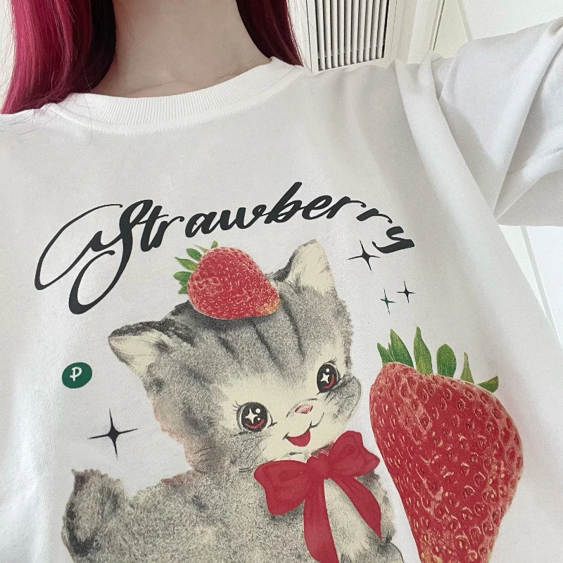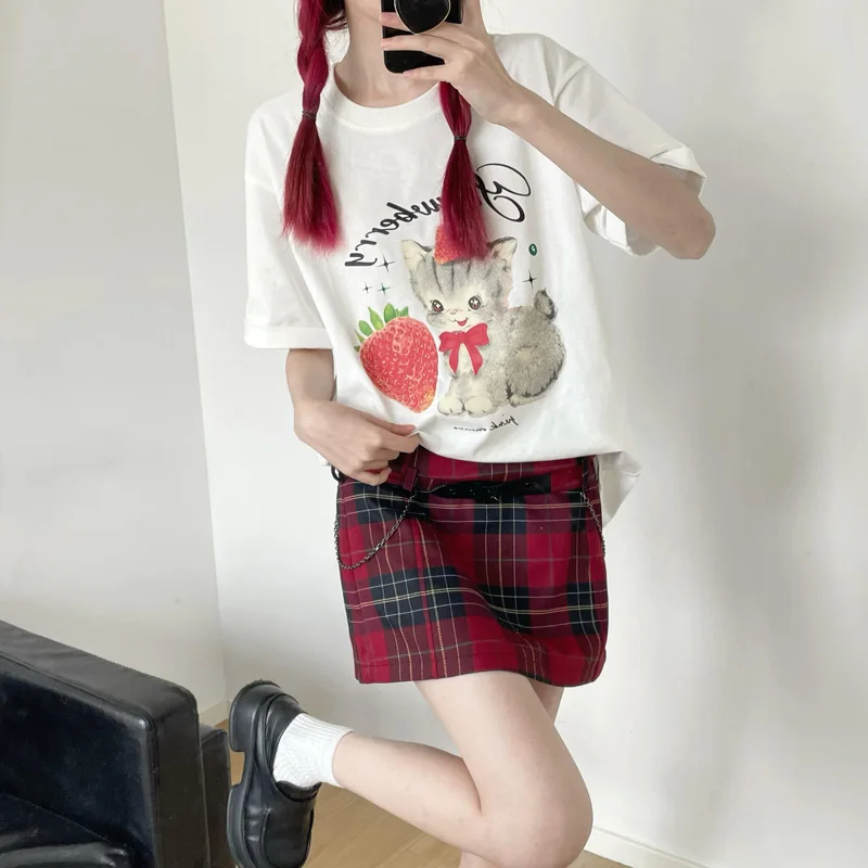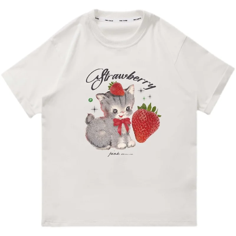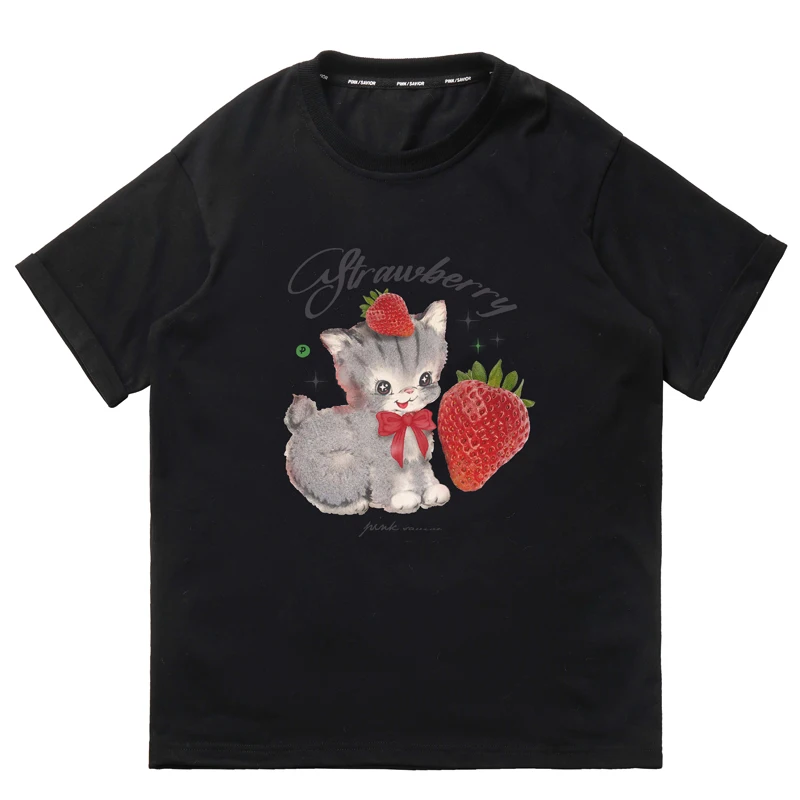 Летняя футболка с рисунком клубничного кота, женская футболка 2023 Kawaii Graphic, женские хлопковые мягкие топы, одежда в стиле Харадзюку Y2k, черно-белая