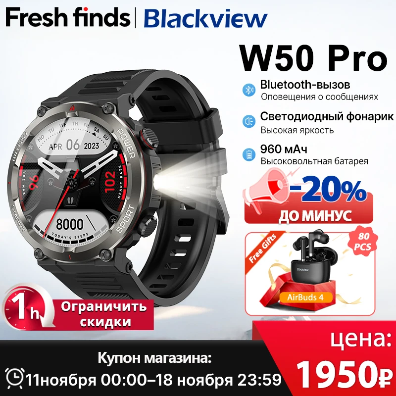 Новинка, защищенные смарт-часы Blackview W50 Pro. С фонариком! На Часе выгоды за 1955 руб!