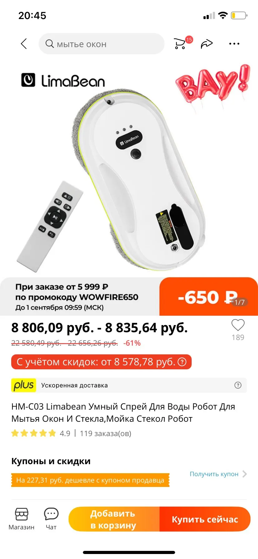 Это наверное лучшая моя покупка за этот год. Балкон теперь в идеальном состоянии. Сама бы я так в жизни не помыла. Посылка пришла за 3 дня в Пензу курьером. С продавцом я не общалась. В комплект входит сам робот с тросом, 14 тряпочек, пульт, 2 сменные насадки, пустая бутылочка для жидкости и книжечка с инструкцией на русском языке.Кому подойдёт данный робот. Подойдёт у кого нестандартное, большое остекление и нет возможности помыть стекло изнутри, подойдёт кто живет на высоких этажах, а так же пожилым людям. При эксплуатации у меня не возникло никаких сложностей. Первым этапом я запускала робот с сухими тряпочками что бы он убрал всю пыль, втрой этап запускала его с тряпочками на которые побрызгал средство для стёкол. Никаких разводов нет. Стекло 86х100 он проходит полностью за 5 минут 30 сек. Да не промывает углы, я это знала и это не так важно для меня, вытерпеть чуть грязный уголок ещё можно, а вот вид грязных окон нет. В общем советую.Valeriia S. 19 августа 2021