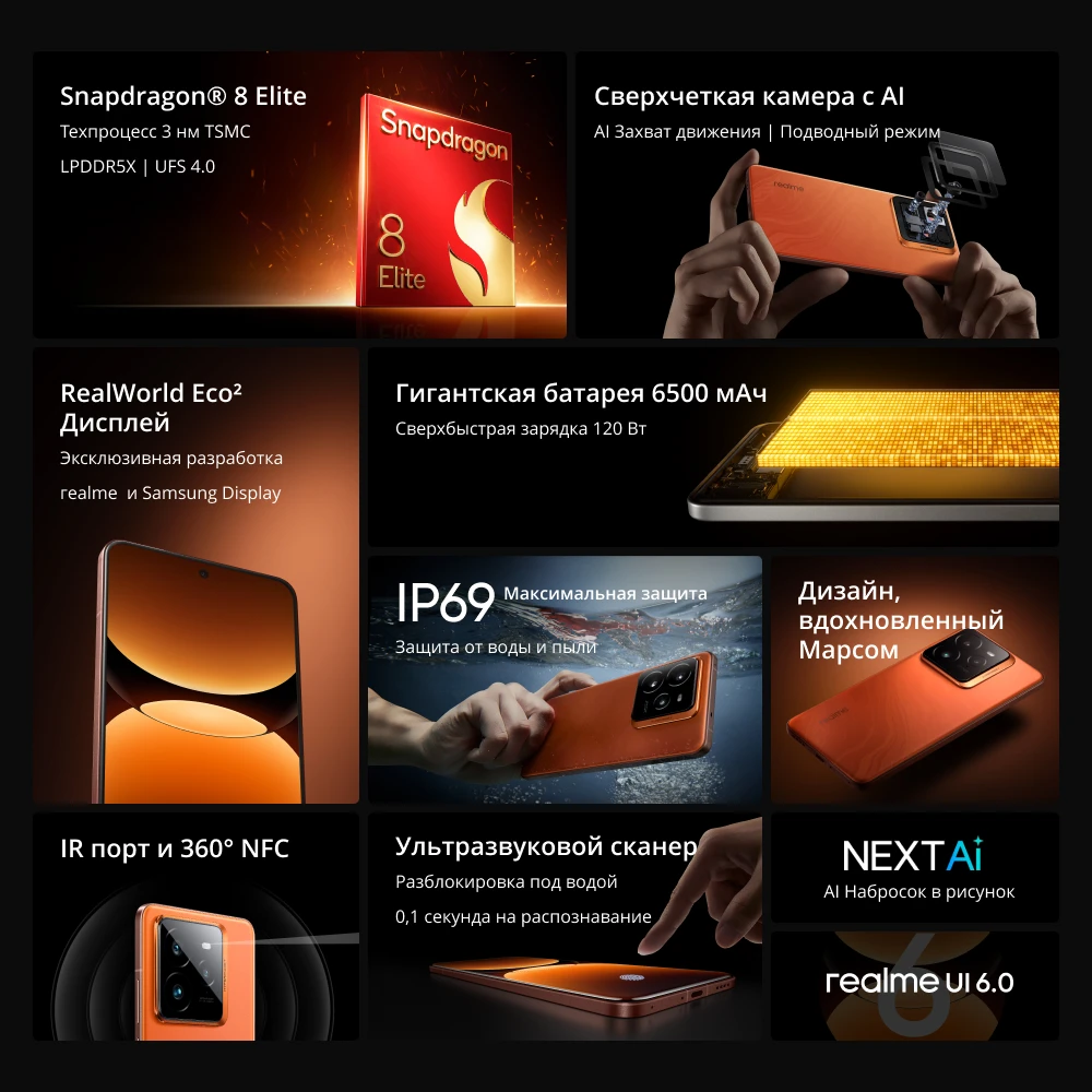 Realme GT7 Pro Смартфон Snapdragon® 8 Elite Чипсет 120 Гц Eco² изогнутый дисплей батарея 6500 мАч Titan 120 Вт SUPERVOOC зарядка Сверхчеткий фотокамера Sony с разрешением 50 Мп IP69 NFC