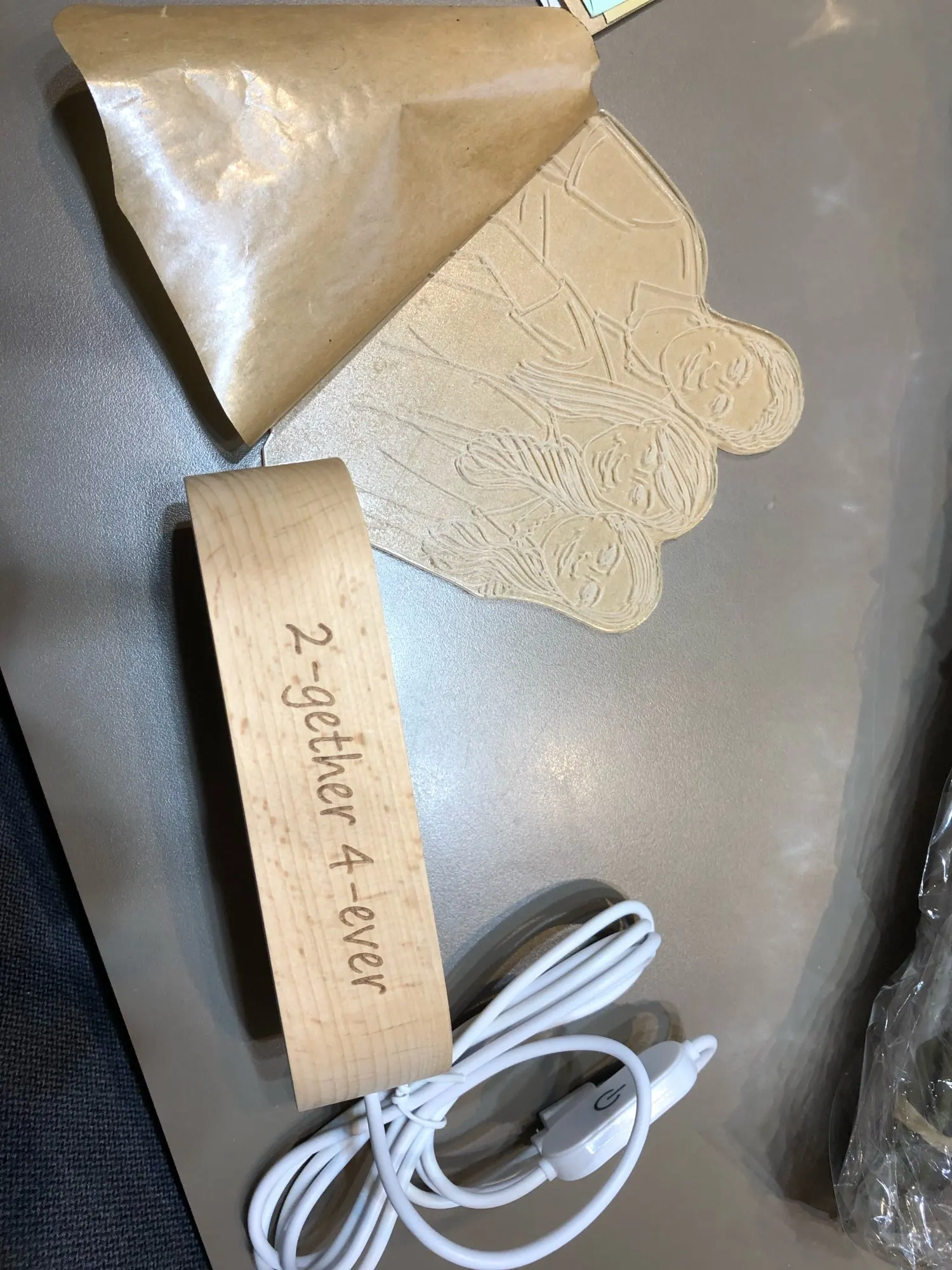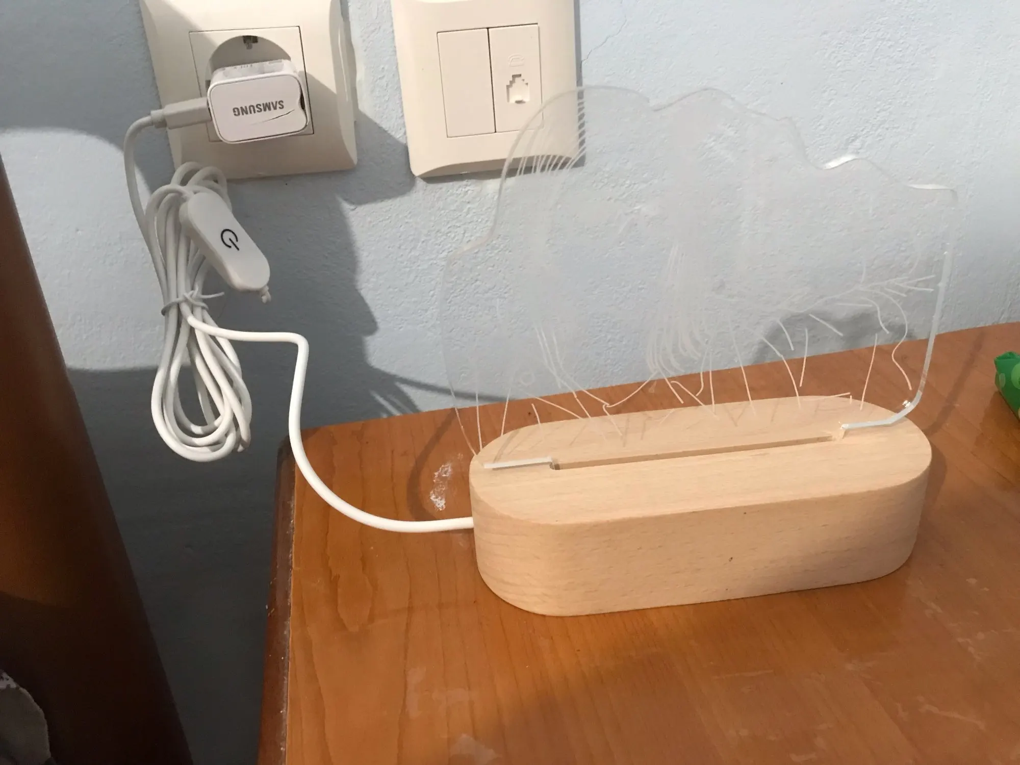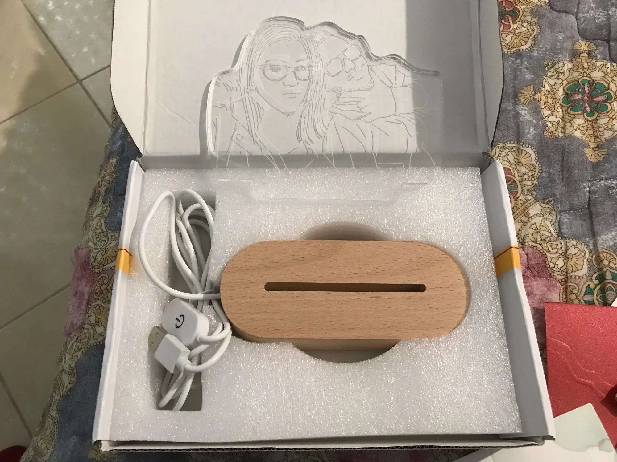 At first I did not trust much, but the communication with the seller was really good, I told him what I wanted, I sent him a photo and a few days later he sent me the sketch of how it would finally be. Very happy!!! Has met my expectations!! Recommended 100%. Has arrived in 1 week or so, bone that quite fast. It comes well sealed and with an envelope so you can put a dedication. It has 3 light positions, 2 white and yellow tones, and gives enough light. The cable is quite long and USB, yes, it does not come with the light charger, despite that very happy!!! I will ask again without a doubt