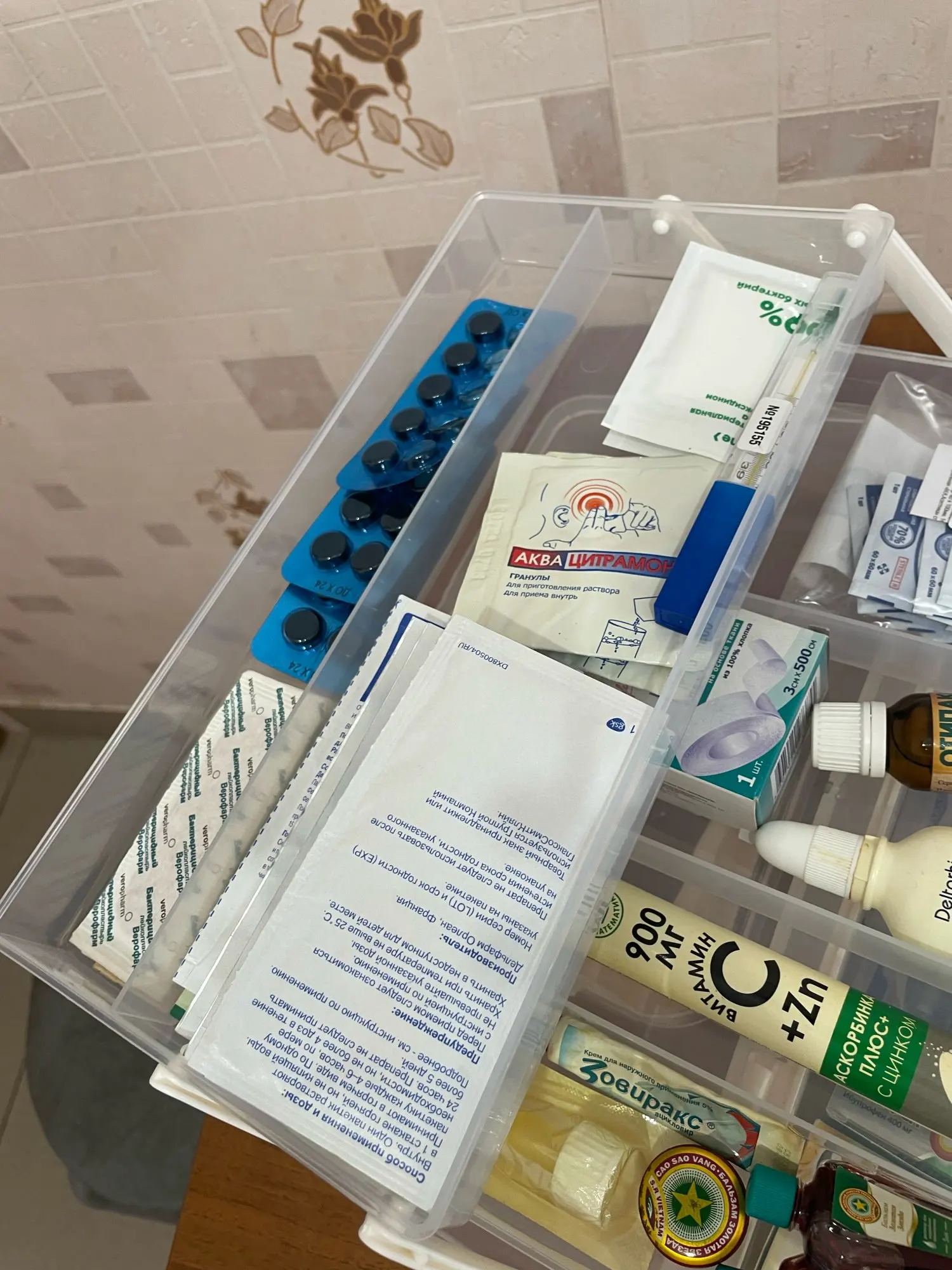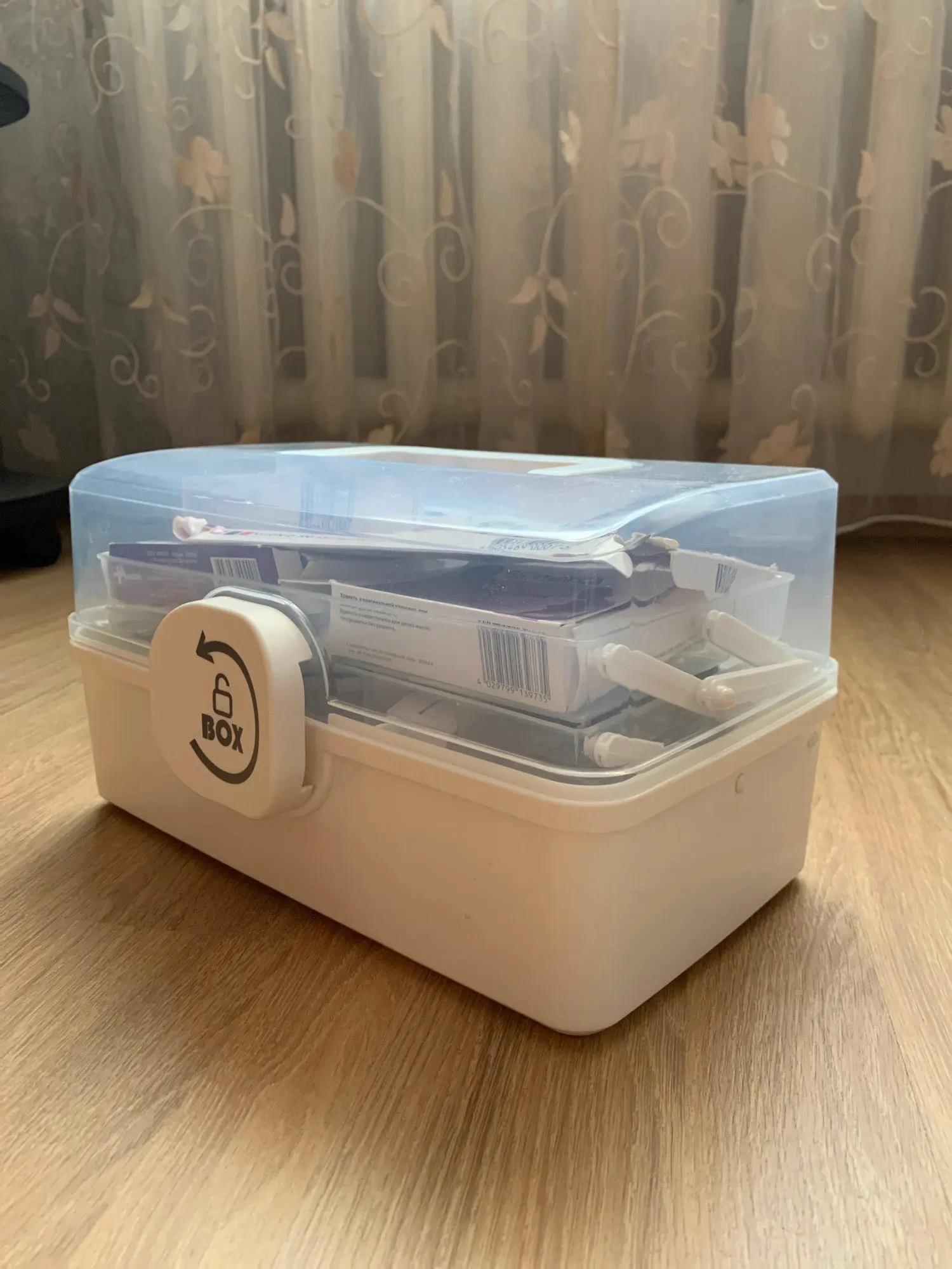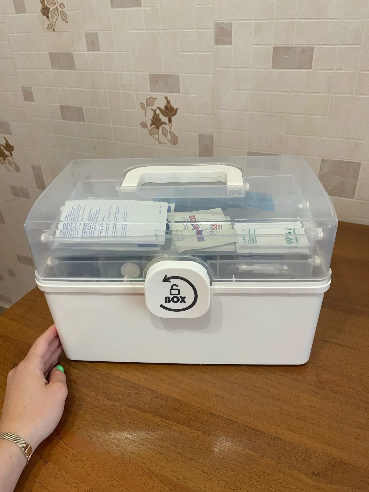 3. Портативная ручка: Эта дорожная аптечка имеет ручку на крышке для легкой транспортировки.