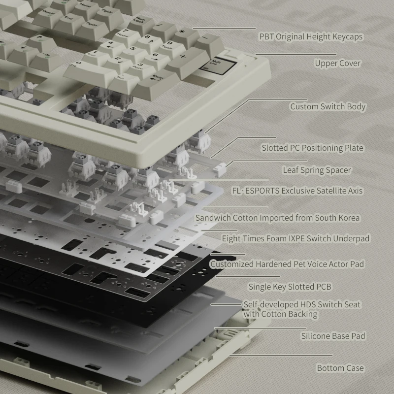 Щелевая пластина для позиционирования ПК + ПРОКЛАДКА с листовой пружиной в сочетании с многослойными слоями глушителя и печатной платой с прорезями уменьшают большое количество звука полости. Основной тон чистый, а консистенция на ощупь Высокая и мягкая, поэтому вы можете использовать его сразу же без лишней суеты.