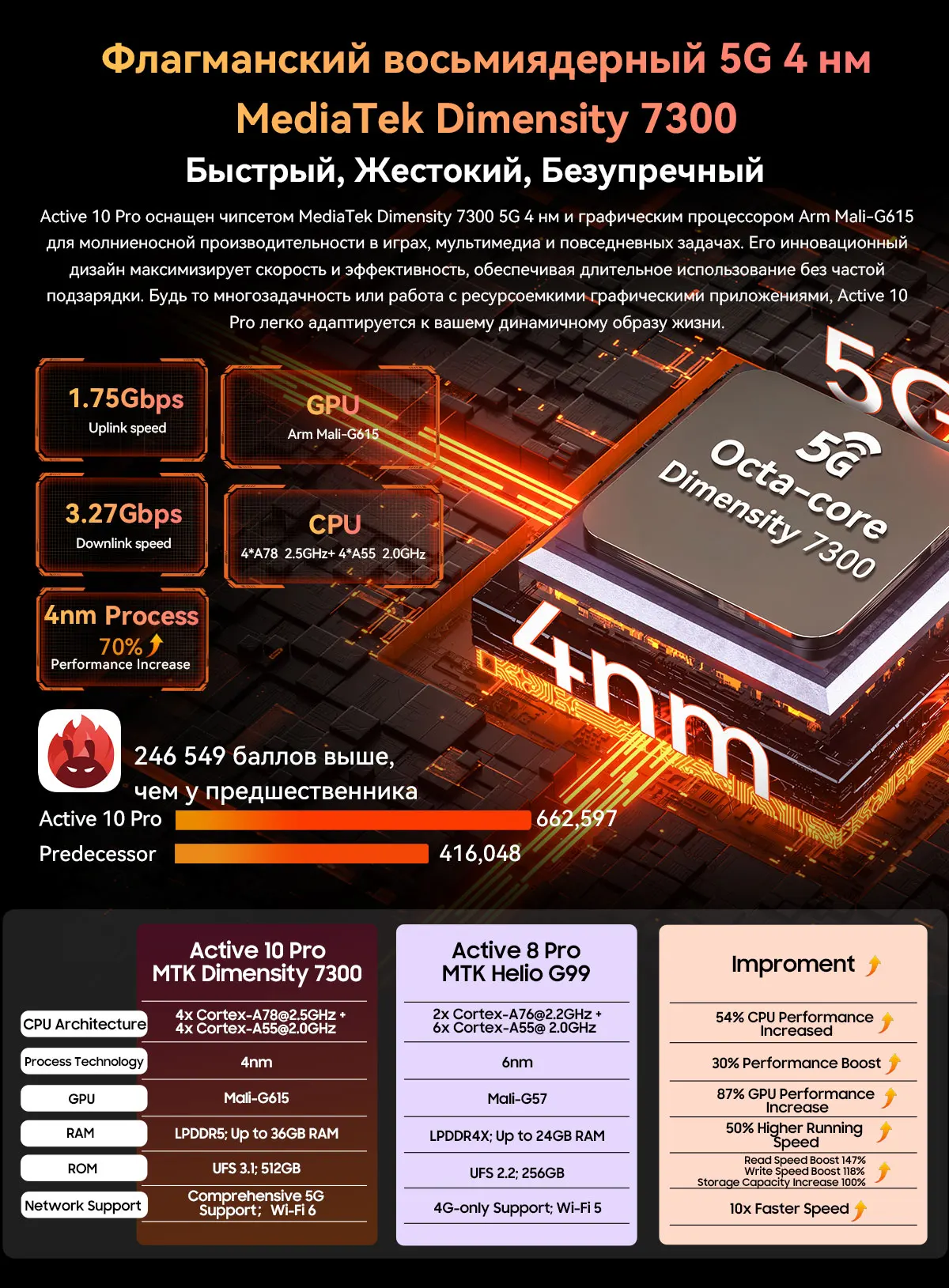 Процессор: MediaTek Dimensity 7300, Восьмиядерный, до 2,5 ГГц