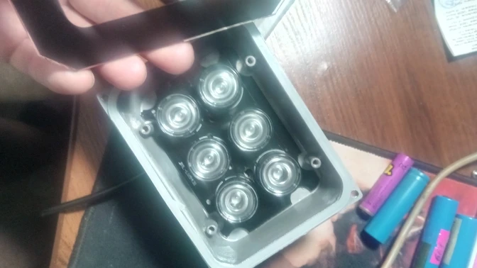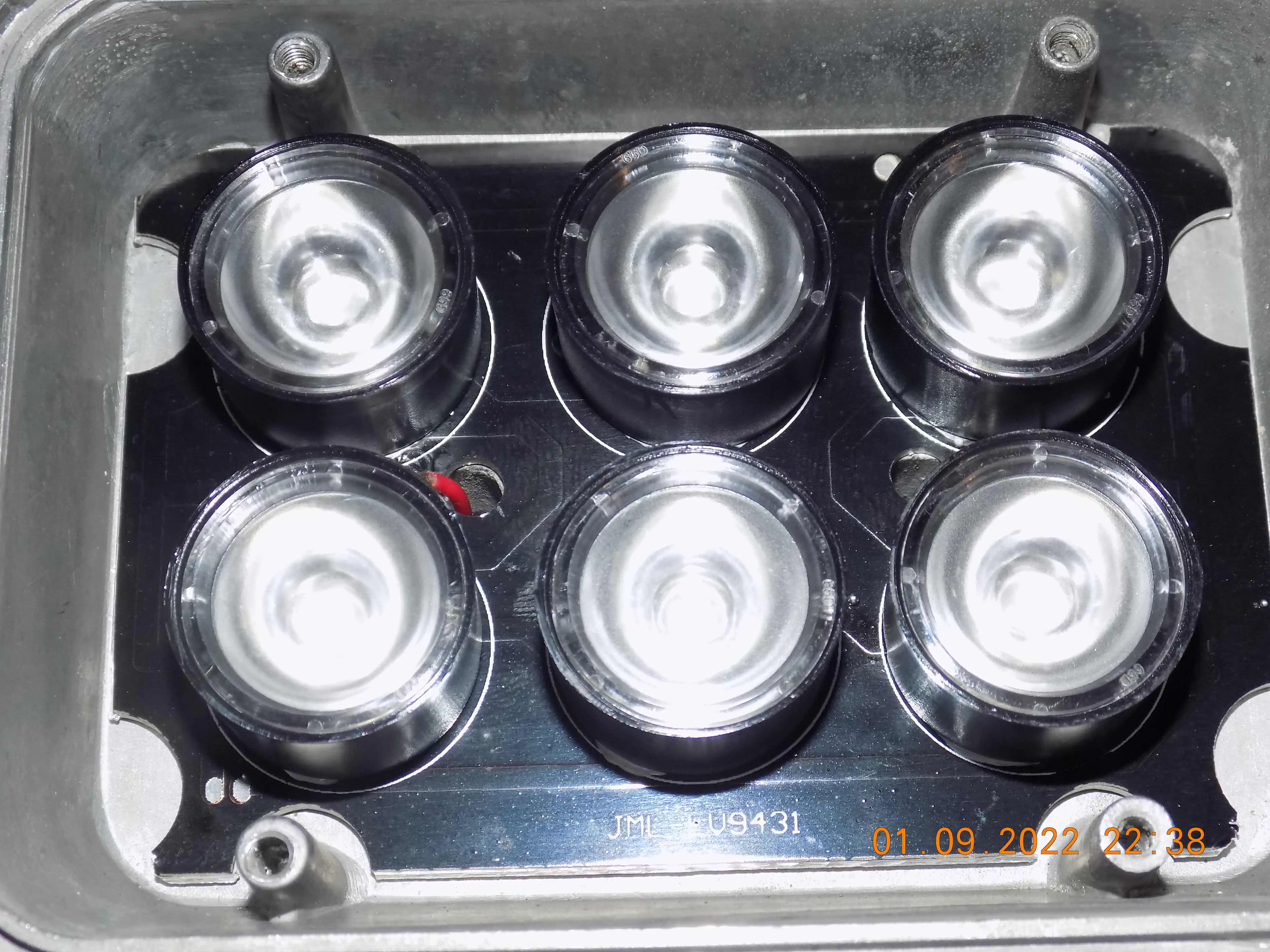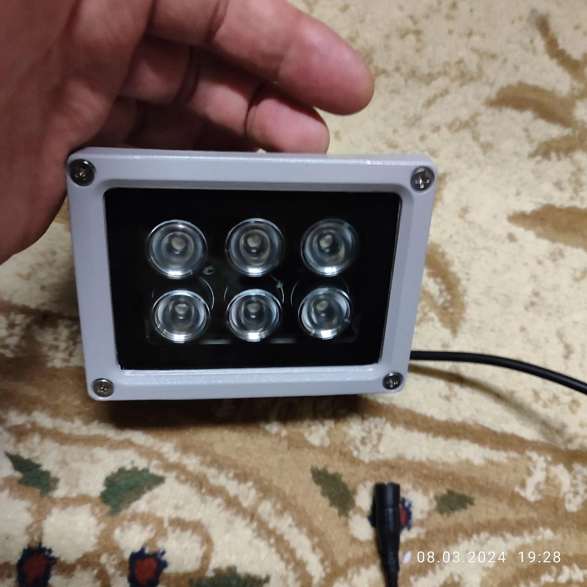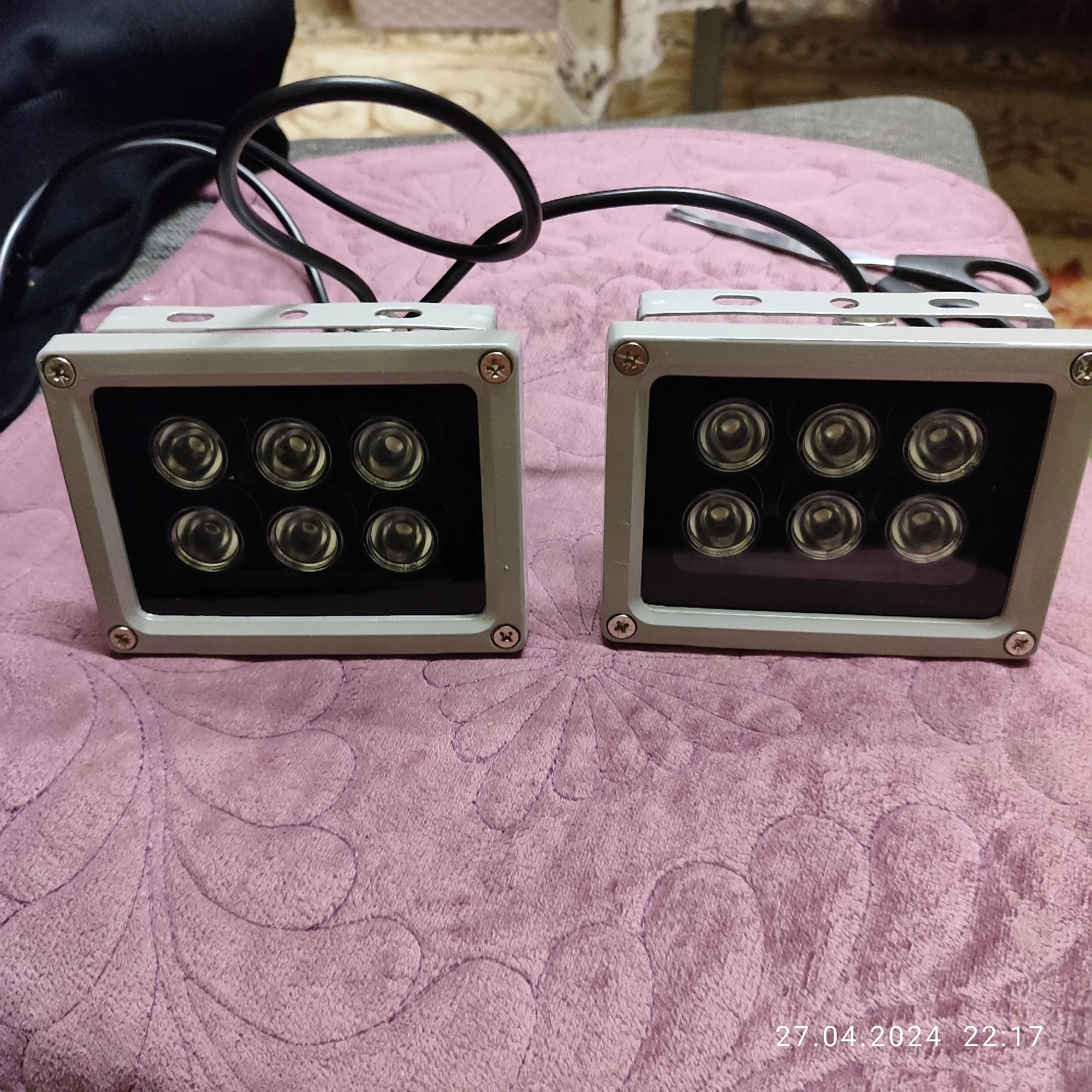 Покупал на распродаже со скидкой. Доставка 20 дней. Корпус металл, 6 линз, угол градусов 30-40. Можно чуть согнуть пластину и сделать угол шире, можно купить нужные линзы и заменить линзы(22мм). Освещает метров на 25 узким лучем, мне еще уже нужен чтобы дальше светить, заказал линзы 5, 10 градусов( метров на 80 чтобы осветить, с обьективом 12 мм в камере). Блок питания в комплект не входит, нужен 12 Вольт от 1 ампера и выше. Я 12 В 2 А использую. Хороший прожектор брать можно. Жду второй прож от этого же продавца. На даль планирую пару использовать с линзами 5,10 градусов.