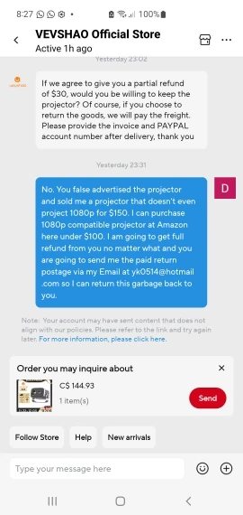 Покупатели, будьте осторожны! Этот проектор рекламируется ложно и не поддерживает 1080i или 1080p, как утверждается. Я купил его специально для подключения к моему караоке-аппарату, который совместим только с 1080p, но при подключении экран остается пустым. Этот проектор поддерживает только разрешение до 720p. Качество Также разочаровывает, и устройство, похоже, неисправно. При проециировании на экране видны линии, а мусор задерживается внутри объектива из-за плохой сборки. Теперь я застрял с продуктом, который я не могу использовать. Возврат стоил бы мне дороже $80 $30, а продавец предлагает только компенсацию за их вводящую в заблуждение рекламу. Они отказываются предоставлять предоплаченные почтовые расходы, в результате чего я очень разочарован. У меня остался непригодный проектор и никакого практического решения. Несмотря на предоставление видео и фотографий в качестве доказательства дефекта и вводящей в заблуждение рекламы, открывать спор с Alibaba бесполезно. Они отклоняют претензии, заявив, что нет достаточных доказательств.