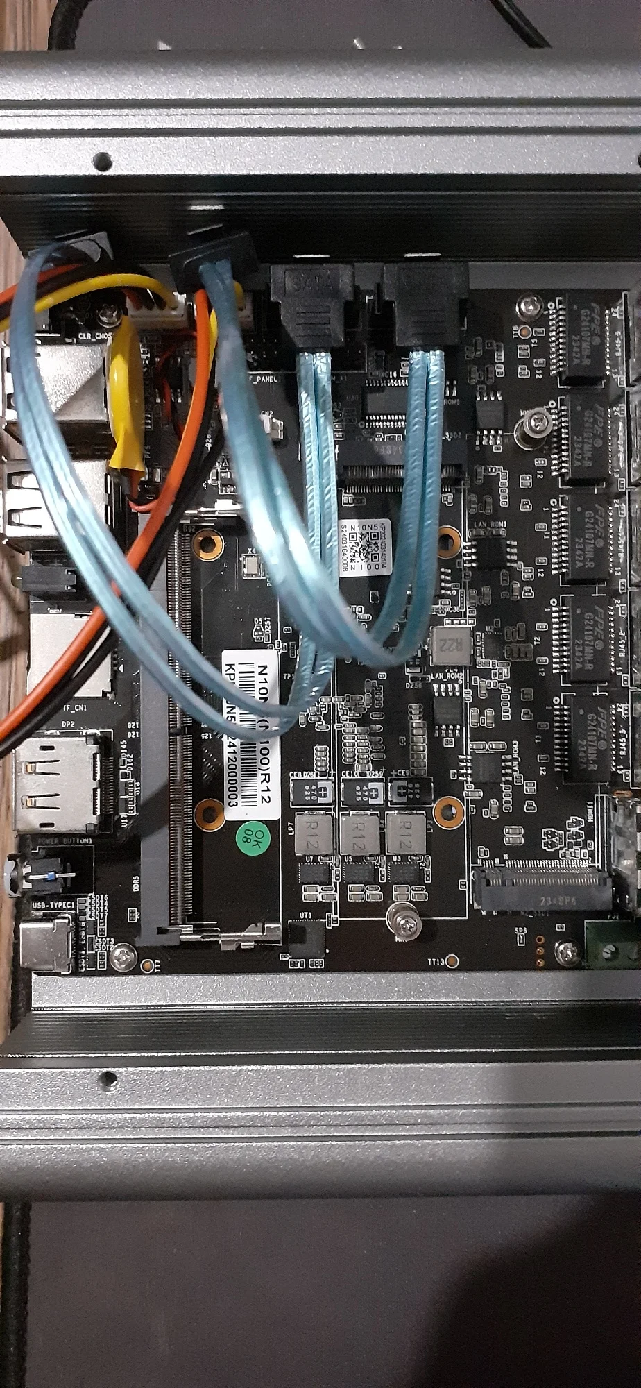 Под нагрузкой греется приемлемо, руку едва можно держать после часа стресс теста CPU, температура 60 градусов. Можно сказать, что данный корпус-радиатор и чип Intel N100 хорошо сбалансированы. Если поставить чип мощнее, то будет сильно грется и потребуется активное охлаждение, поэтому хорошо подумайте прежде чем покупать другие устройства подобного типа с более производительными чипами с целью fanless использования. Стресс тест CPU показал что тепло хорошо отводится на корпус с чипа, он равномерно горячий, не нужно его разбирать и менять термопасту. Между корпусом и чипом медная пластина. В комплекте есть блок питания. Внутри 2 сата порта, но кабелей в комплекте только на один. И в описании тоже только 1 порт. Надо это исправить продавцу. За 150$ это хорошо собранный мини ПК с двумя m2 и двумя SATA, идеально подойдёт для домашнего мини сервера на proxmox.
