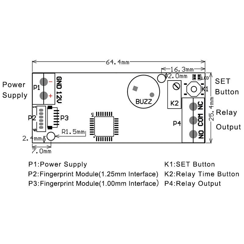 6. Использование:Нажмите на палец, реле замыкается после прохождения отпечатка пальца, и время закрытия определяется K2.