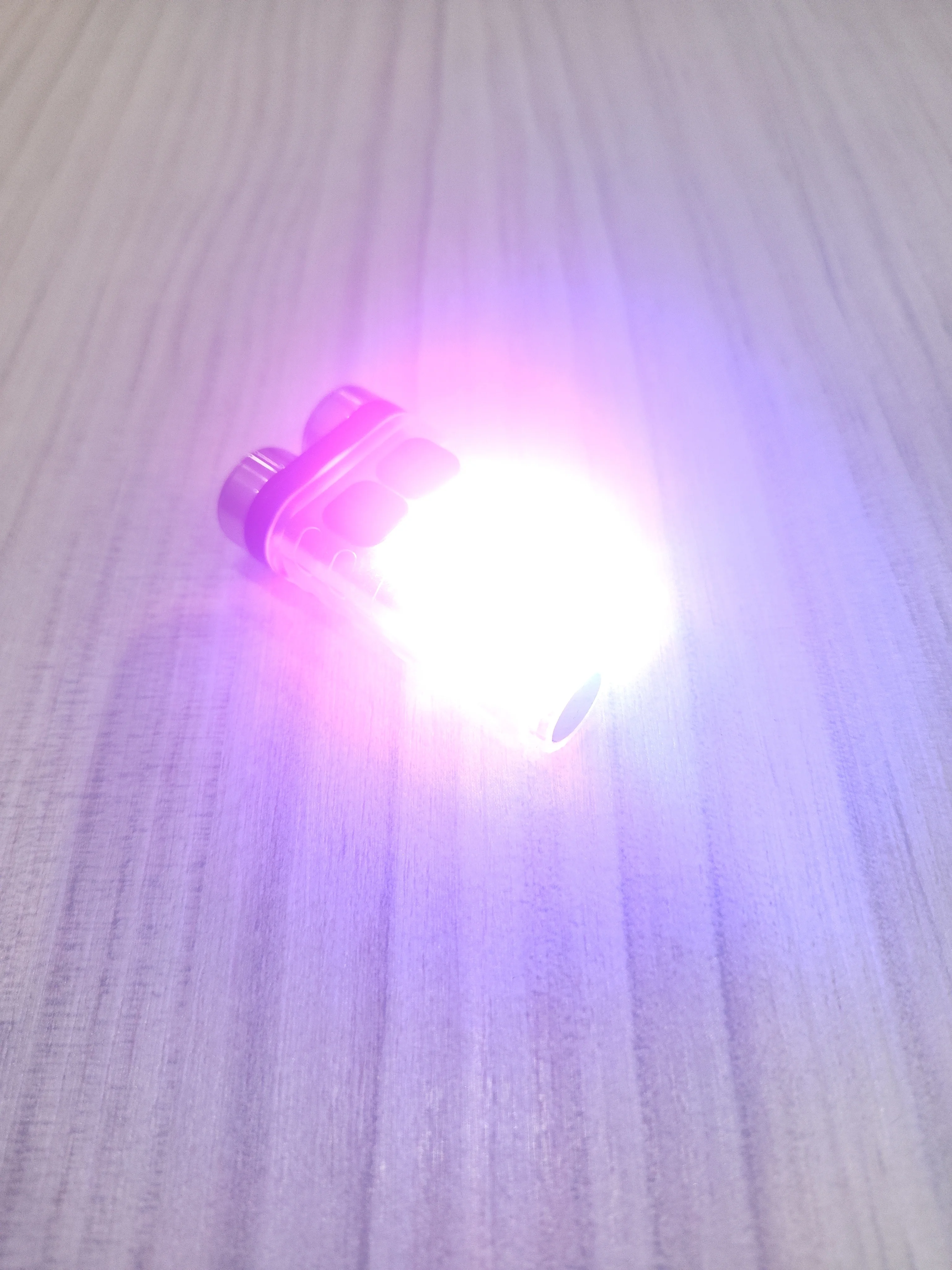 Оттенки разных цветов помогают обнаружить вещи, невидимые невооруженным глазом. Фиолетовый свет можно использовать для идентификации валюты, водительских прав, официальных удостоверений личности, паспорта, нефрита, пятен и т. д. Максимальная яркость составляет 400 лм, его также можно использовать в качестве фонарика. Есть также белый свет, мигающий белый свет, фиолетовый свет, красный свет, красный свет мигает, красный и синий мигает попеременно.