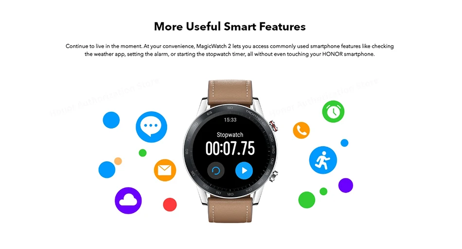 Продолжайте жить в данный момент. В вашем удобстве MagicWatch 2 позволяет вам получить доступ к часто используемым функциям смартфона, таким как проверка погодного приложения, настройка будильника или запуск таймера секундомера, даже не прикасаясь к смартфону HONOR.