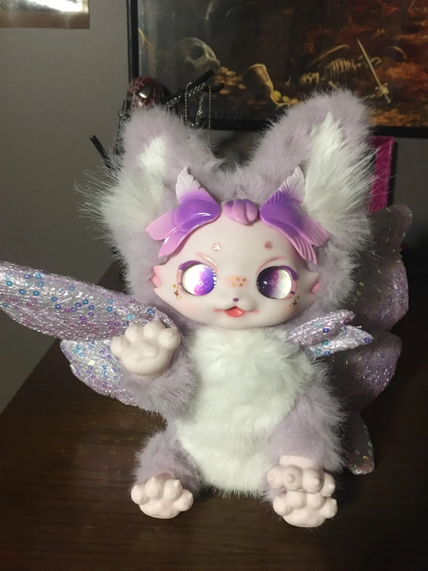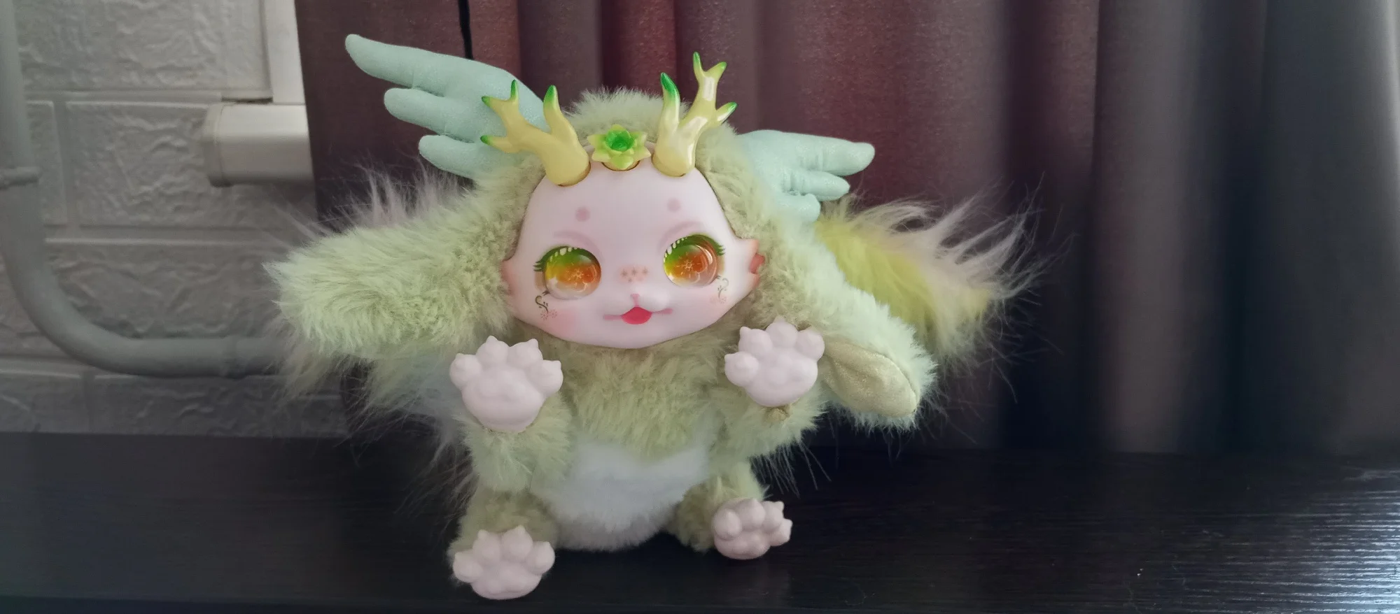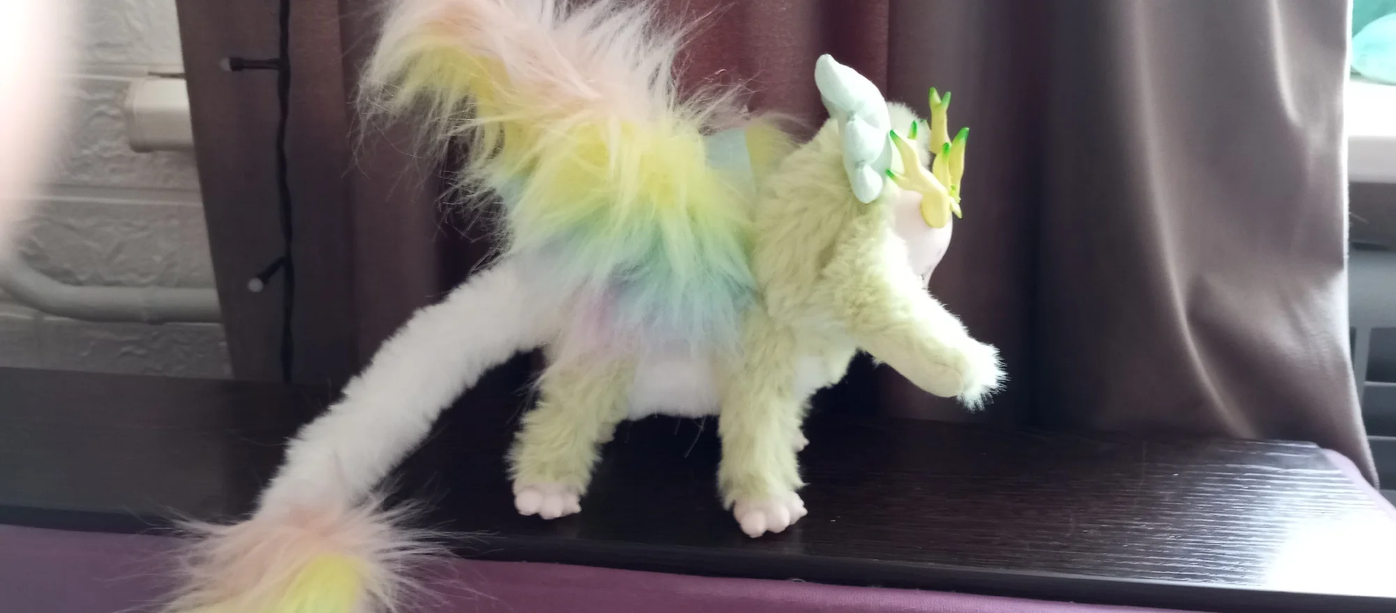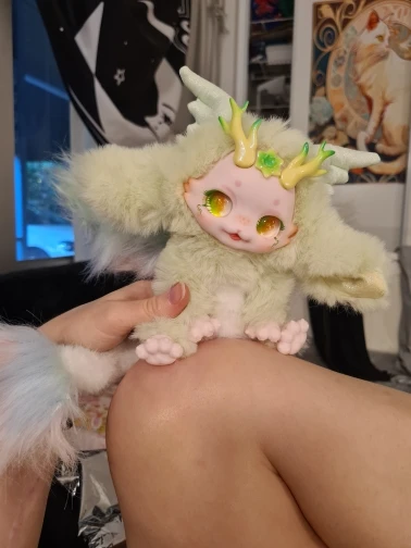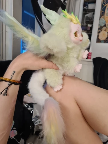 Маленький шарнирный плюш. Он мягкий, красивый, нежный. Мне нравится, как можно разместить ноги, крылья, хвост, даже ствол куклы сочленен. Нежное лицо. Очень хорошо. Это стоило мне € 22, но это красиво. Это покупка всей коллекции. Это не обычная игрушка ни в одном магазине. Он пришел в слегка Вдавленный ящик, внутри серебряного полиэтиленового пакета. Было хорошо. Занял указанное время. Все в порядке.