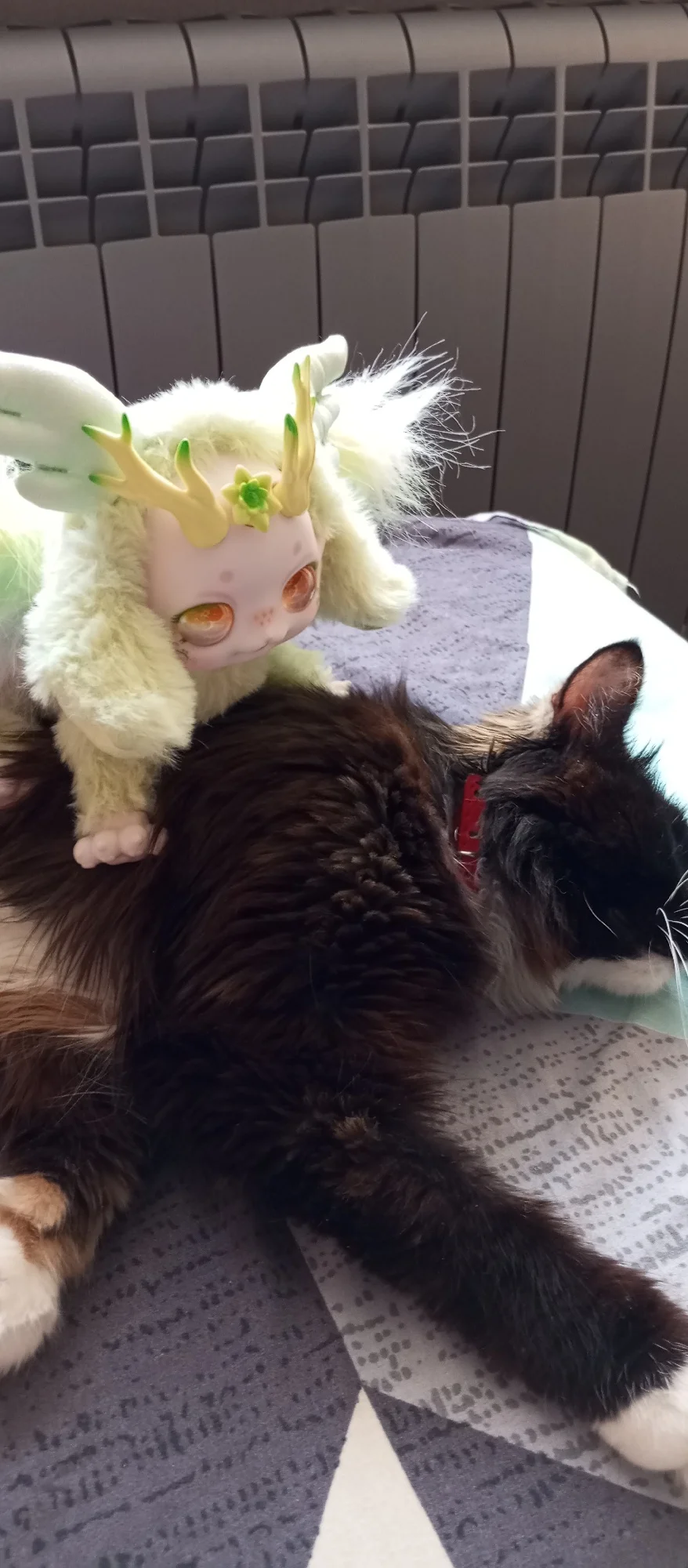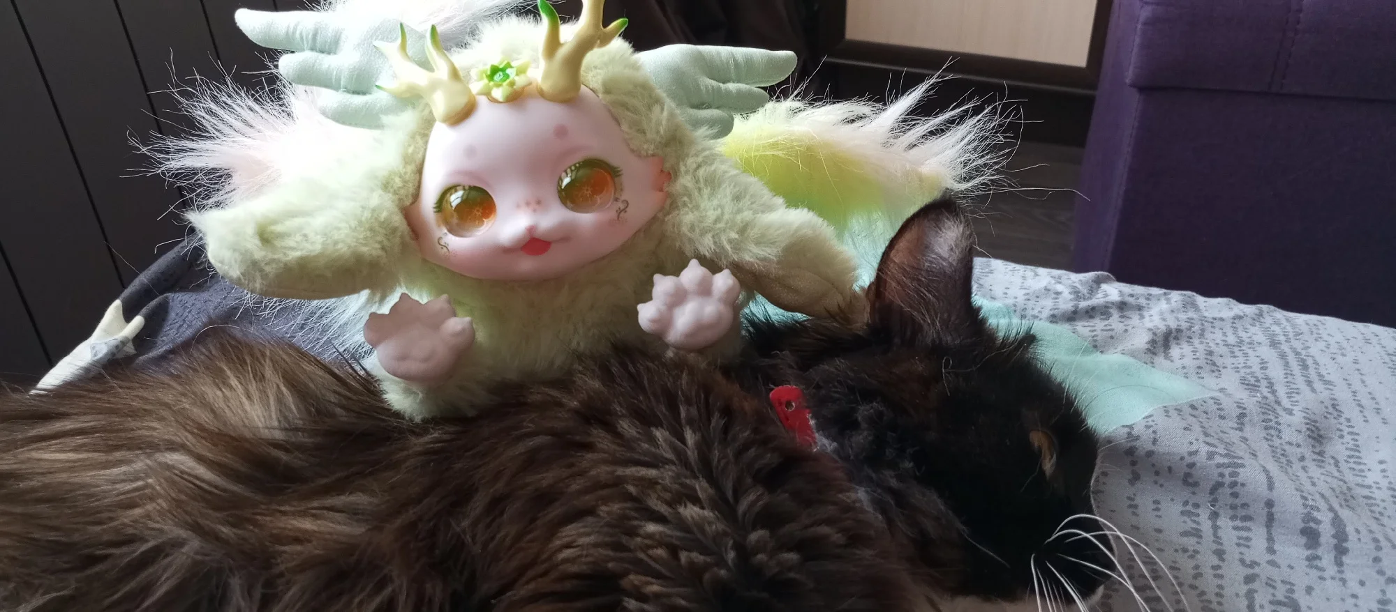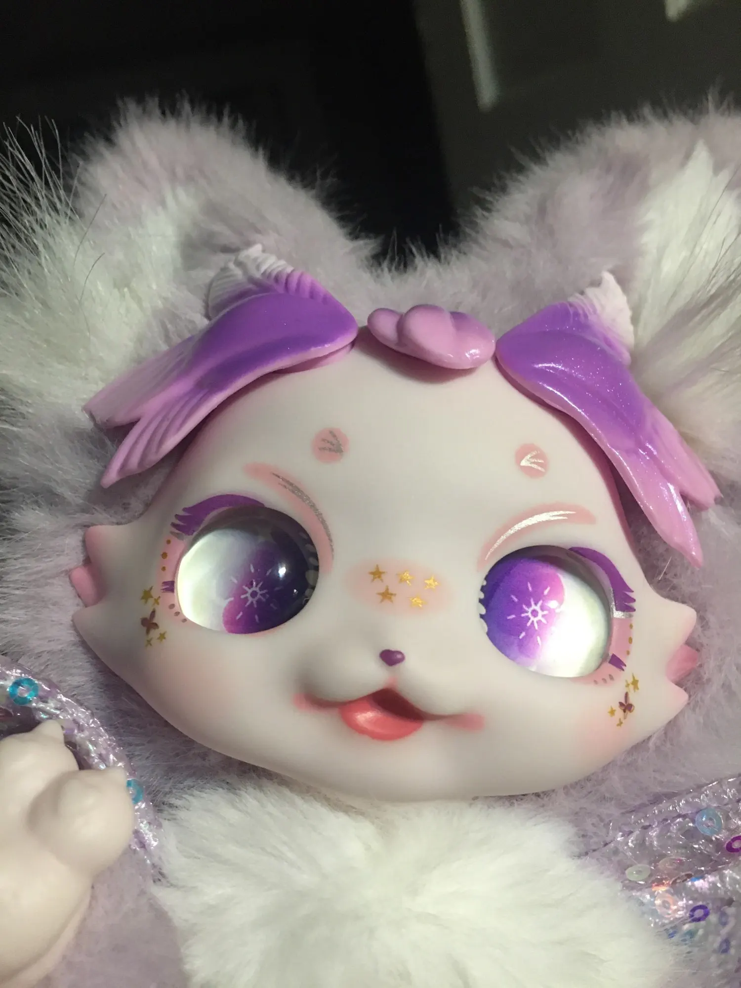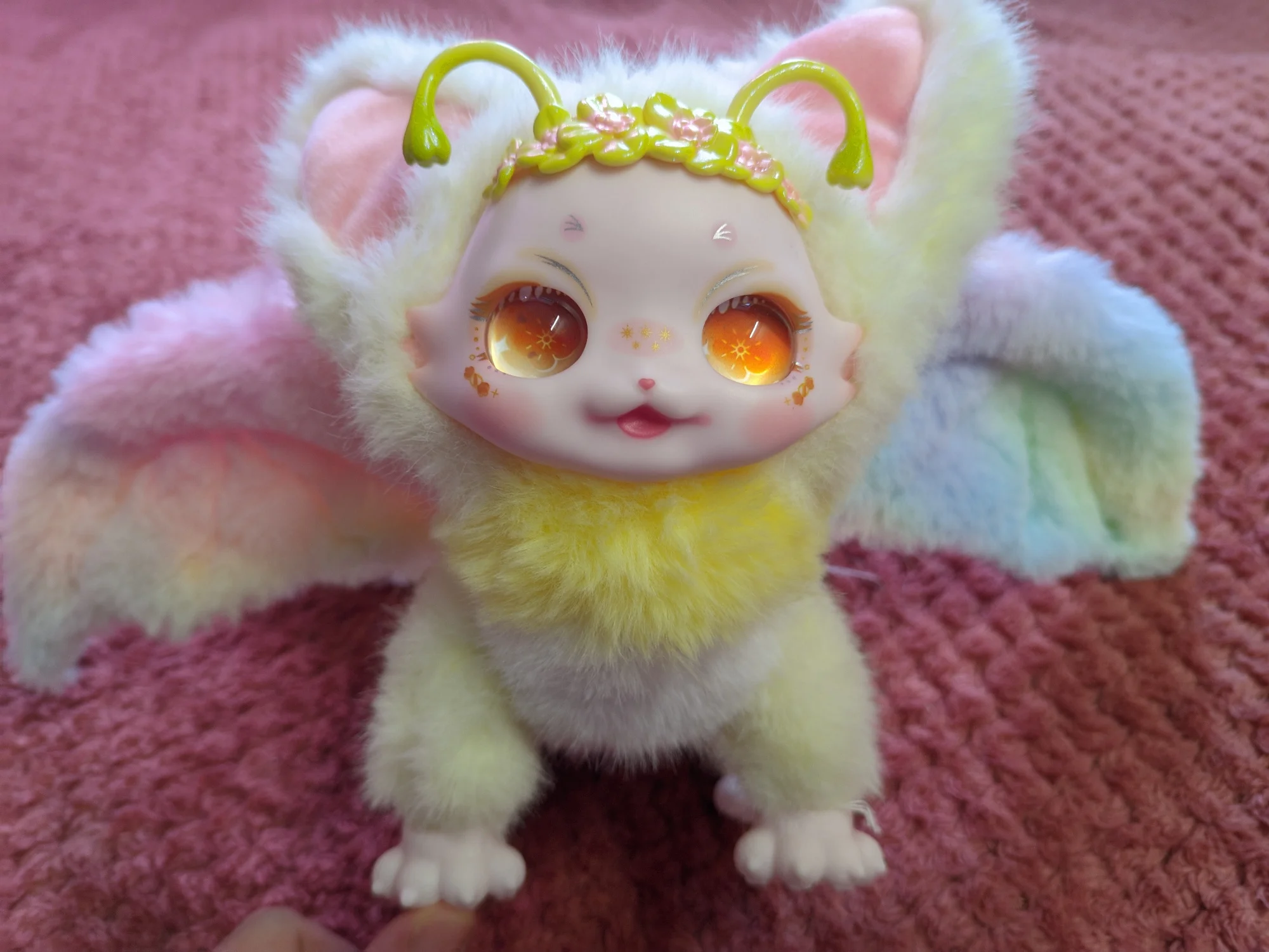 Так мило! Она еще более податлива, чем я думал-ее Шея и спина сгибаются, а ее ноги вращаются. Украшения для ног и головы на самом деле снимаются довольно легко, поэтому это не подходящая игрушка для малышей. Глаза, кажется, смотрят в разные стороны в зависимости от угла, что довольно интересно. Трафаретная печать на лице, конечно, идеальна, как и все другие куклы Maytree, которые у меня есть. В конструкции есть некоторые детали, где было бы неплохо, если бы была предпринята дополнительная осторожность (а именно некоторые Несовершенные швы, свободные нити и немного клея в мехе вокруг ног). Однако, я думаю, что в целом соотношение цены и качества является разумным по сравнению с аналогичными плюшевые куклы (как Tutulong), особенно учитывая высокую степень posability.