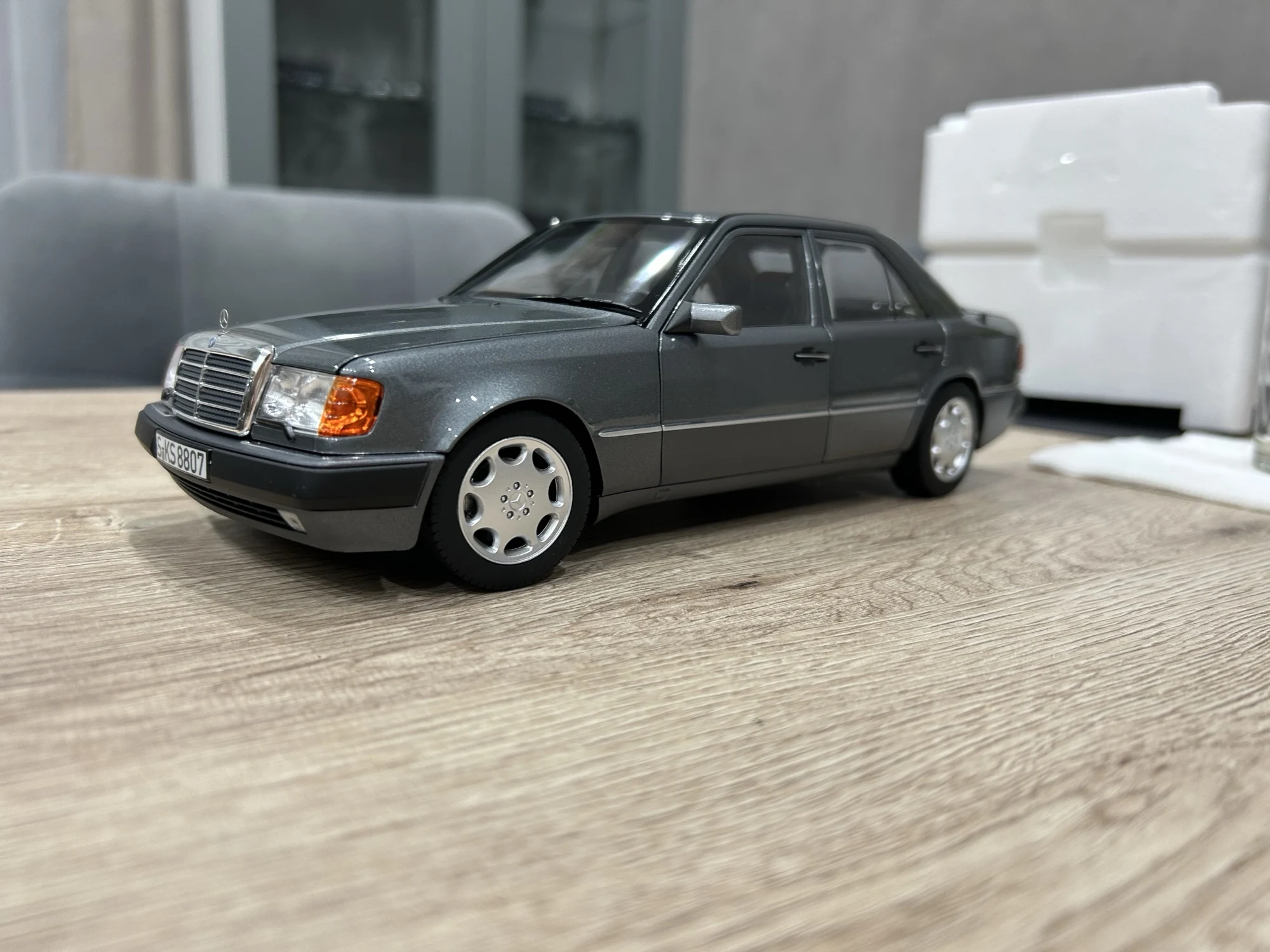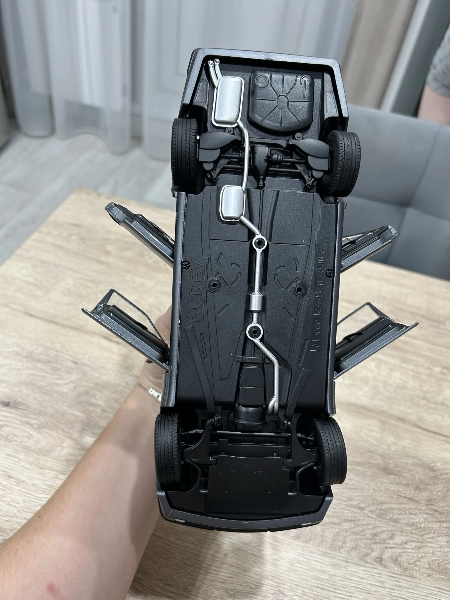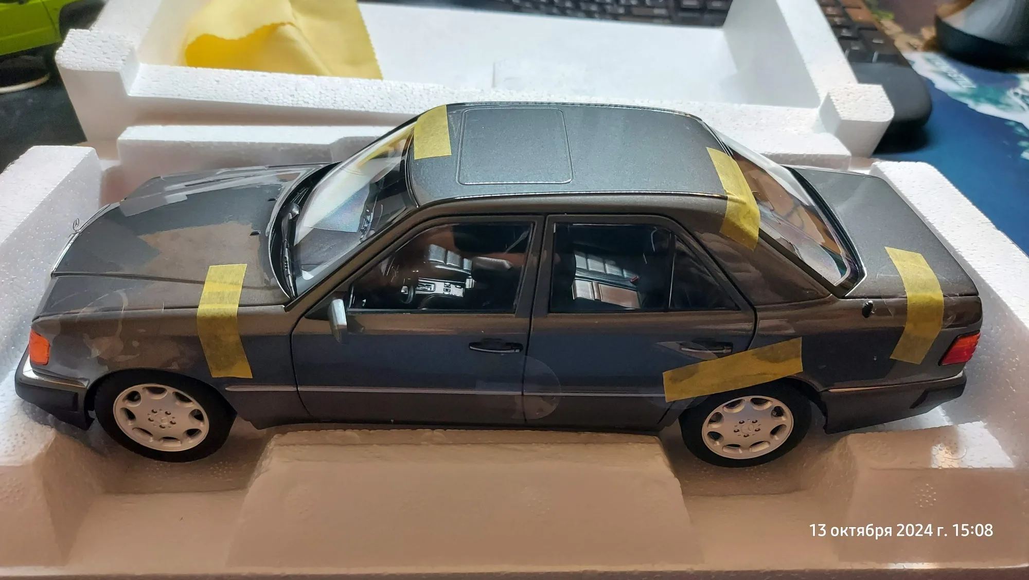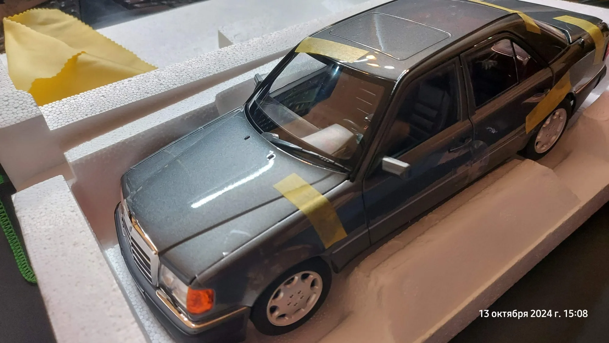 Модель полностью соответствует оригинальной машине. Была такая в детстве у отца. Очень тонкая эмблема мерседес на капоте, нужно быть очень аккуратным! Продавец хорошо упаковал товар. На коробке были защитные углы. В коробке модель была дополнительно зафиксирована лентами.