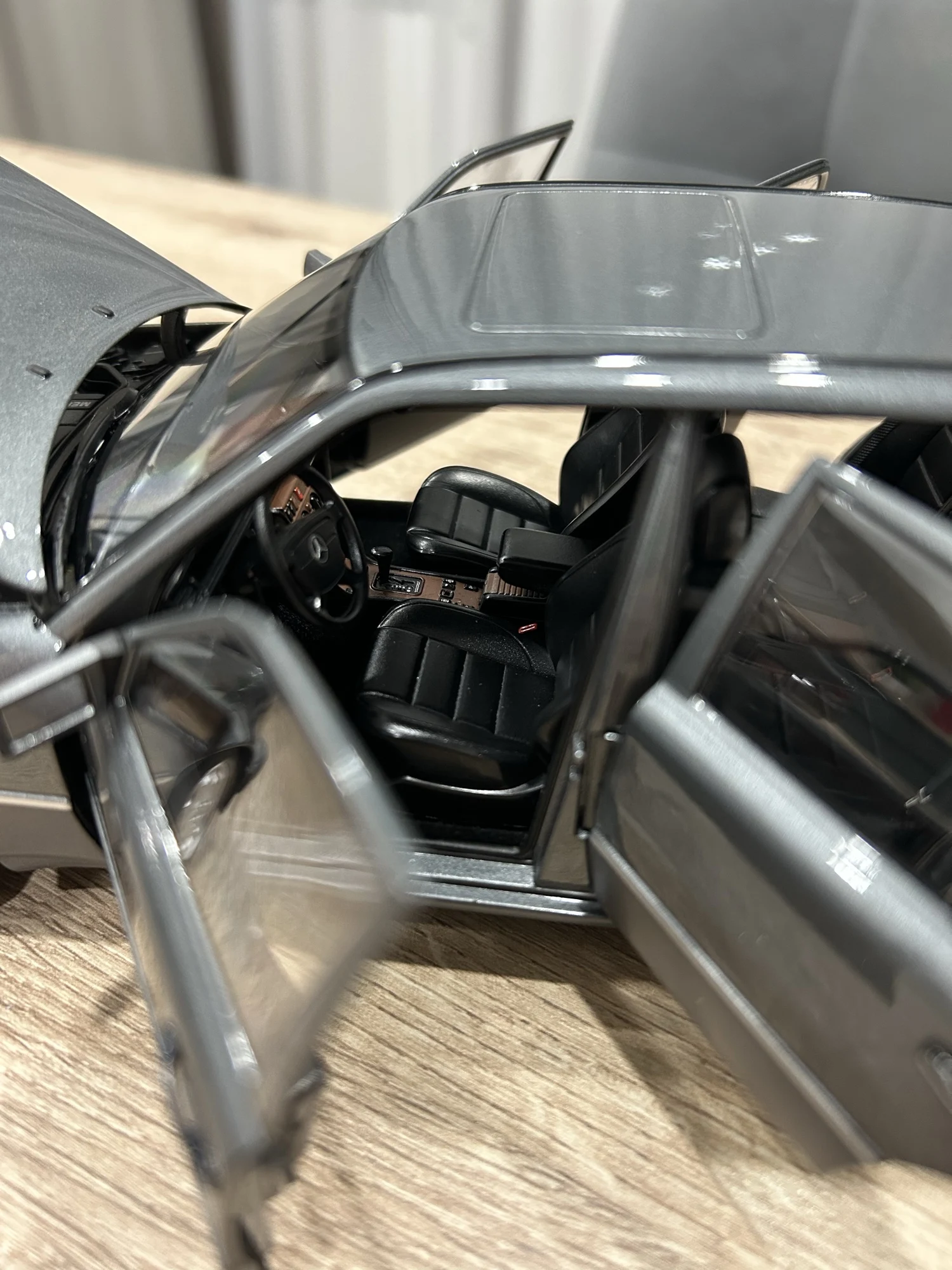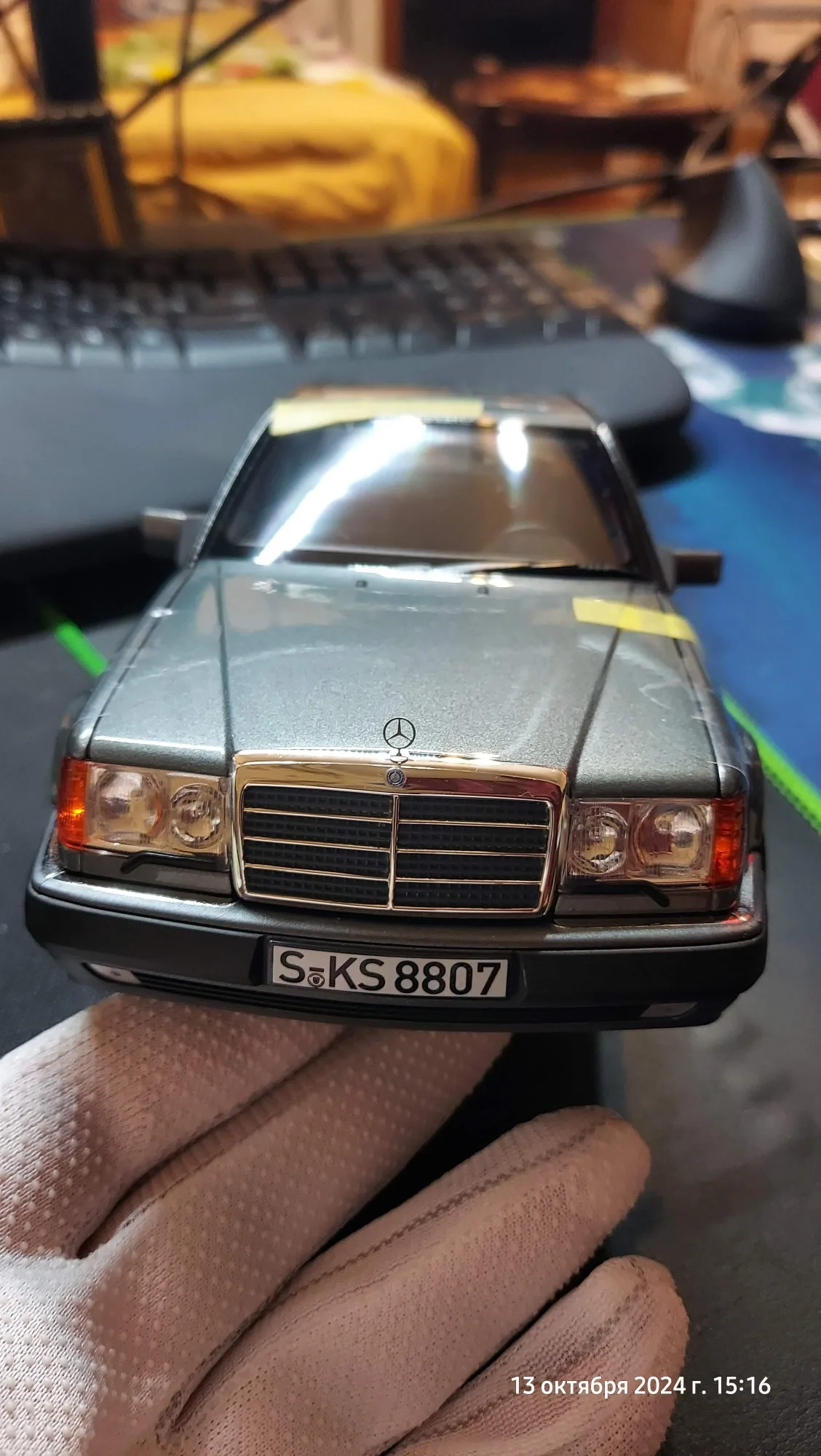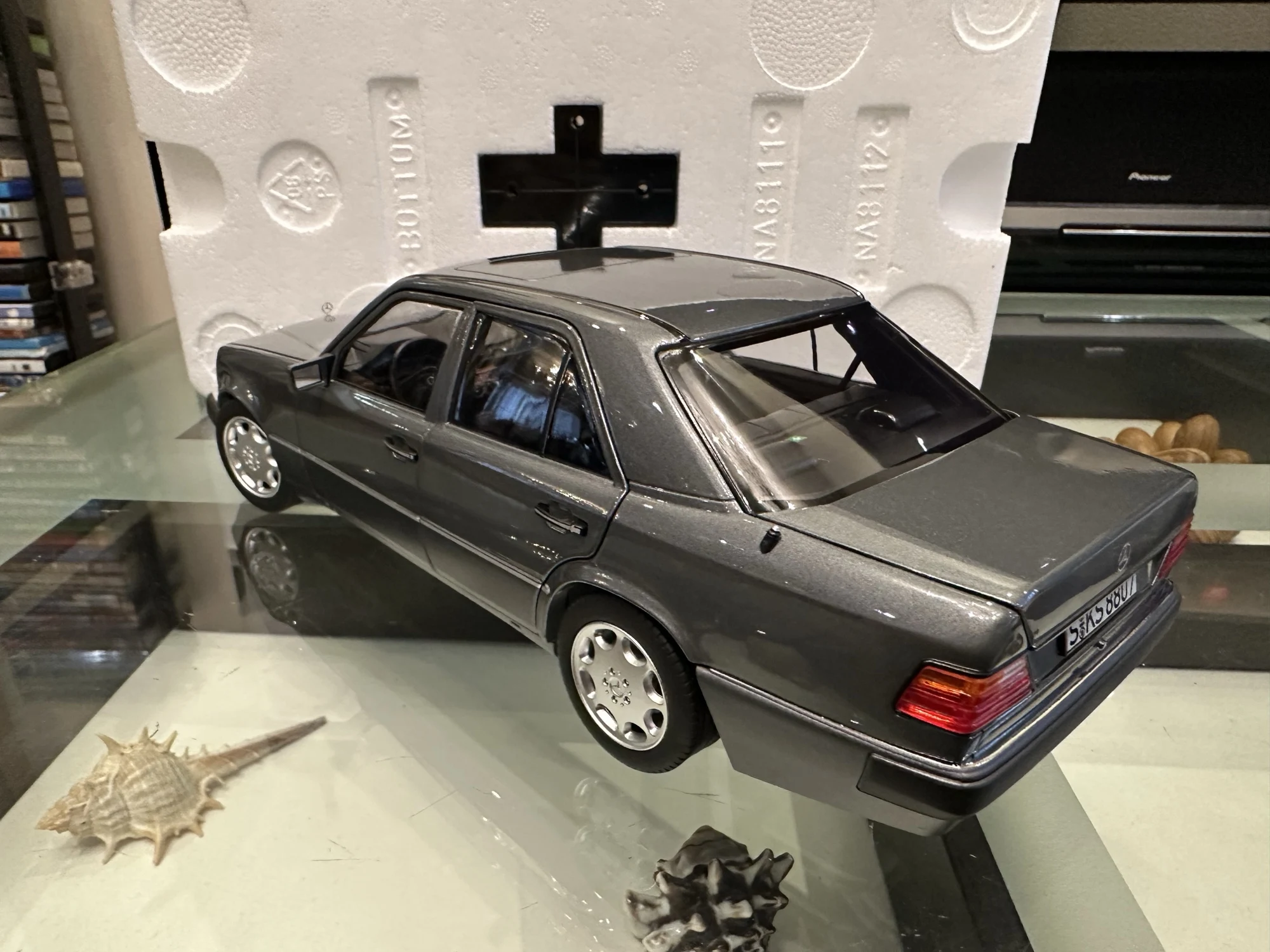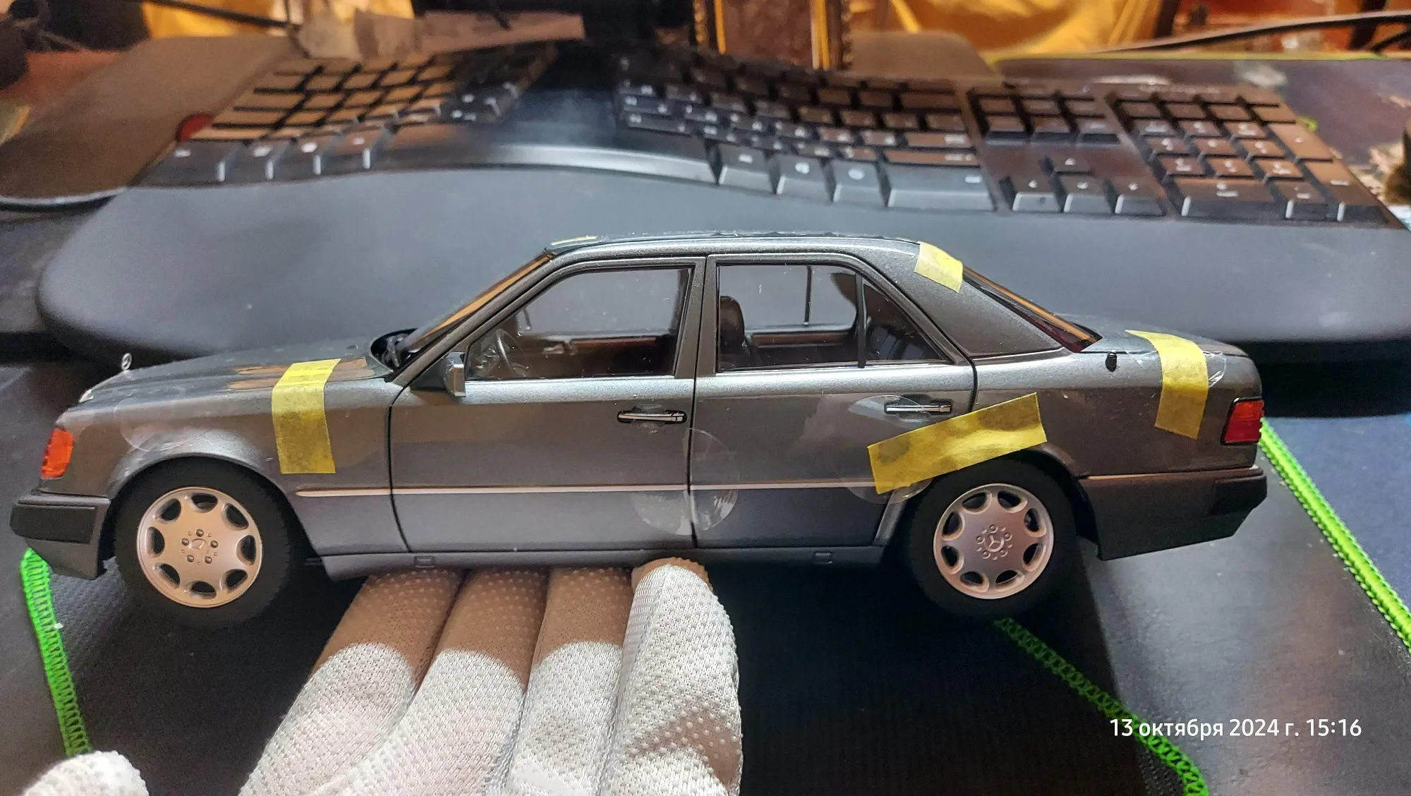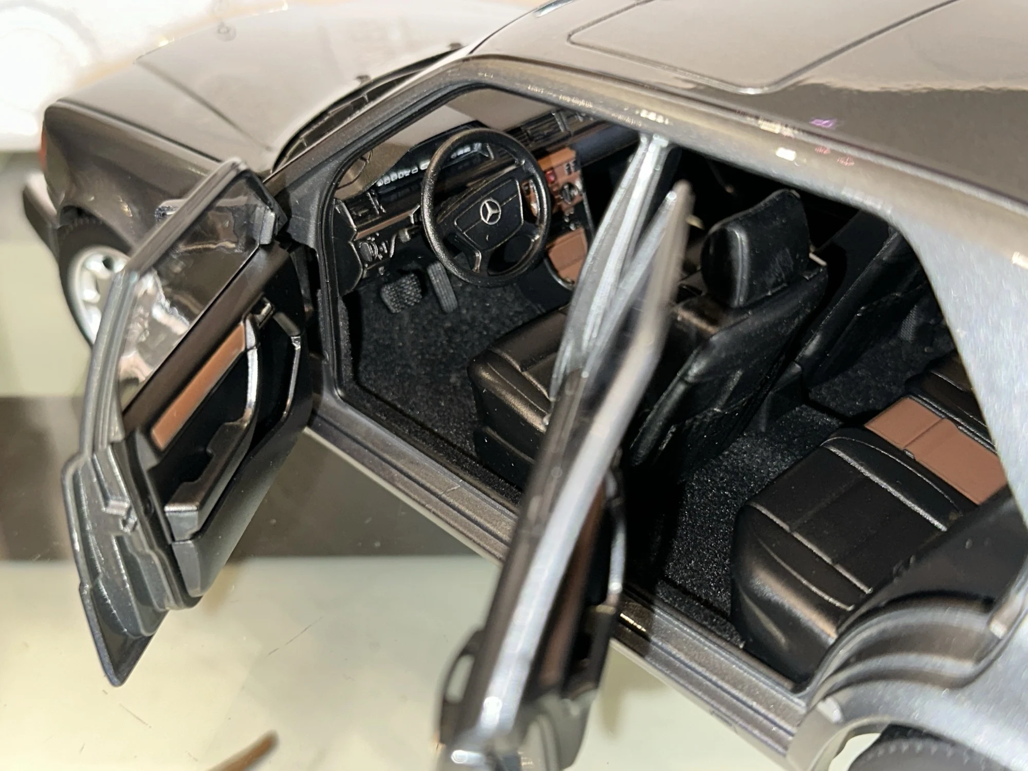 Модель полностью соответствует оригинальной машине. Была такая в детстве у отца. Очень тонкая эмблема мерседес на капоте, нужно быть очень аккуратным! Продавец хорошо упаковал товар. На коробке были защитные углы. В коробке модель была дополнительно зафиксирована лентами.