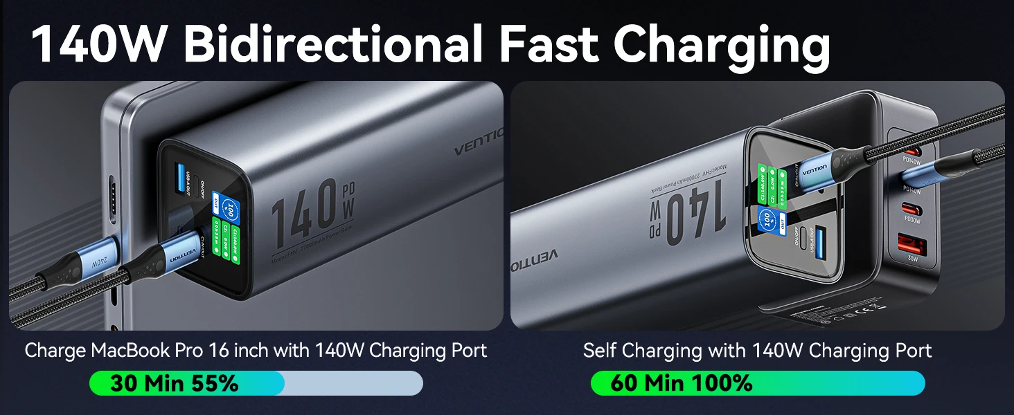 Портативный внешний аккумулятор Vention 27000 мАч, 140 Вт, быстрая зарядка PD 3,1, внешний аккумулятор большой емкости для iPhone 16, iPad Macbook