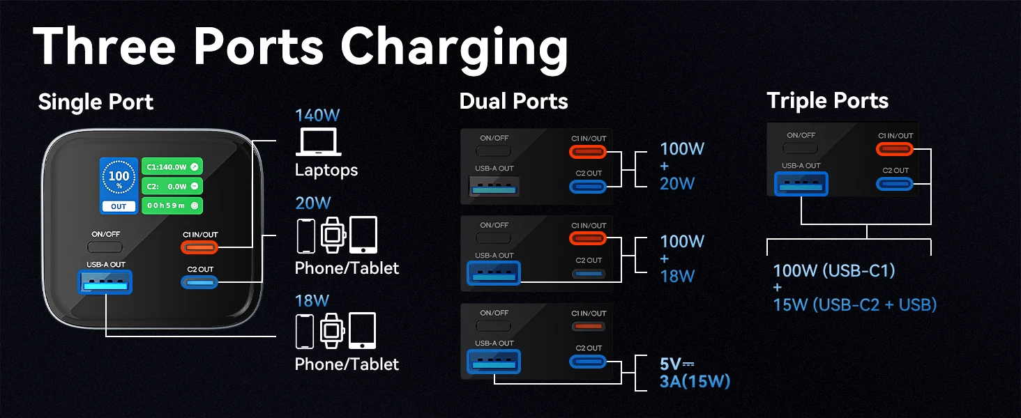 Выход (USB-C 1+USB-A): 100 Вт+18 Вт
