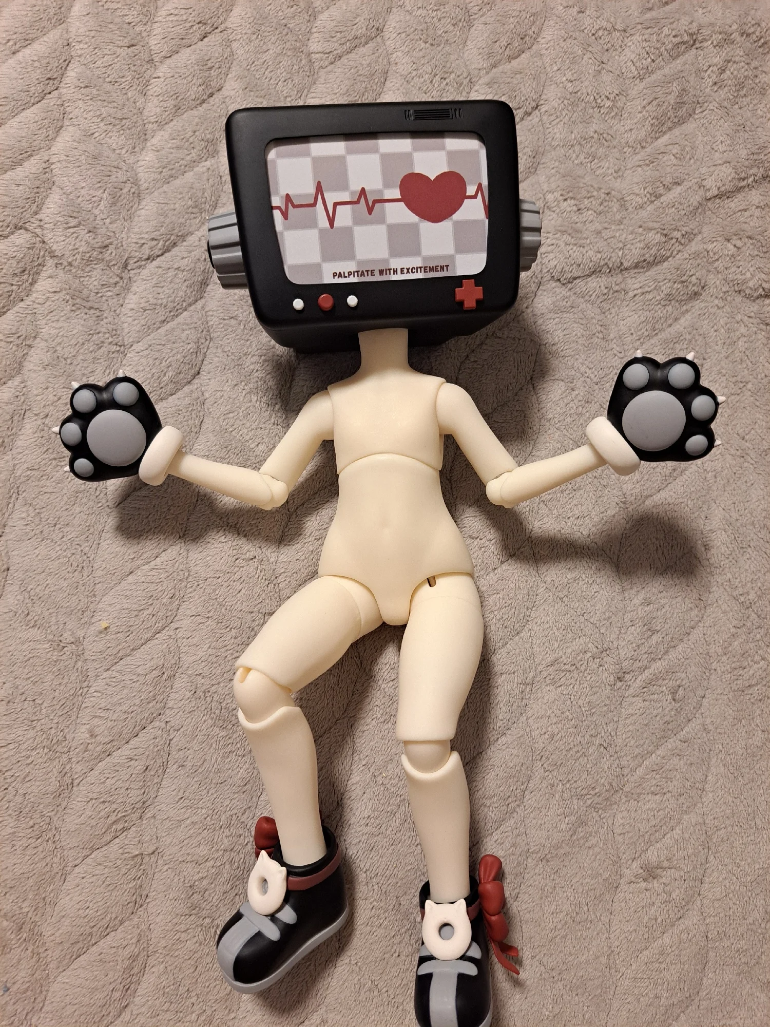 отличная кукла. она большая. перетяжка слабовата, но возможно она так и была задумана, там если что сменные ступни, так как ботинки это как целая стопа, так и руки, но они виде лапок-ручек. дополнительно идет прозрачный экран для своих экранов картинок, было ли там голова куклу в подарок точно не знаю, но в пластике словно есть выемка под неё. но она и без этого хороша