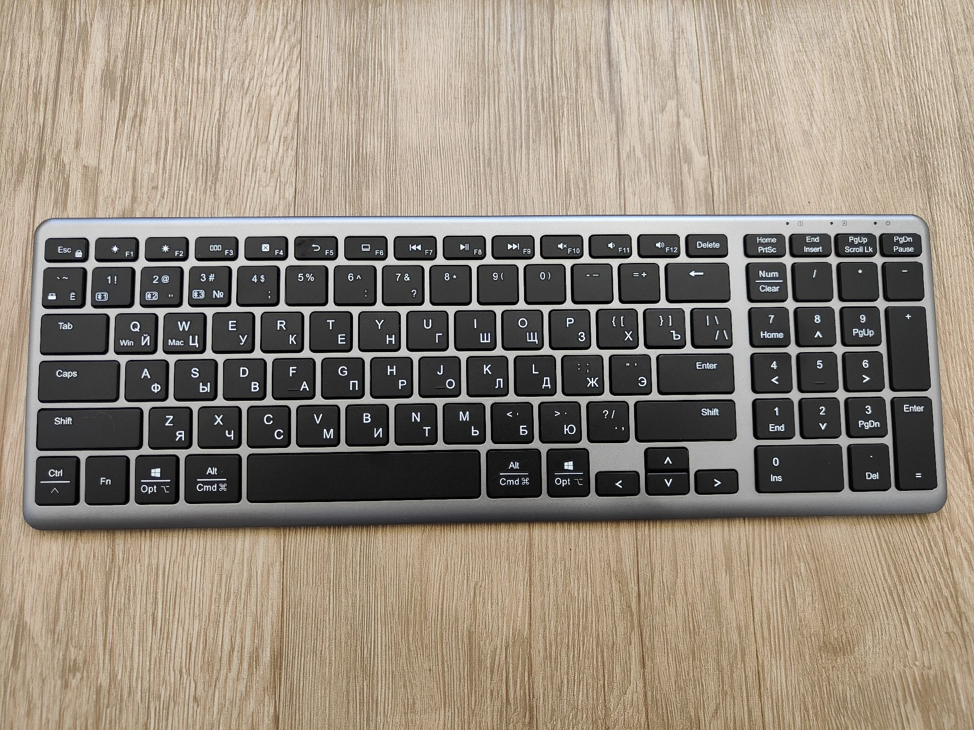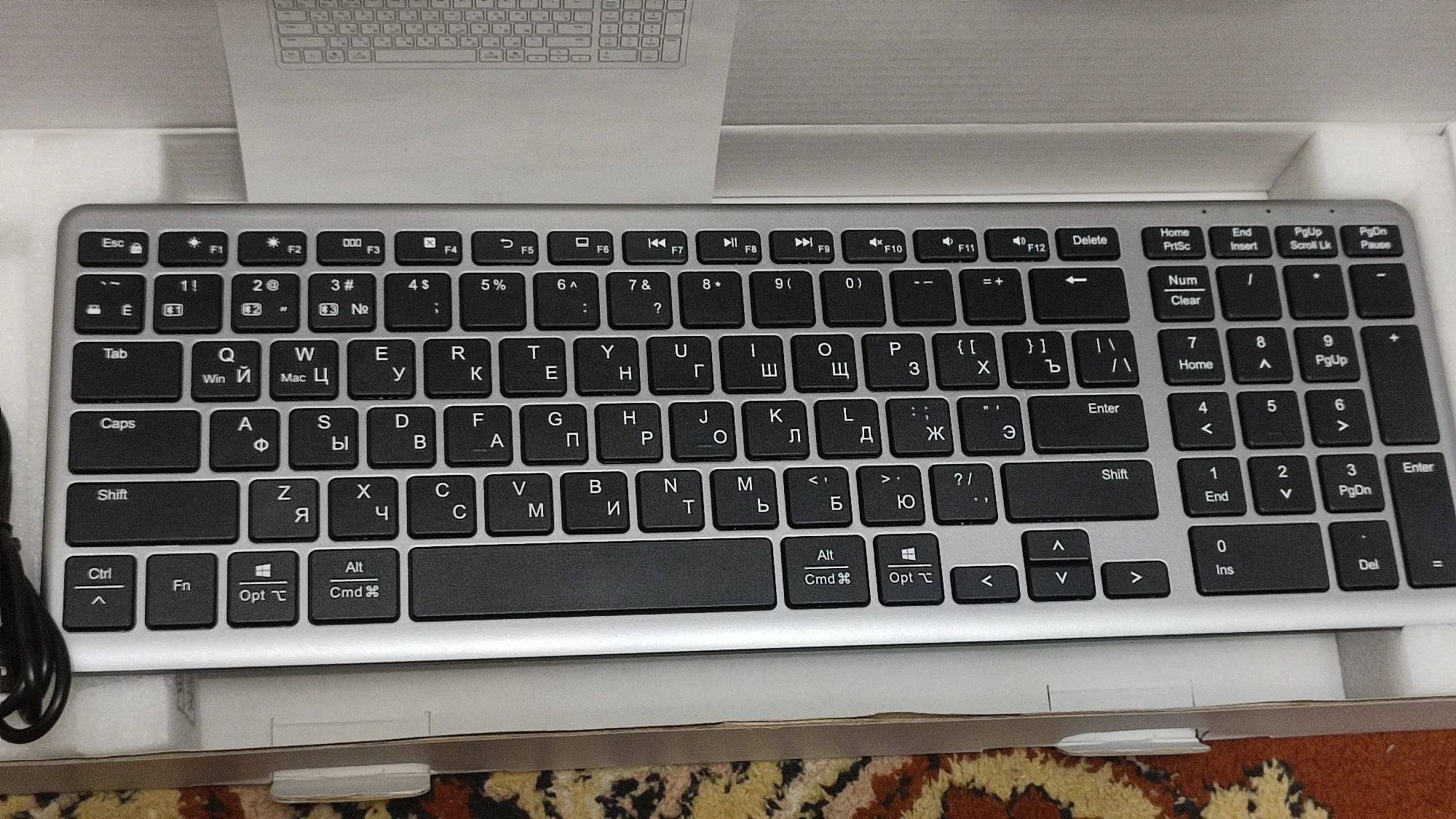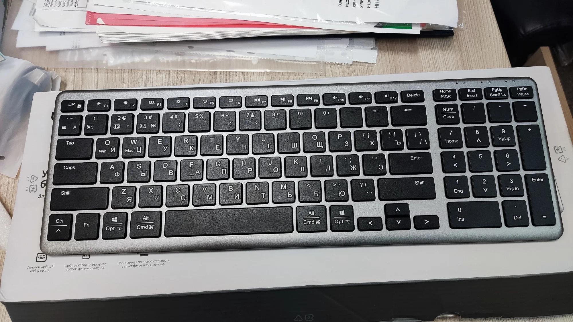Отличный товар. Компактная, но со всеми нужными клавишами и цифровым блоком. Клавиши бесшумные, вмеру тугие. Белые буквы на черных клавишах читаются легко. Отлично, что кириллица сразу из коробки. Инструкция на русском языке, но даже не понадобилась, после первого включения клавиатуры, ноутбук мгновенно выдал сообщение о найденной блютуз клавиатуре. Все работает. Приемник, для сопряжения по радио, сбоку на магните.Eduard K. 20 ноября 2023
