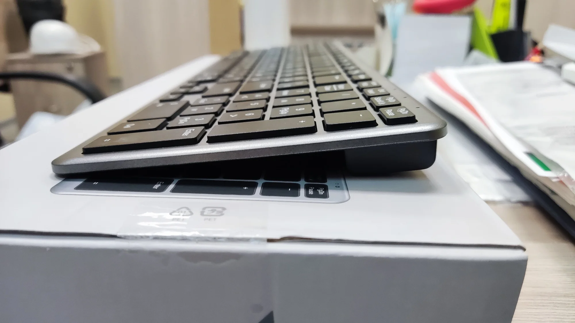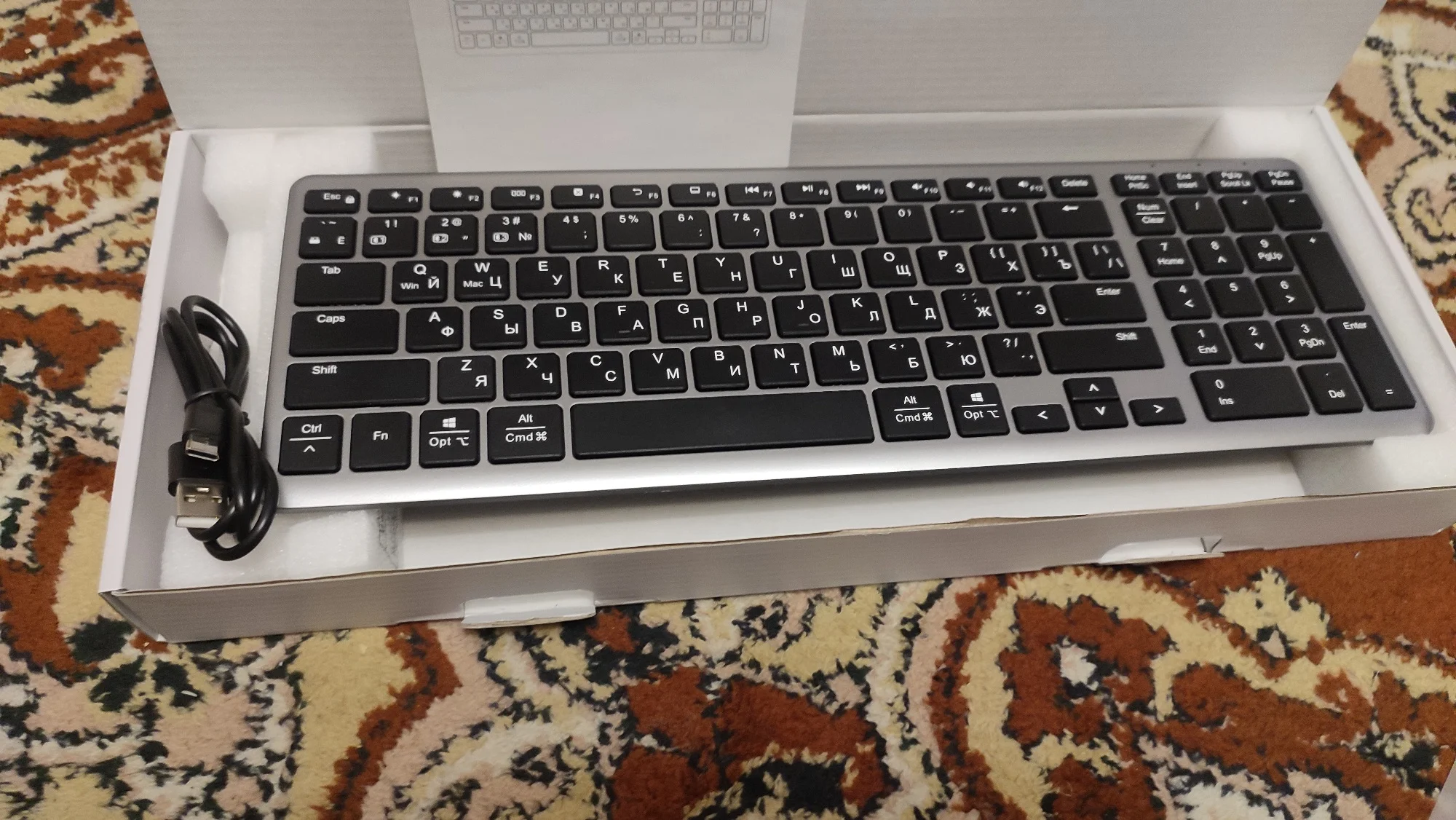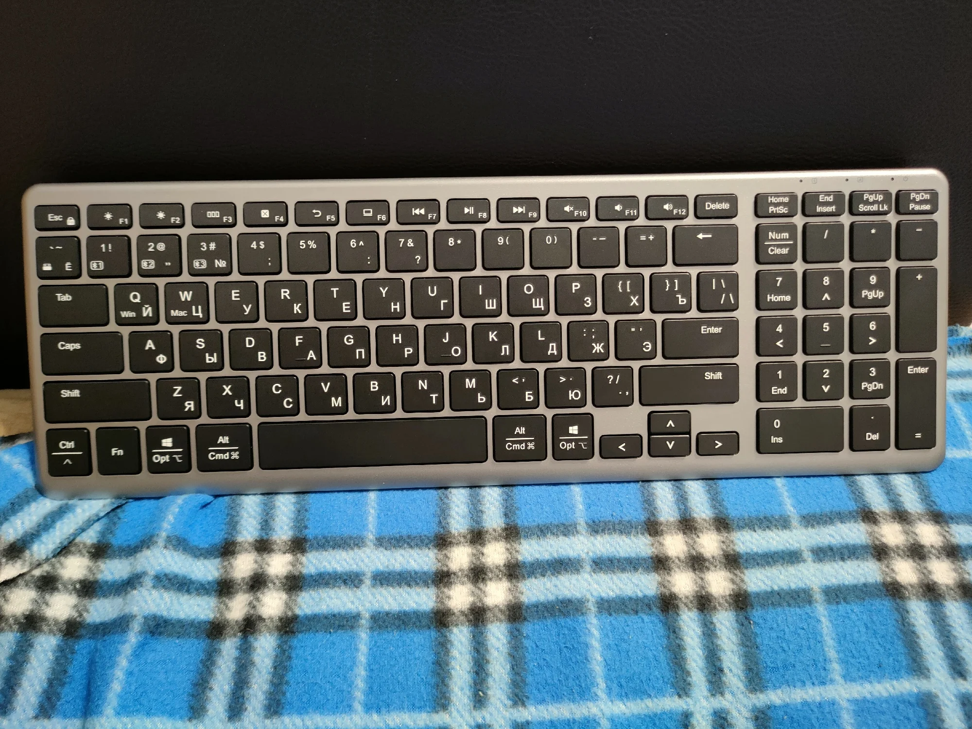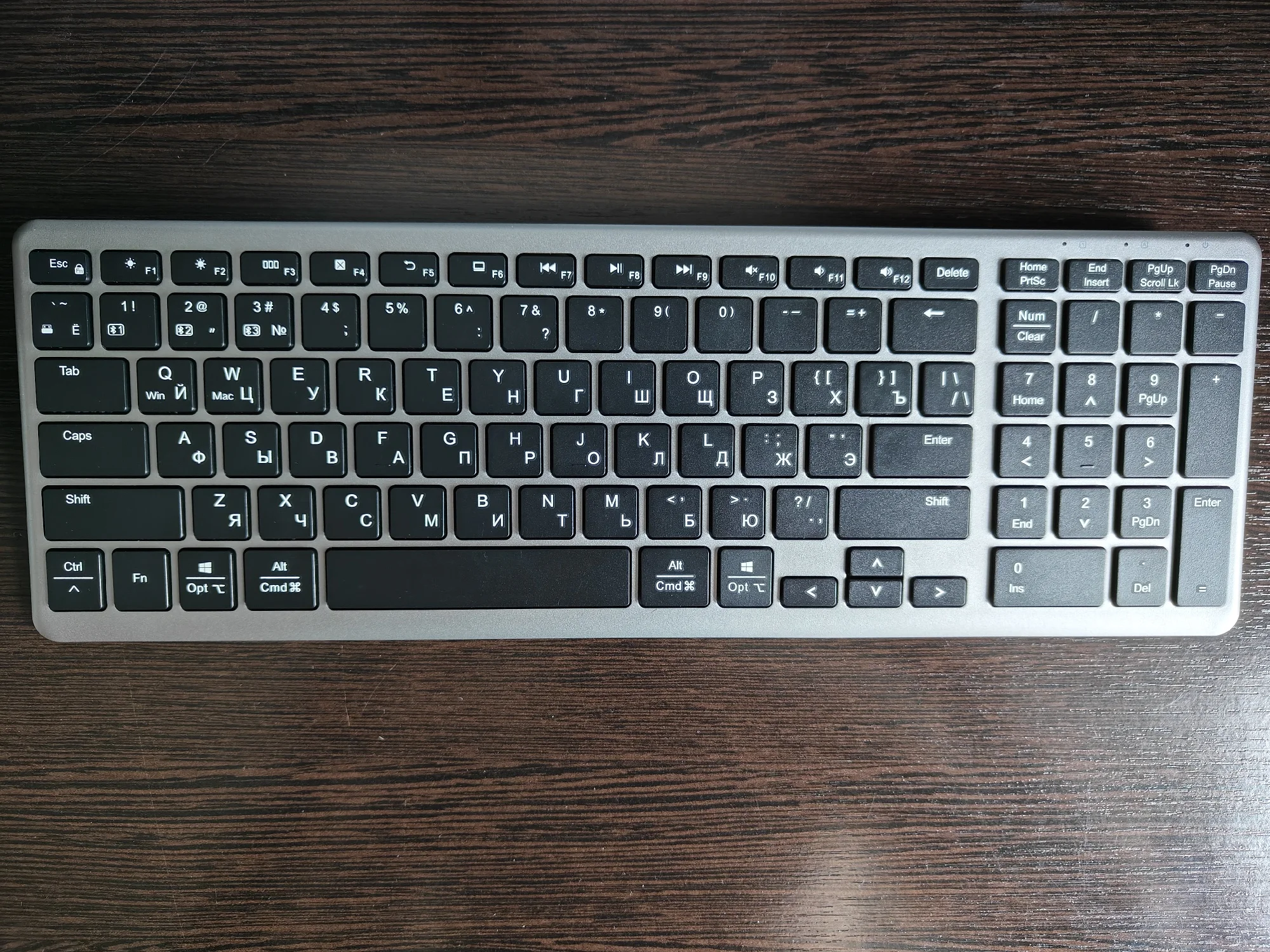 Отличный товар. Компактная, но со всеми нужными клавишами и цифровым блоком. Клавиши бесшумные, вмеру тугие. Белые буквы на черных клавишах читаются легко. Отлично, что кириллица сразу из коробки. Инструкция на русском языке, но даже не понадобилась, после первого включения клавиатуры, ноутбук мгновенно выдал сообщение о найденной блютуз клавиатуре. Все работает. Приемник, для сопряжения по радио, сбоку на магните.Eduard K. 20 ноября 2023