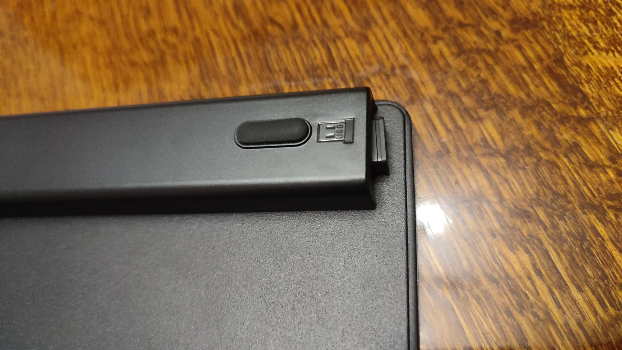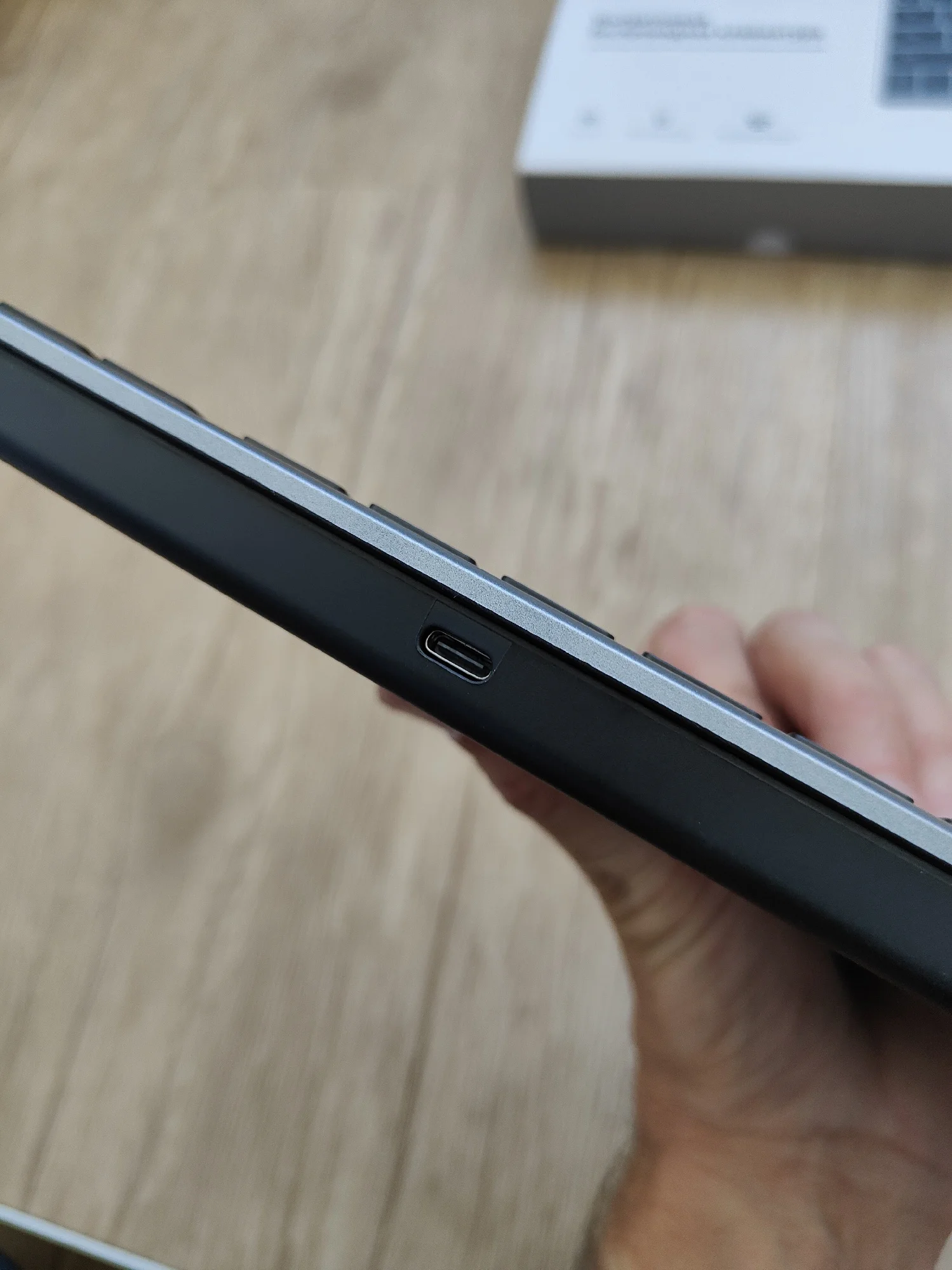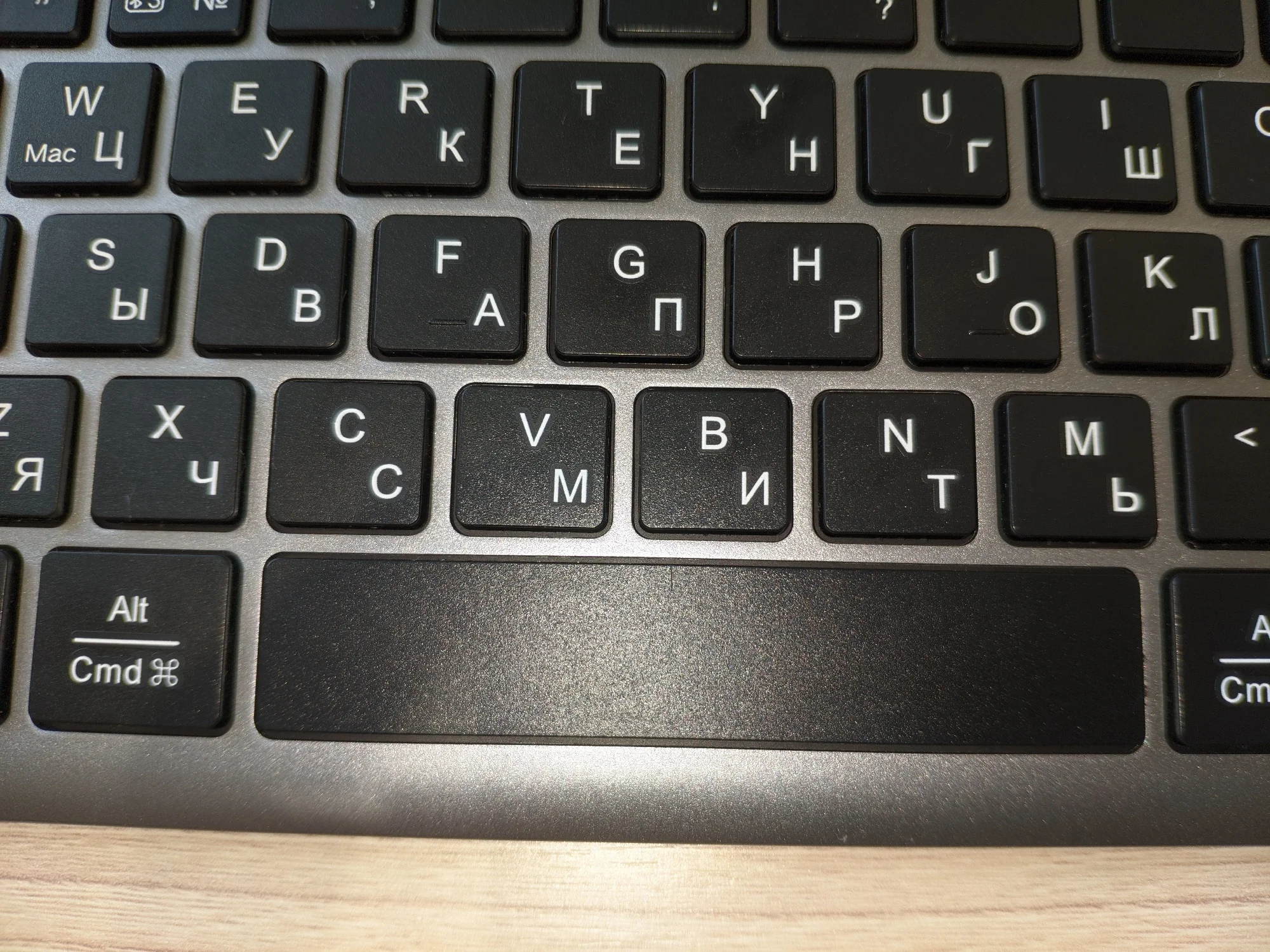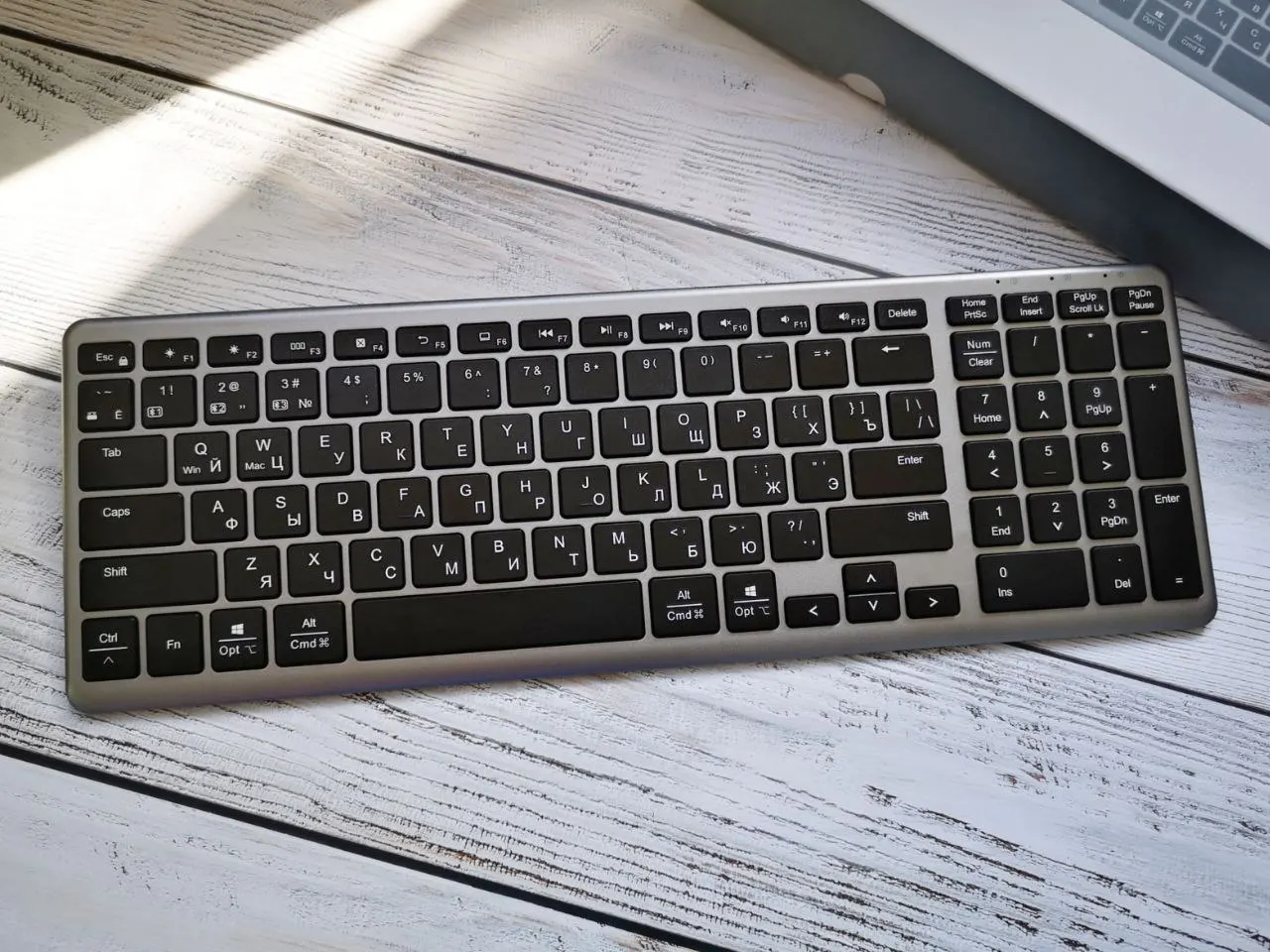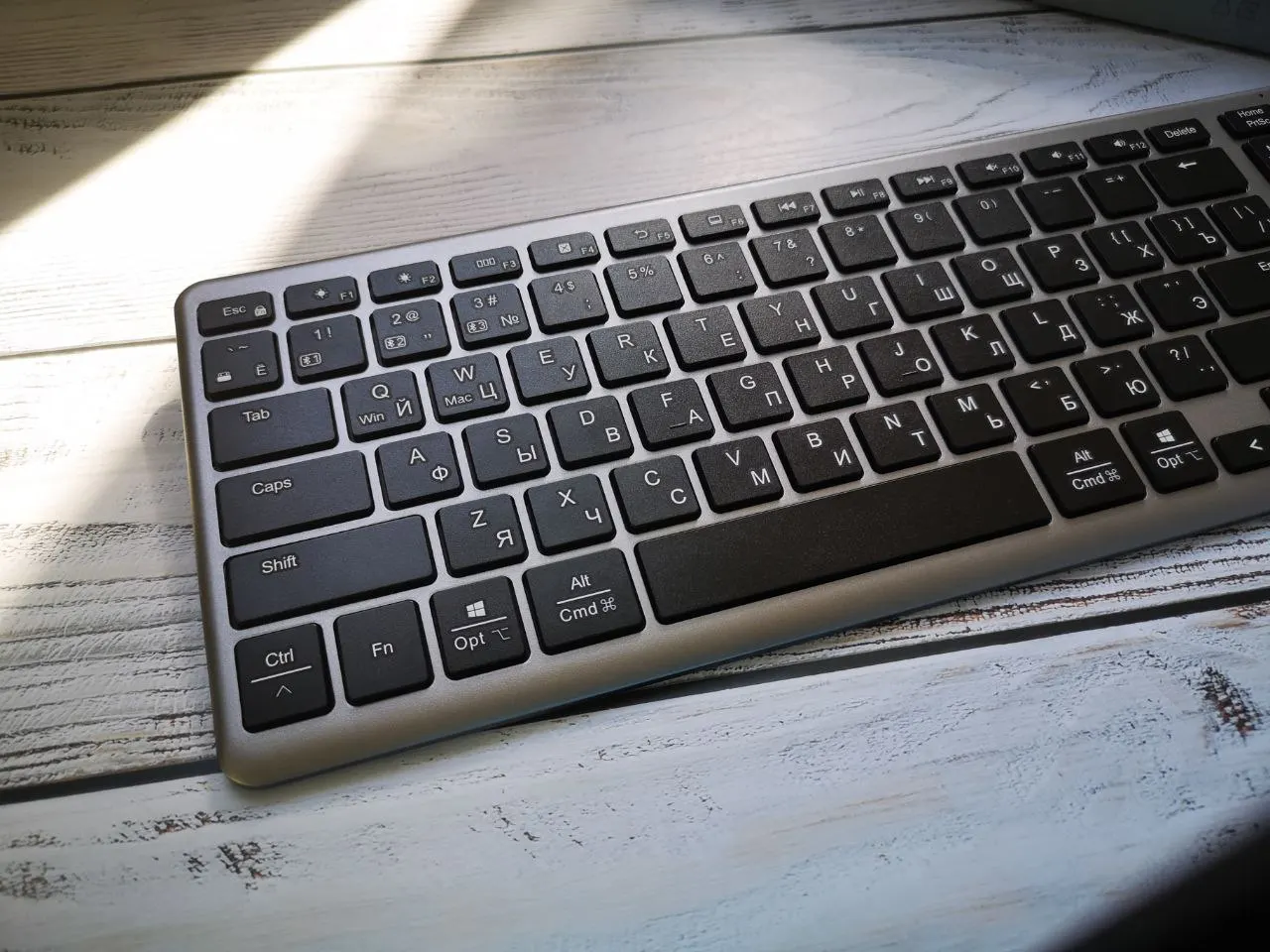 Клавиатура мембранная. Качественная, тонкая (7.1мм), компактная и имеет приятный дизайн. Внутри клавиатуры имеется металлический утяжелитель. Клавиши «ноутбучные», плоские, низкие. Всего их 99. Ход плавный, мягкий, с низким уровнем шума. Пробел ровный, при нажатии на край не заваливается. Подсветка здесь не предусмотрена. Кейкапы с русской раскладкой, символы напечатаны хорошо - использована шелкография (трафаретная печать) с УФ-покрытием. Расположение клавиш мне понравилось, удобное. В правом верхнем углу есть 3 светодиодных индикатора - для CapsLock, Scroll Lock и уровня заряда батареи. Батарейка здесь на 400мАч. Серебристая часть корпуса и задняя сторона похоже крашеный пластик. Снизу есть силиконовые антискользящие ножки. Выступ сзади обеспечивает наклон клавиатуры на 6°. На нём же есть переключатель ВКЛ/ВЫКЛ, разъём USB-C для зарядки и USB-приемник 2.4G сбоку. Гнездо приёмника с магнитом, что очень удобно. 👍