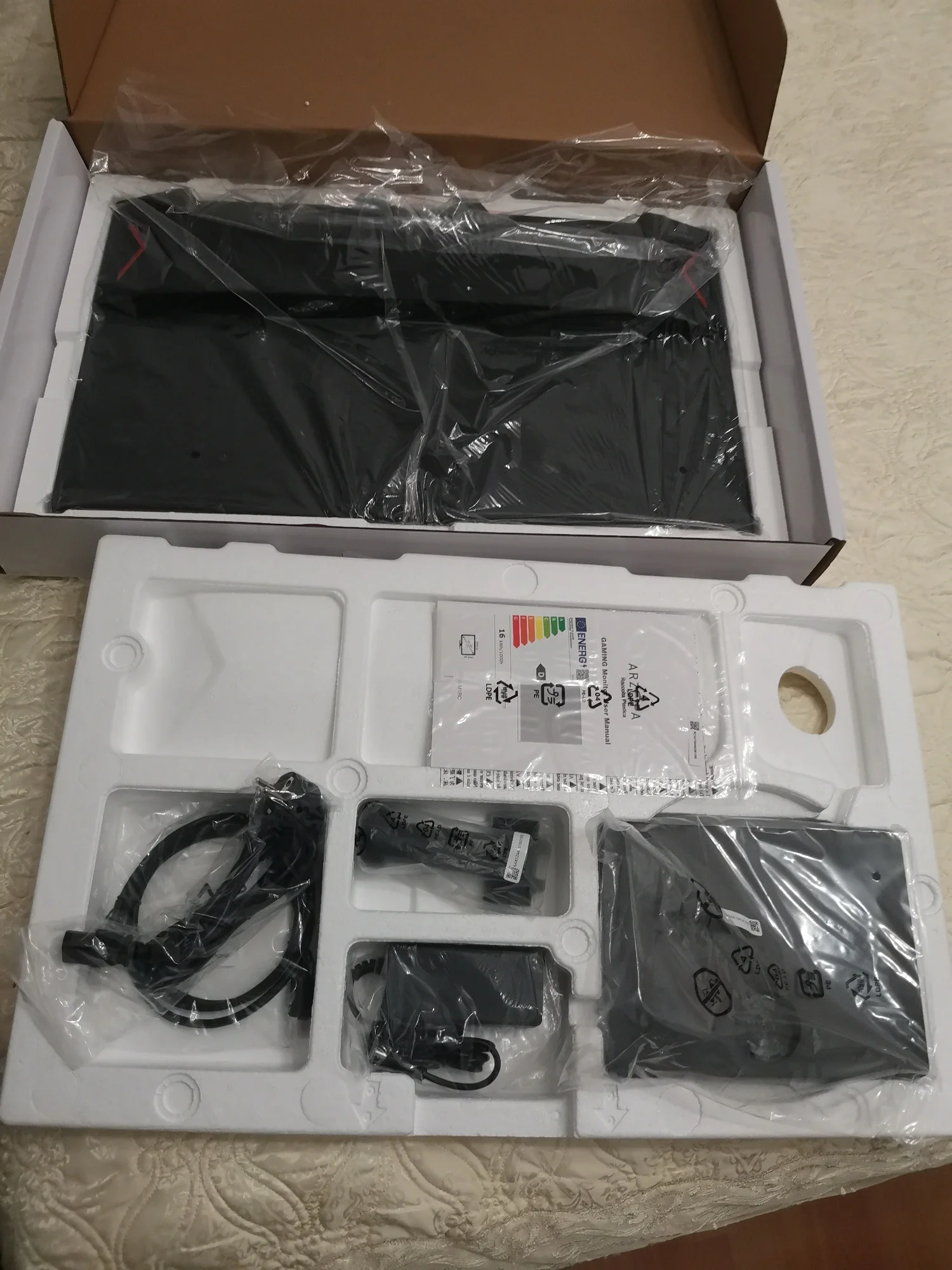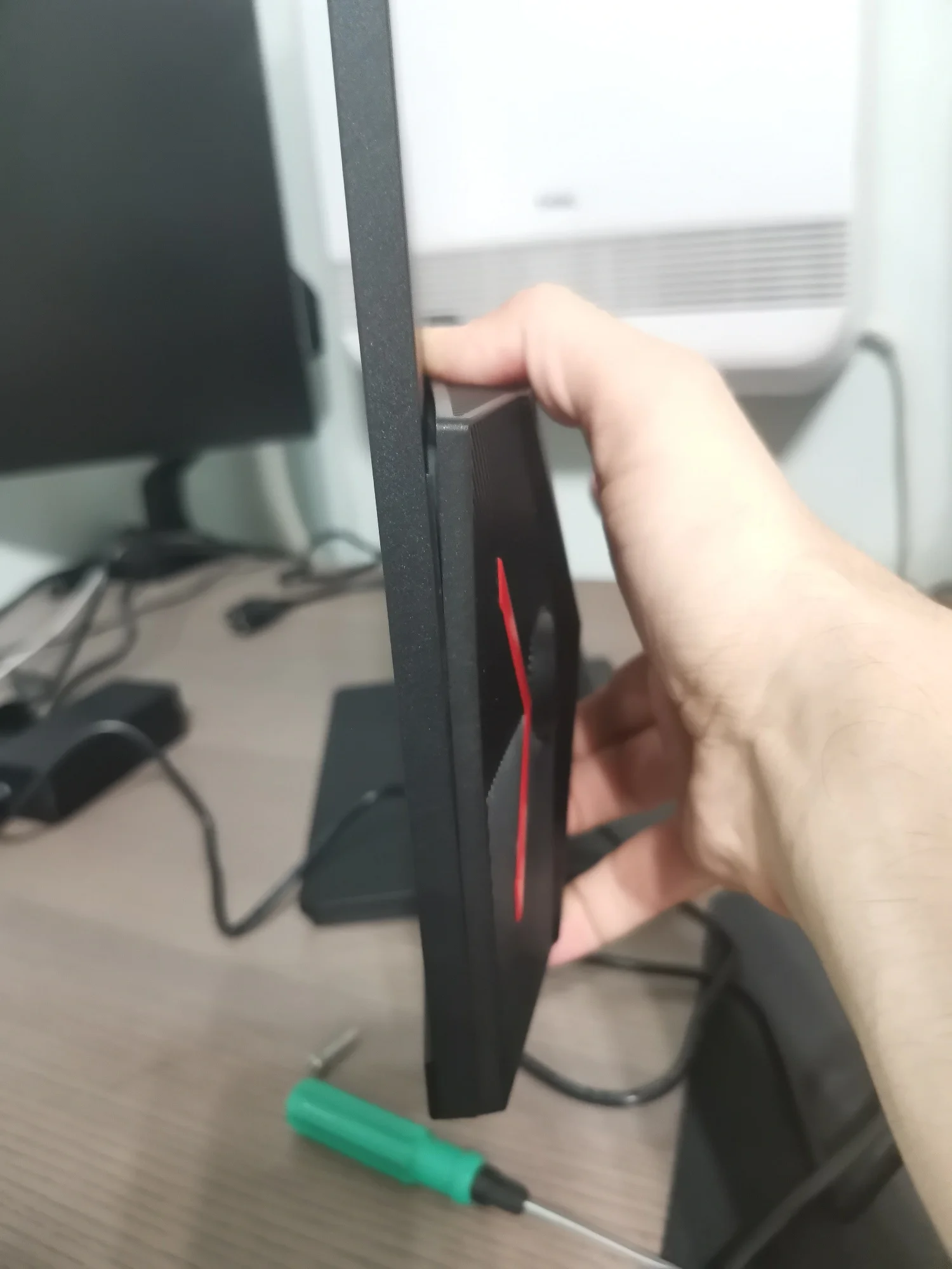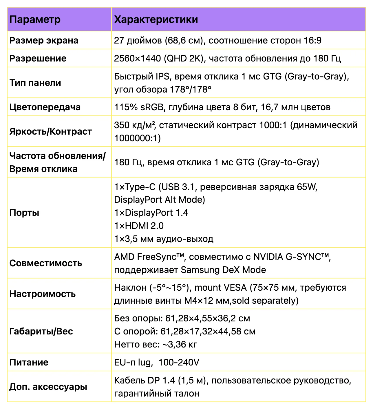 заказал доставку курьером, всё нормально чёткий экран, хорошие цвета яркость тоже на уровне в основном пользовался 50% яркостью, есть особенность кривоватого перевода меню на русский, но т.к. настраивается 1 раз, то некритично, по итогу можно разобраться. Есть неудобстао, что нет горячие переключения режимов изображение экрана, надо через меню менять. Заявленным параметрам соответствует 2к 180 гц, подвод от внешнего блока длинный, так что нет проблем спрятать под стол. так же из особенностей, не смотря на то, что есть крепление веса, то нормально закрепить на него, не получится в идеале, можно взять какие-то переходники пластиковые фиксаторы, чтобы упор не шёл на выпирающую часть, но это доставляет свои сложности, если используете стационарно на столе, то проблем нет никаких. Для эстетов будет минусом слишком низкое расположение портов из-за чего будет торчать подвода снизу монитора, но это минус если вы будете вешать на кронштейн, а т.к. тут с этими сложности, то и это вытекающий минус, так же в моём случае была люфт задней крышке, не плотно пользовалась, но если стоит на столе на родной ножке ни на что не влияет. В целом если оценивать саму картину то можно ставить 5, а вот за дизайн и продуманность конструкции 4. продавцов общительный и спокойный идёт на контакт, товар от отправителет со склада в Москве. Думаю монитор можно смело рекомендовать, не пожалеете, картинка действительно хорошая.