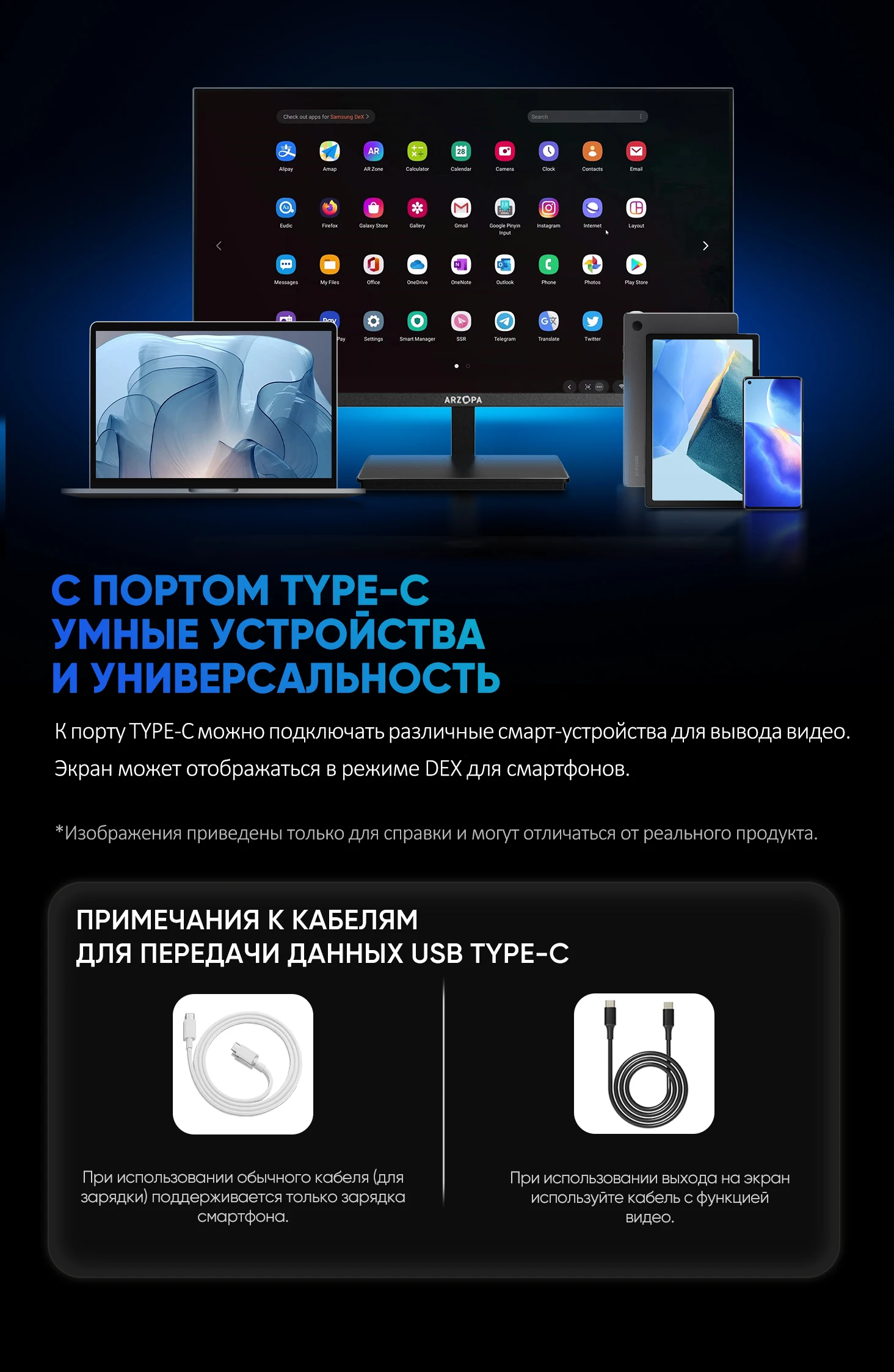 - Стандартный кабель Type-C только заряжает смартфон.Если требуется передача видео, необходимо использовать полнофункциональный кабель Type-C, поддерживающий Disc DisplayPort Alt Mode (рекомендуется_спецификация выше 10 Гбит/с).