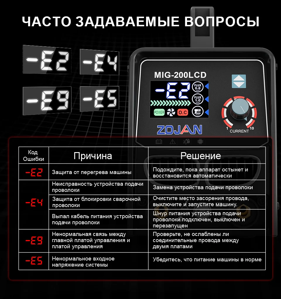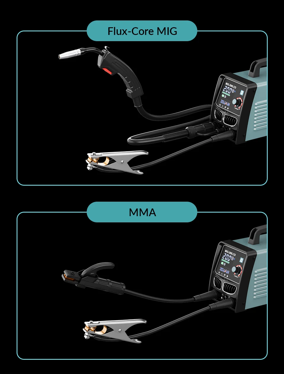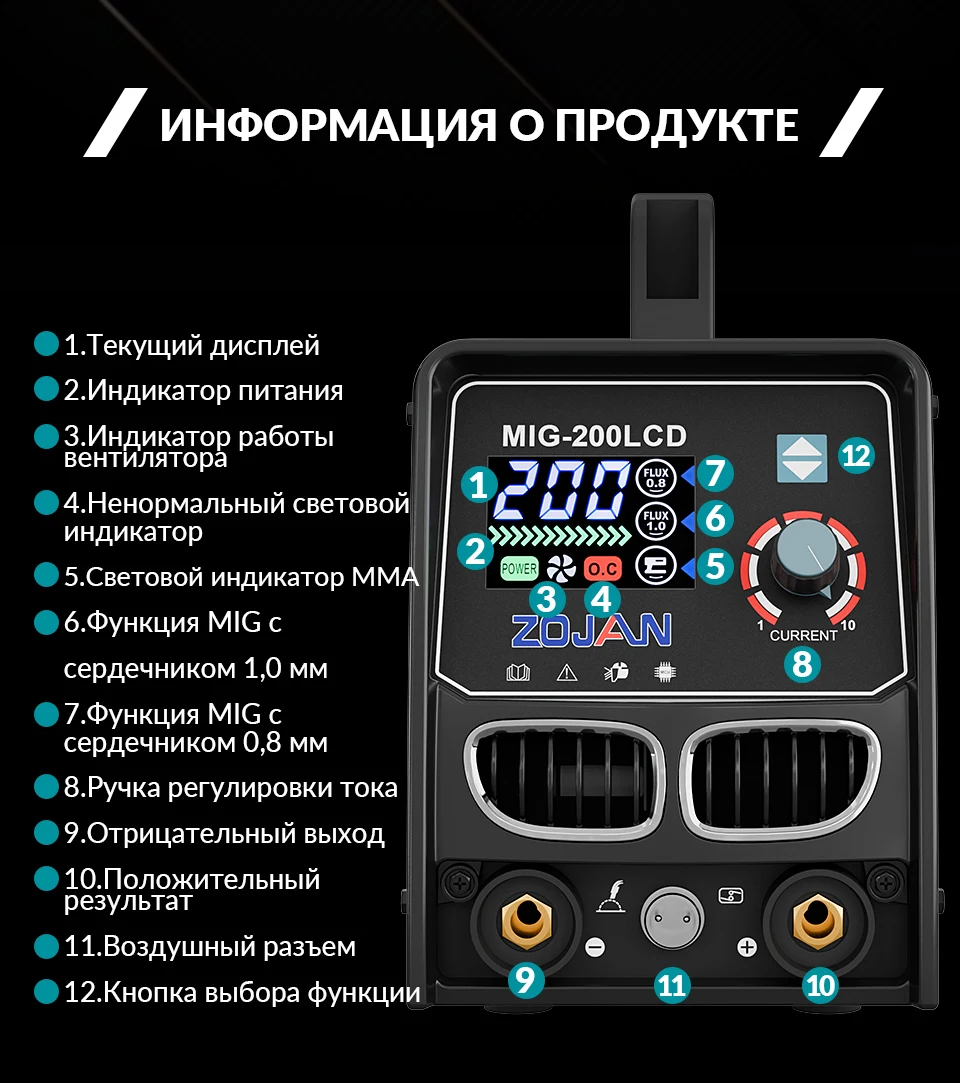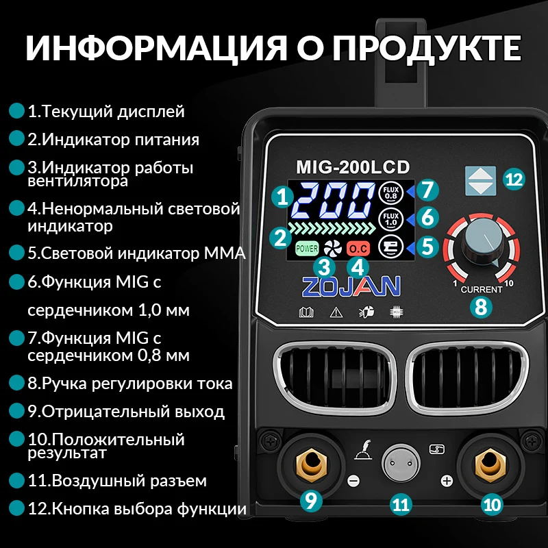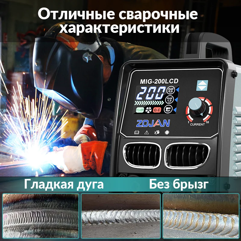 ZOJAN MIG-200LCD - это универсальный сварочный аппарат, поддерживающий сварку порошковой проволокой без газа (0,8/1,0 мм) и электродами (1,6-5,0 мм).