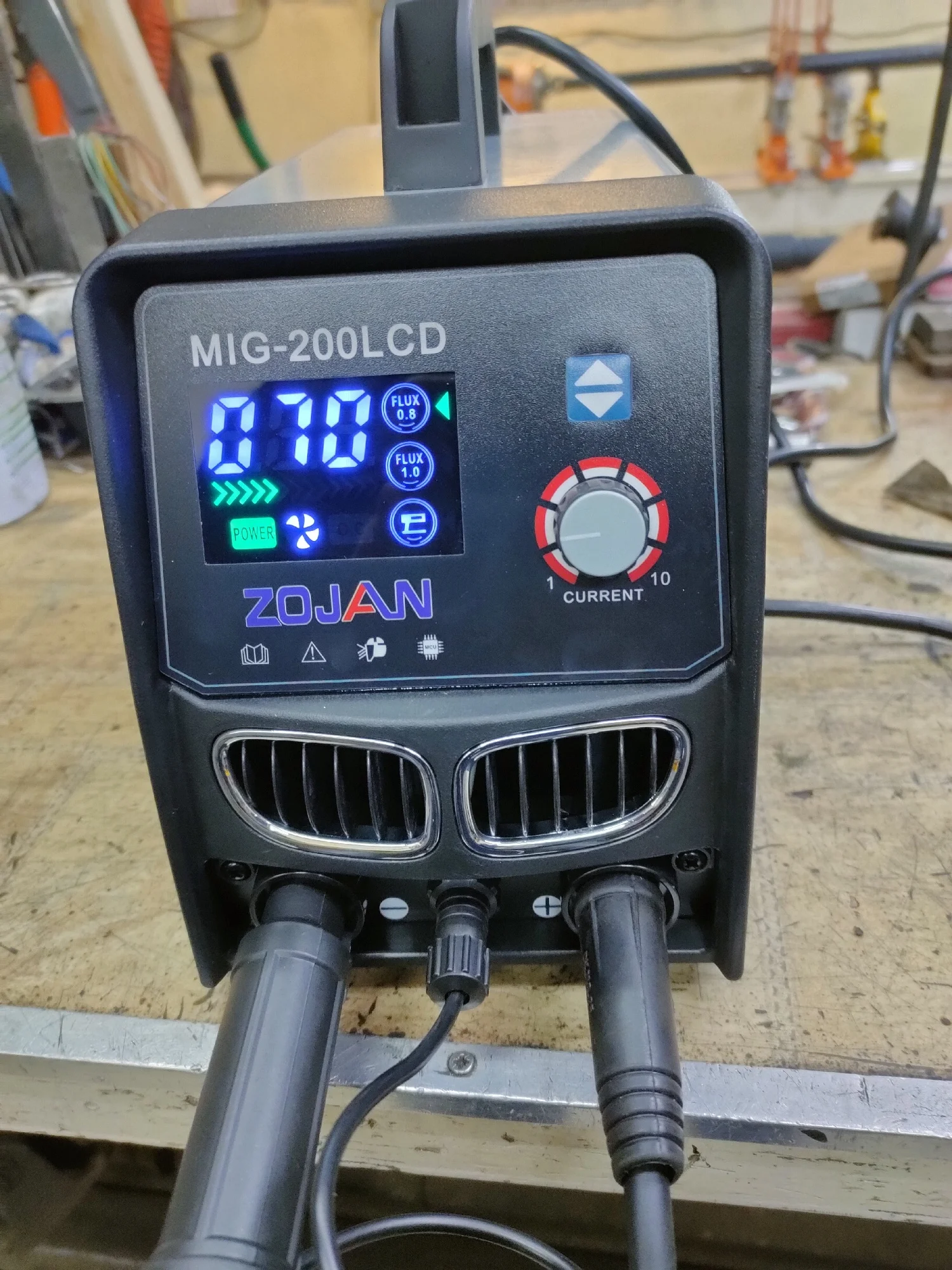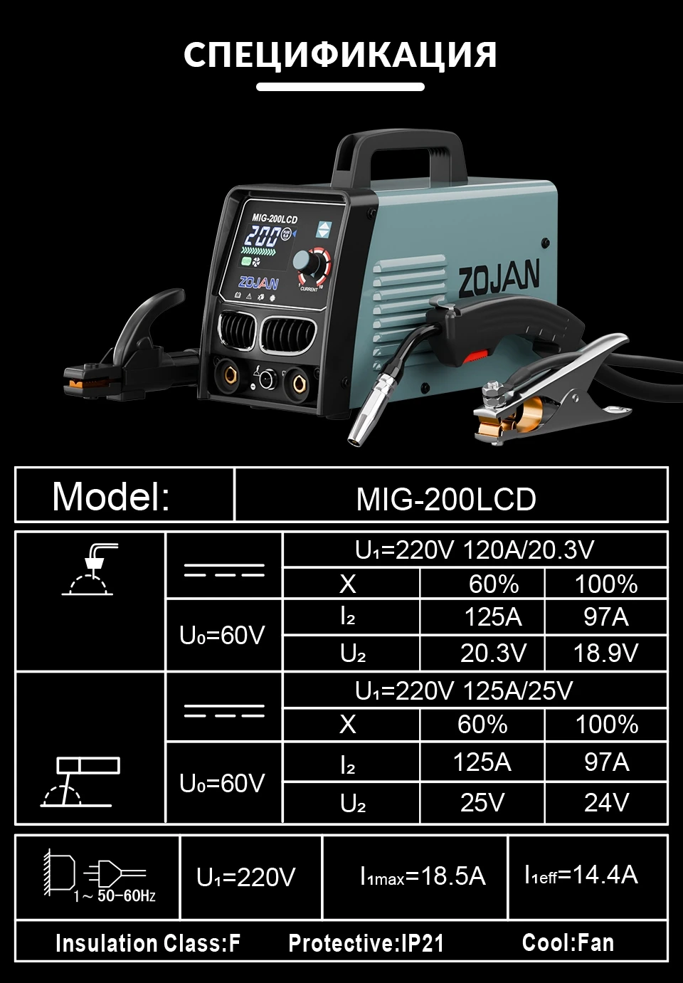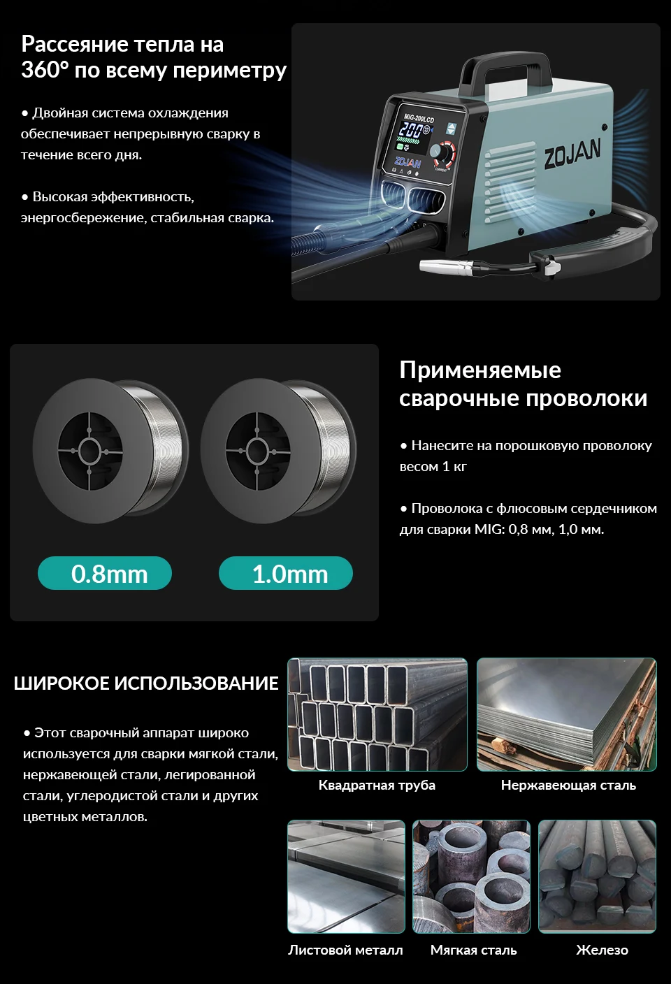 ZOJAN MIG-200LCD - это универсальный сварочный аппарат, поддерживающий сварку порошковой проволокой без газа (0,8/1,0 мм) и электродами (1,6-5,0 мм).