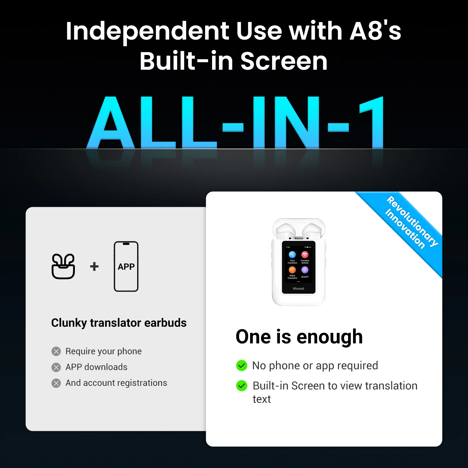 A8 сочетает в себе преимущества устройства перевода и наушников для перевода, предлагая онлайн-перевод на 144 языка и 16 автономных языковых пакетов.Это инновационно и удобно, отрываясь от традиционных методов перевода.