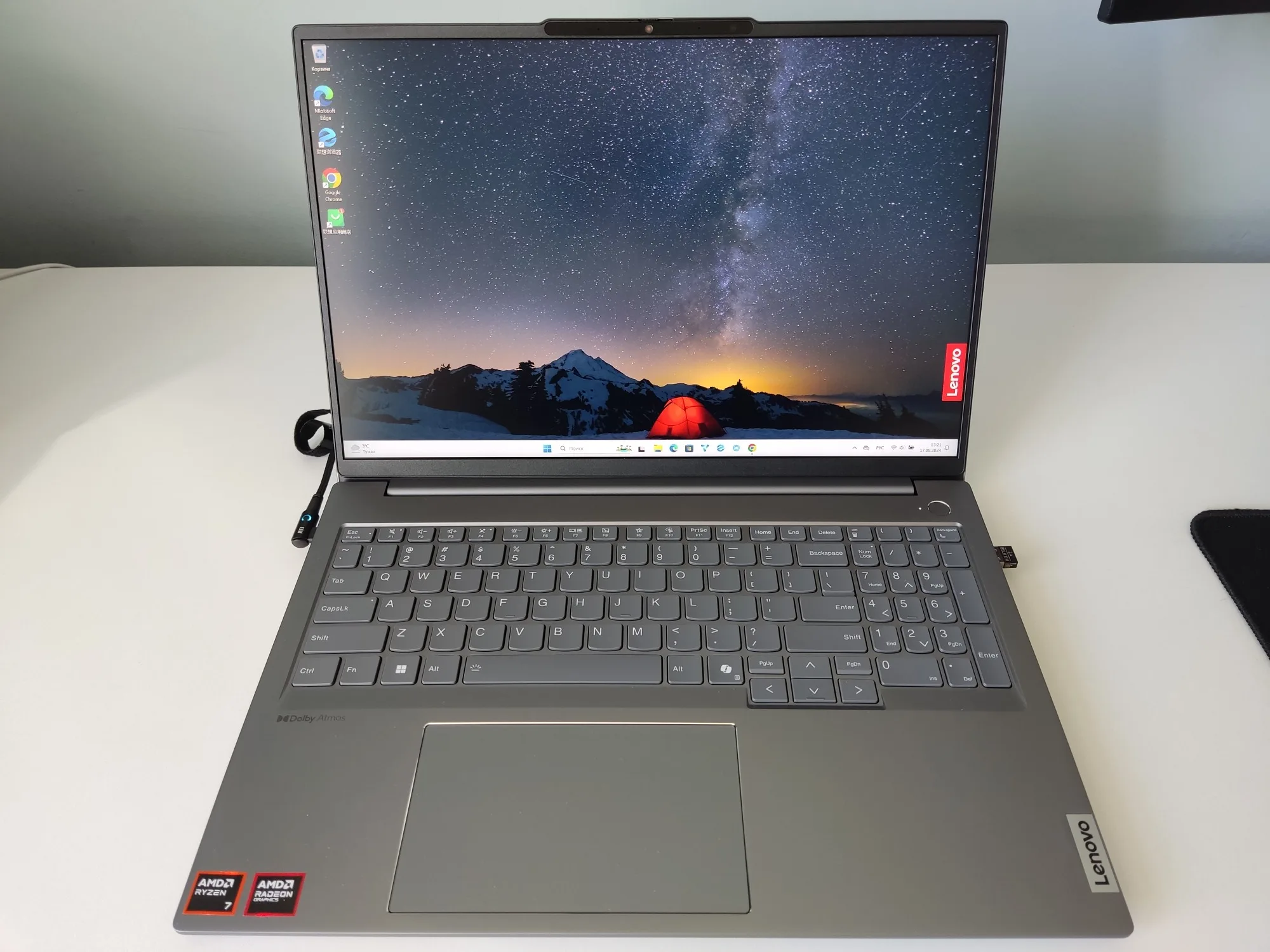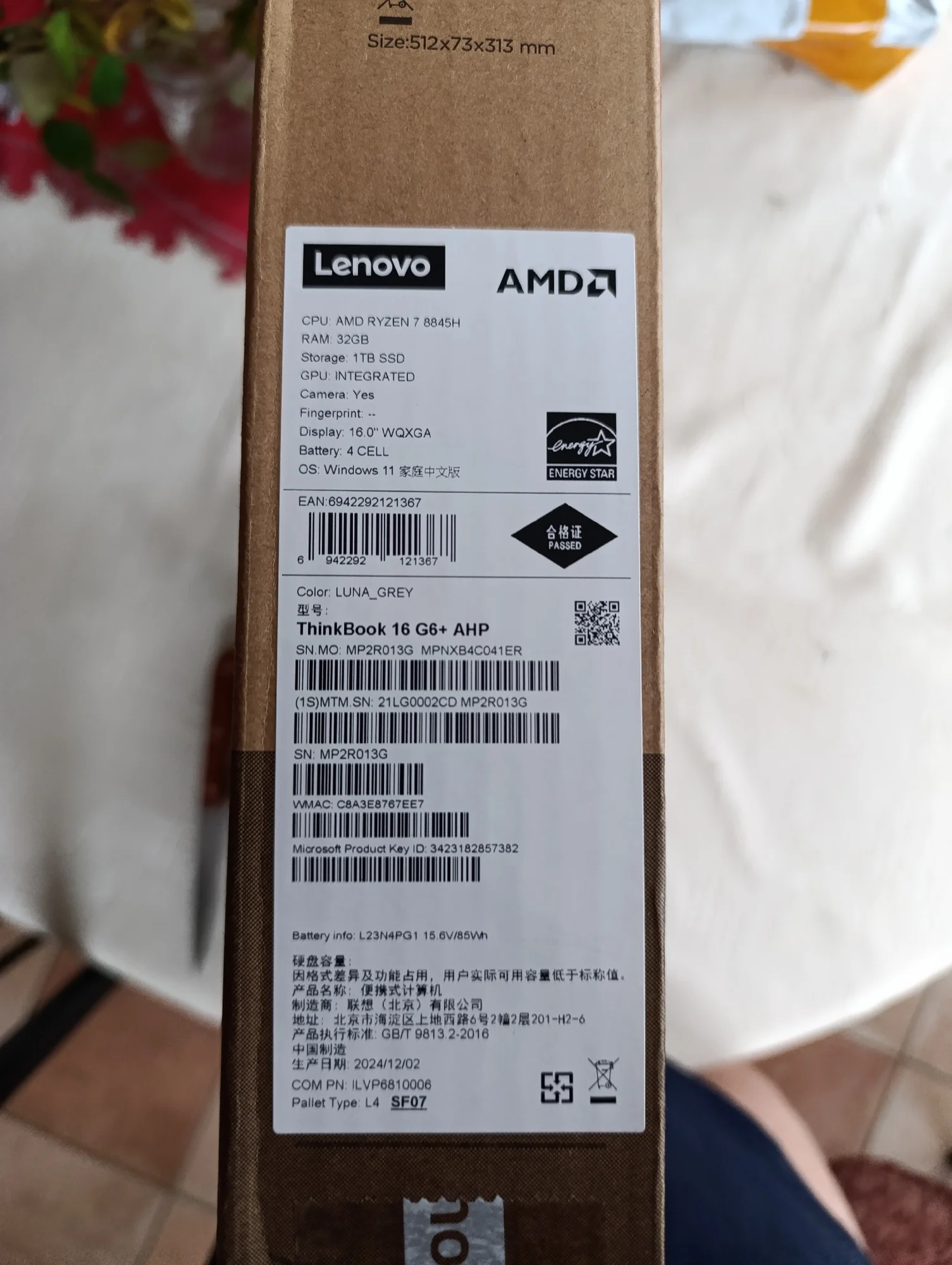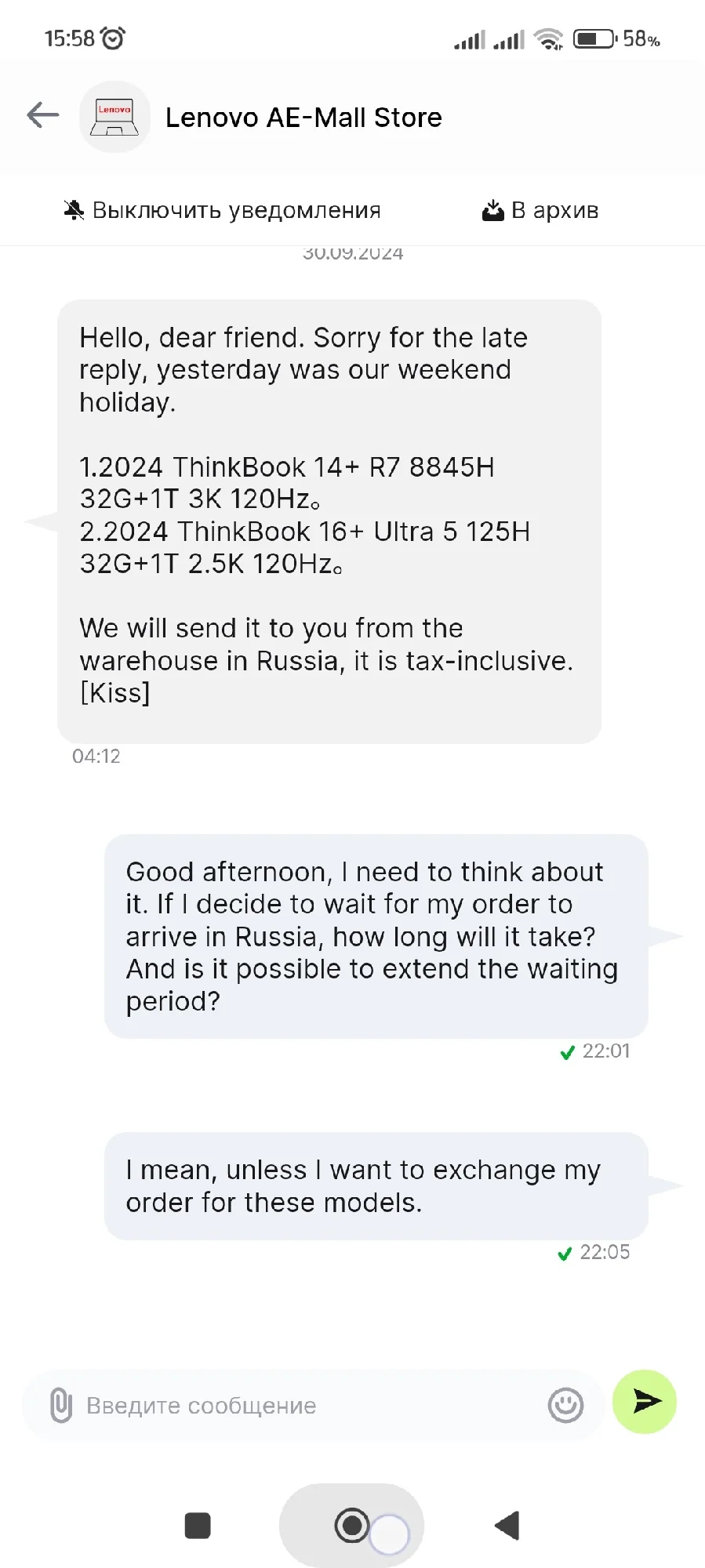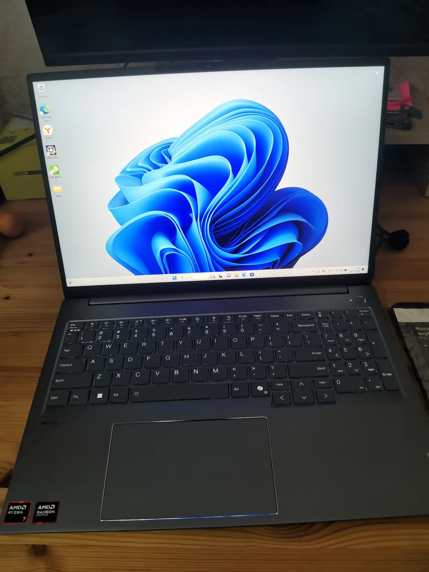Заказал 20 августа. Трек на али появился 22 августа. Отслеживал на 17Track. 10.09 прибыл в Москву. 12.09 передан СДЭК. 16.09 посылку привез курьер СДЭК. Ноутбук новый. Серийный номер совпадает на коробке, ноутбуке и BIOS. Продавец дополнительно положил мышку, коврик, переходник для зарядного и наклейки на клавиатуру. SSD установлен от YMTC. Наработка 14 ч. На сайте Lenovo по серийному номеру можно проверить гарантию, скачать BIOS и драйвера. Установлена китайская Windows 11 22H2 Home. Ключ от Office Home and Student 2021 приходит на почту после привязки учетной записи. Ноутбук работает от зарядки Ugreen CD226 100W. Продавца можно рекомендовать.Анна С. 17 сентября 2024
