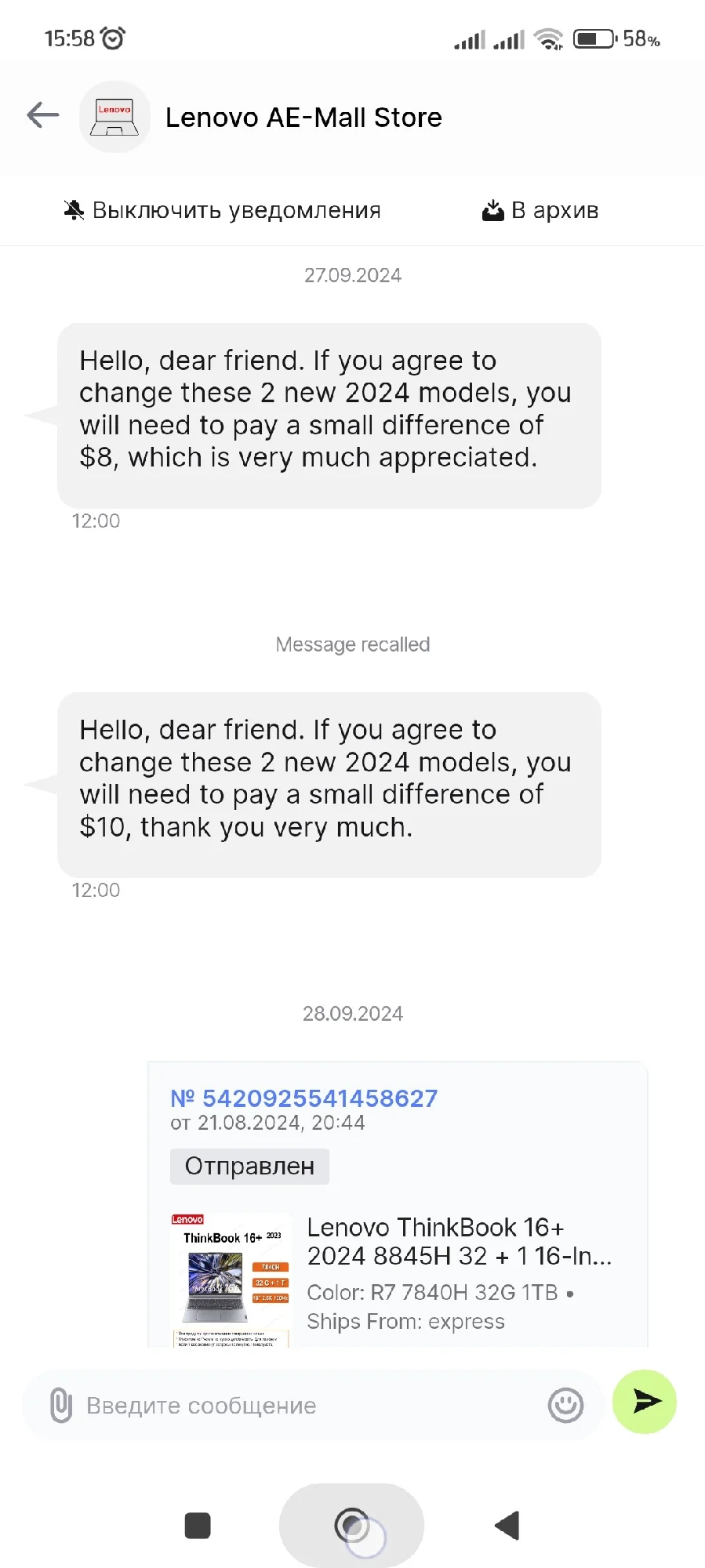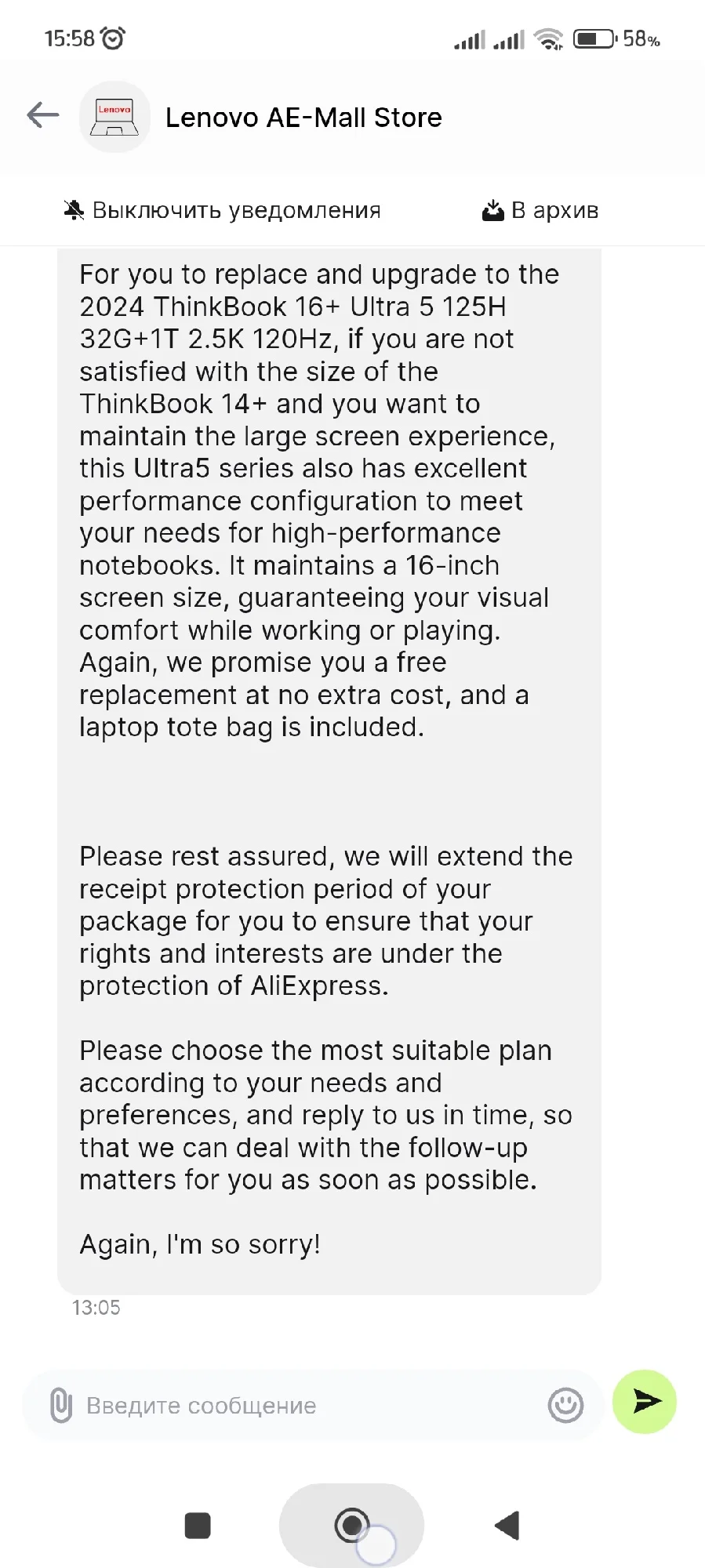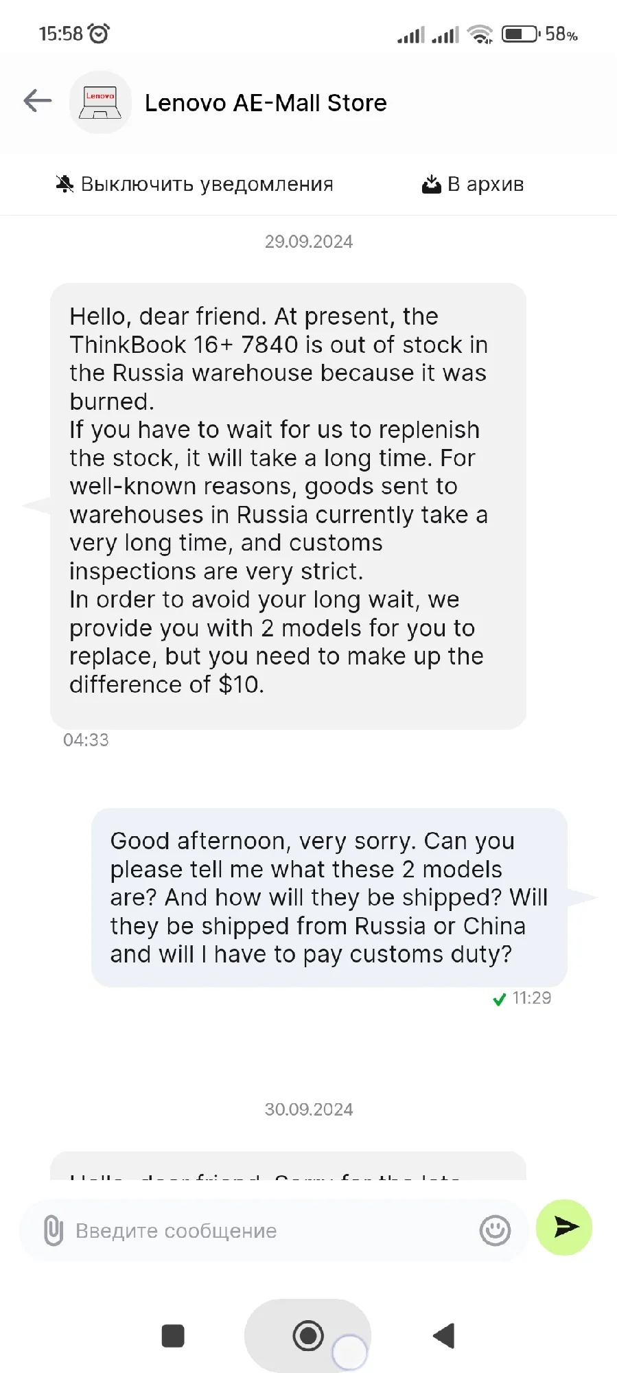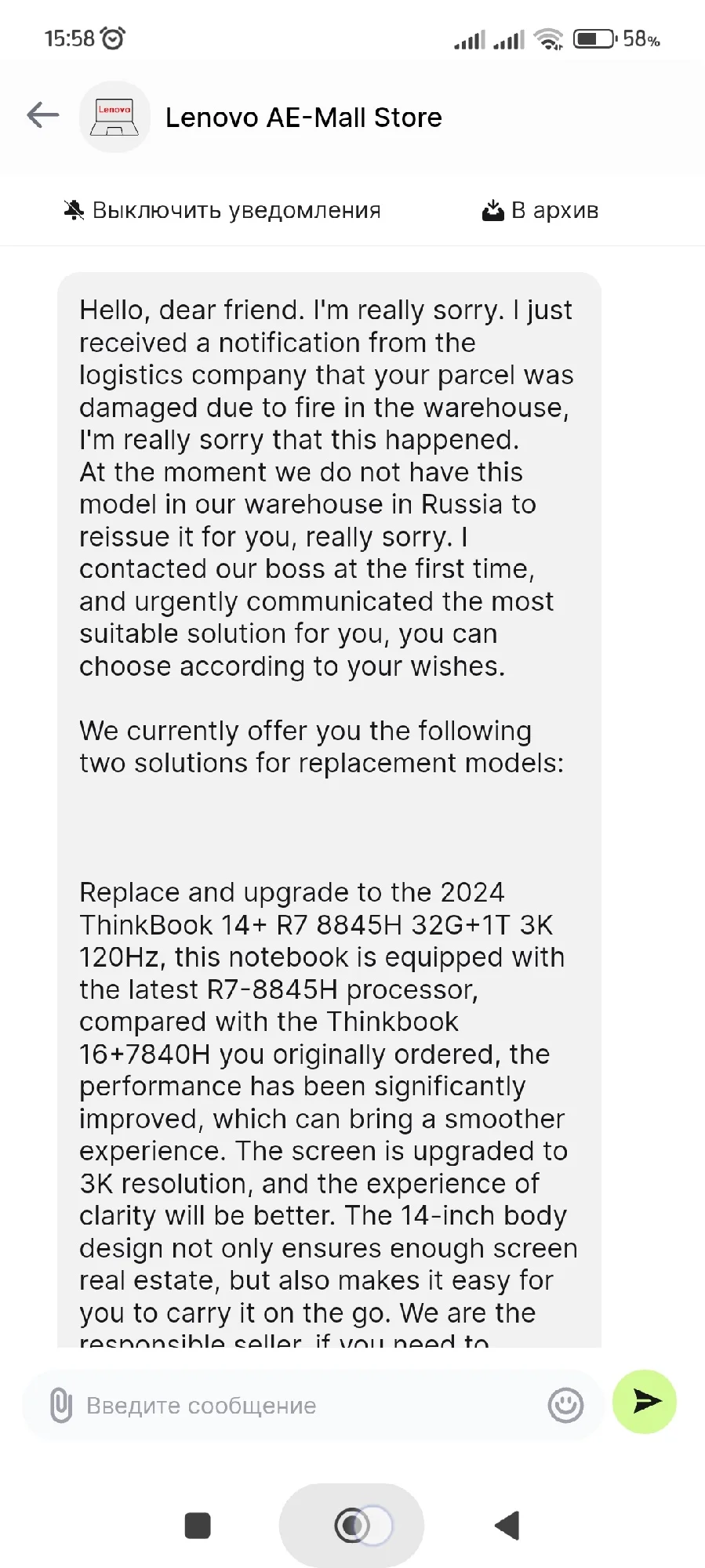 Заказал 20 августа. Трек на али появился 22 августа. Отслеживал на 17Track. 10.09 прибыл в Москву. 12.09 передан СДЭК. 16.09 посылку привез курьер СДЭК. Ноутбук новый. Серийный номер совпадает на коробке, ноутбуке и BIOS. Продавец дополнительно положил мышку, коврик, переходник для зарядного и наклейки на клавиатуру. SSD установлен от YMTC. Наработка 14 ч. На сайте Lenovo по серийному номеру можно проверить гарантию, скачать BIOS и драйвера. Установлена китайская Windows 11 22H2 Home. Ключ от Office Home and Student 2021 приходит на почту после привязки учетной записи. Ноутбук работает от зарядки Ugreen CD226 100W. Продавца можно рекомендовать.Анна С. 17 сентября 2024