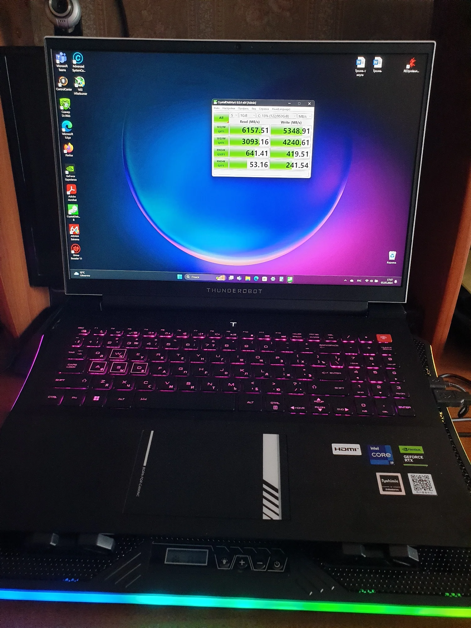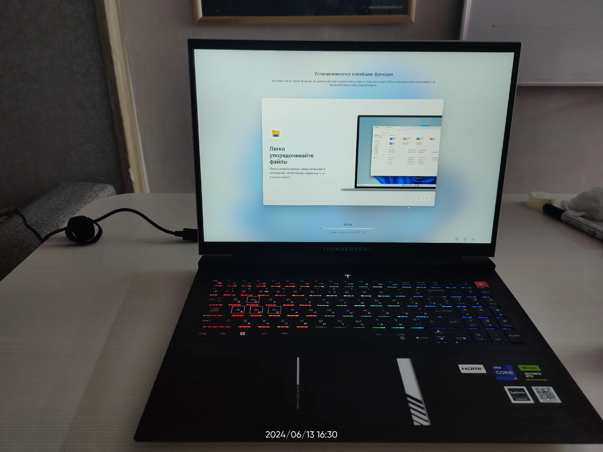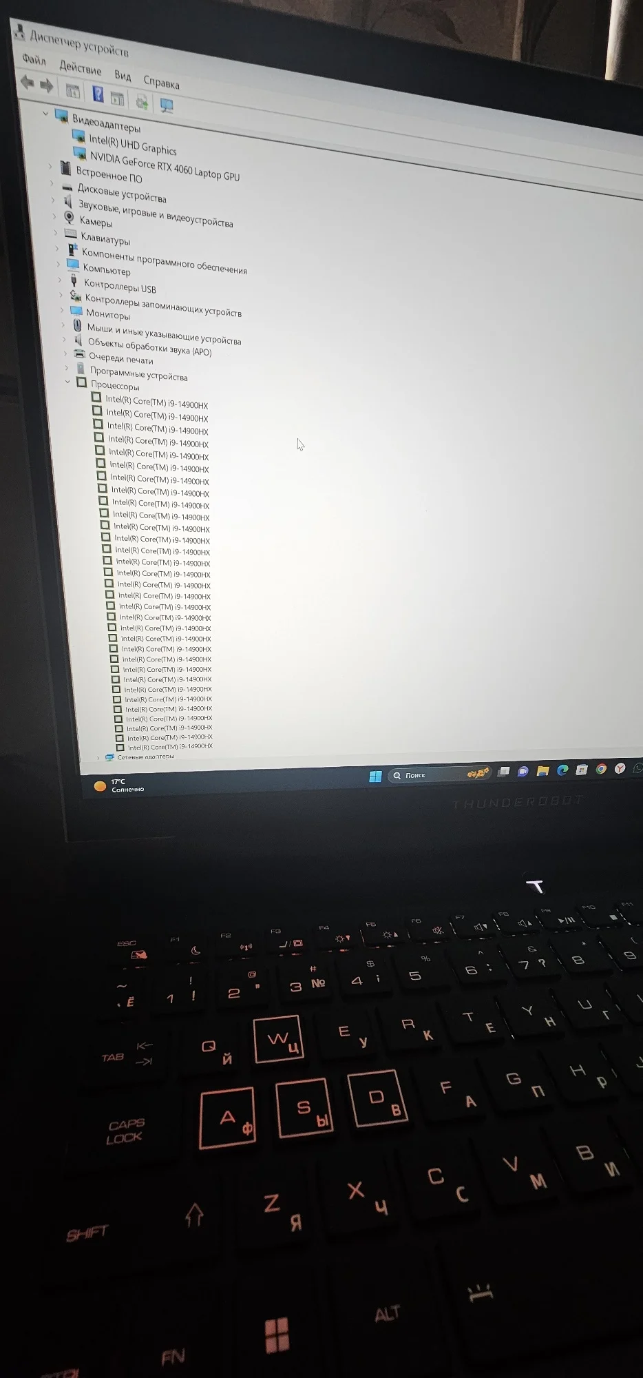 Заказ пришел за 4 дня. Доставкой очень доволен. На ноуте уже стояла русская Windows 11, активированная, плюс установлены драйверы и MS Office. Так что дополнительно ничего скачивать не пришлось. Через центр обновления скачалась актуальная версия 23H2. На клавиатуре уже нанесены русские буквы, без всяких наклеек. Начинка (Процессор, Оперативная память, Видеокарта и SSD) соответствует описанию. i9- 14900HX, 32 Gb оперативы, 1 Tb SSD, RTX 4060, брал на распродаже за 132.000р. Выгоднее по цене нигде найти не смог. В магазинах такой стоит больше 200к+ с худшими показателями оперативки и меньшим SSD. Так что берите, советую. По тестам в играх: Заметил, что процессор сбрасывает свой TDP со 100Ватт до 60 и соответственно падают частоты с 5.2 до 3.6, но это как я,понял проблема большинства ноутбуков. Тут только сторонние программы помогут вроде ThrottleStop где можно фиксировать TDP. Охлаждение у ноута отличное, Температура выше 75 не поднималась в нагрузках. Вентиляторы,в меру шумные, но в наушниках этого не слышно. Экран без засветов. Корпус полностью металлический. Цвет Корпуса со стороны дисплея белый, а клавиатура черная с подсветкой.