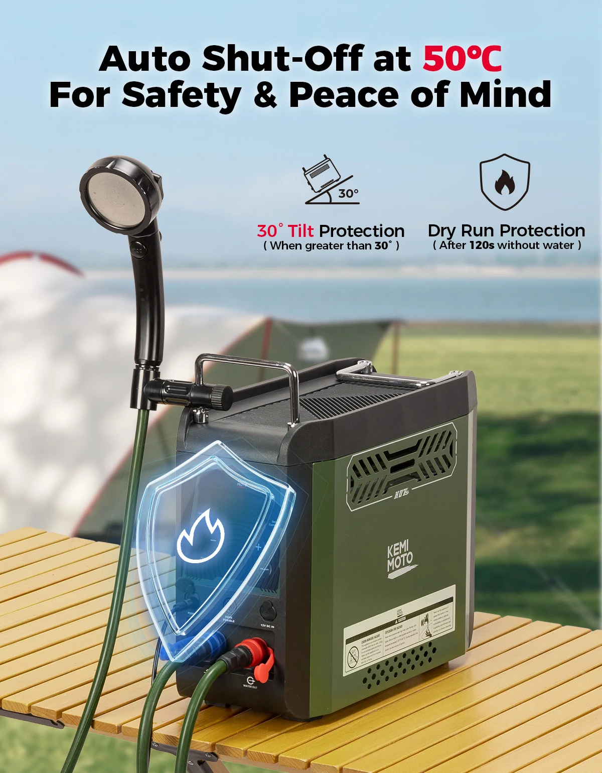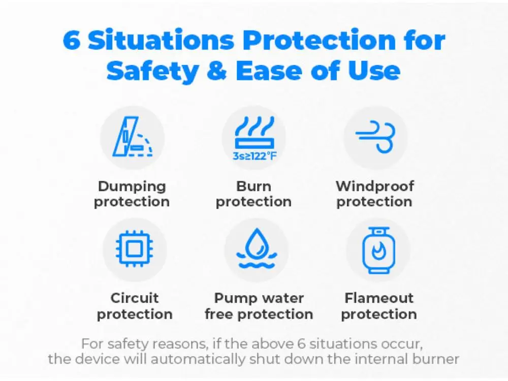 Защита от сброса, защита от ожогов, защита от ветра, защита цепи, защита от воды насоса, защита от возгорания.В целях безопасности, если возникнут вышеуказанные 6 ситуаций, устройство автоматически отключит внутреннюю горелку.Когда температура воды достигает 50 , походный водонагреватель автоматически отключит воду и выключит пламя.