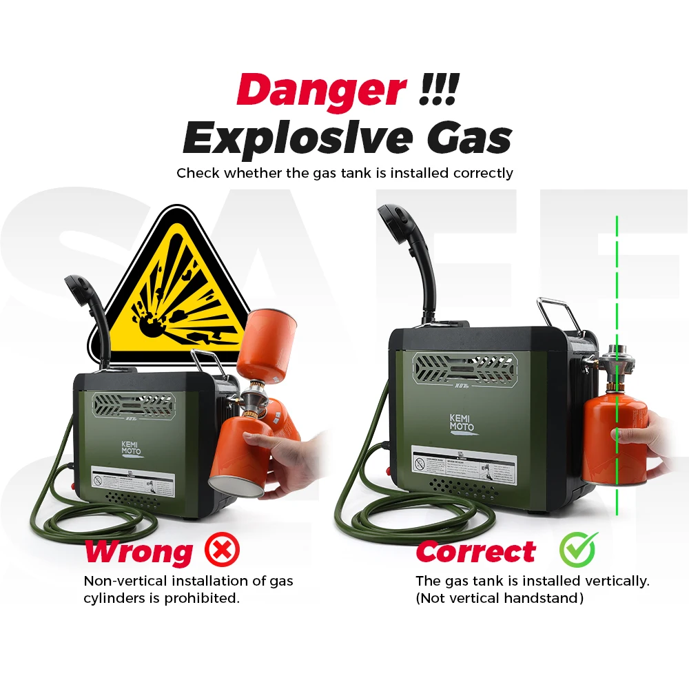 При использовании этого водонагревателя убедитесь, что газовый баллон расположен вертикально.Не устанавливайте горизонтально или не под рукой; это очень опасно и легко может вызвать взрыв.